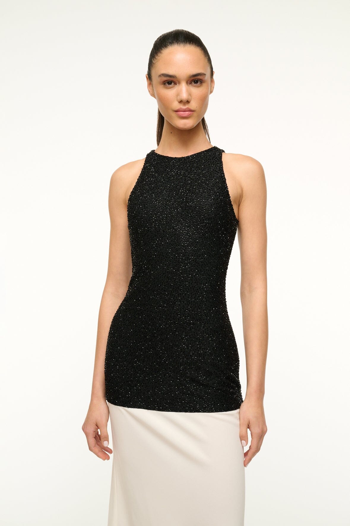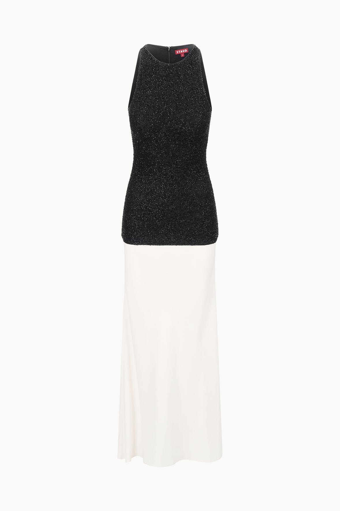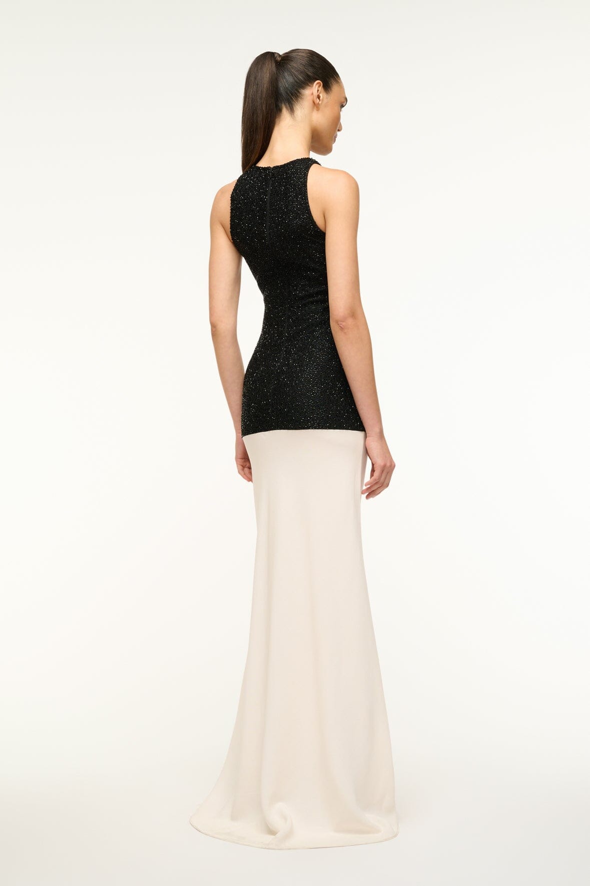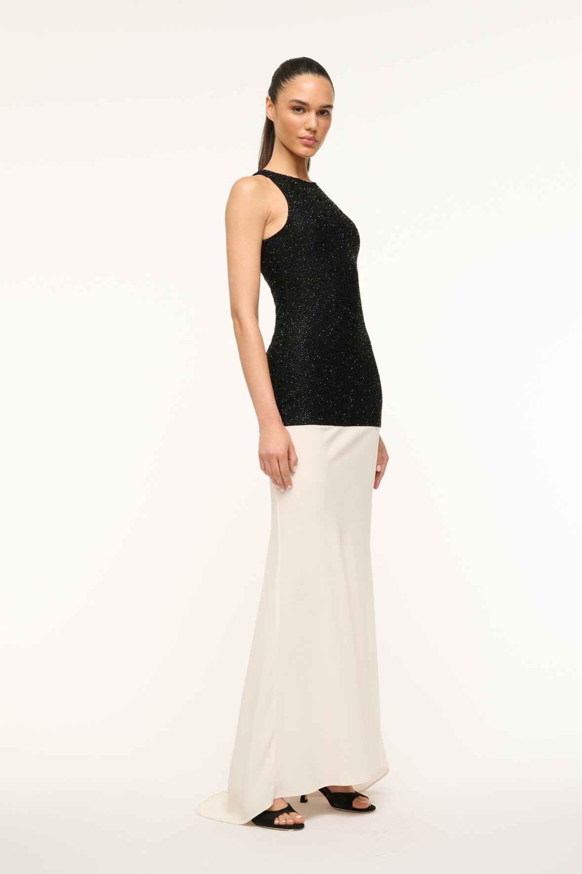 A drop-waist gown in mixed materials, the Gabrielle Dress features a fully hand-beaded bodice with contrast crepe skirt. This style has a hidden zipper closure at the back.