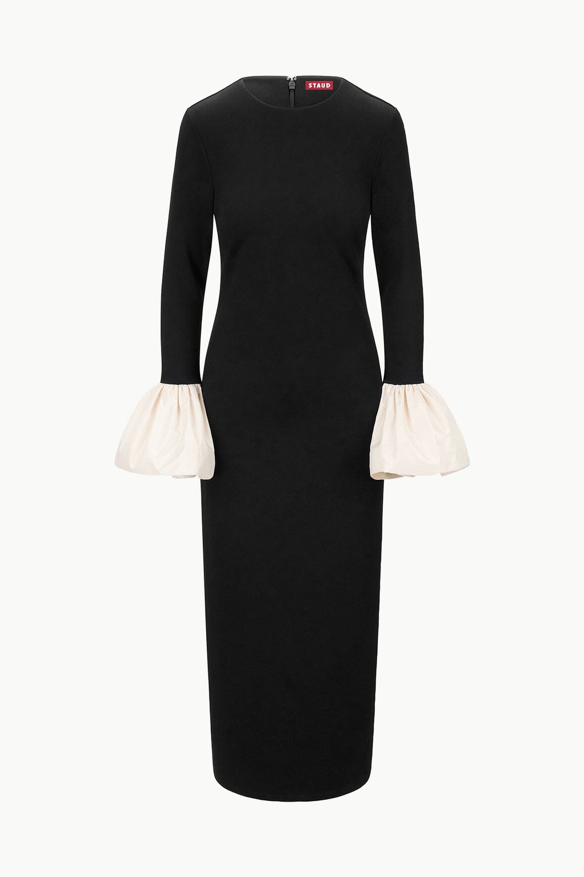 The Hawthorne Maxi is a boatneck cocktail dress made from our comfortable ponte fabric. It features voluminous ivory taffeta cuffs for a playful occasion look.