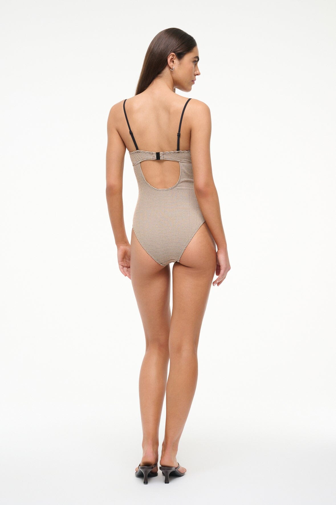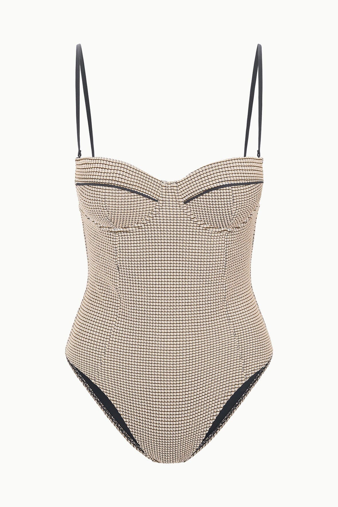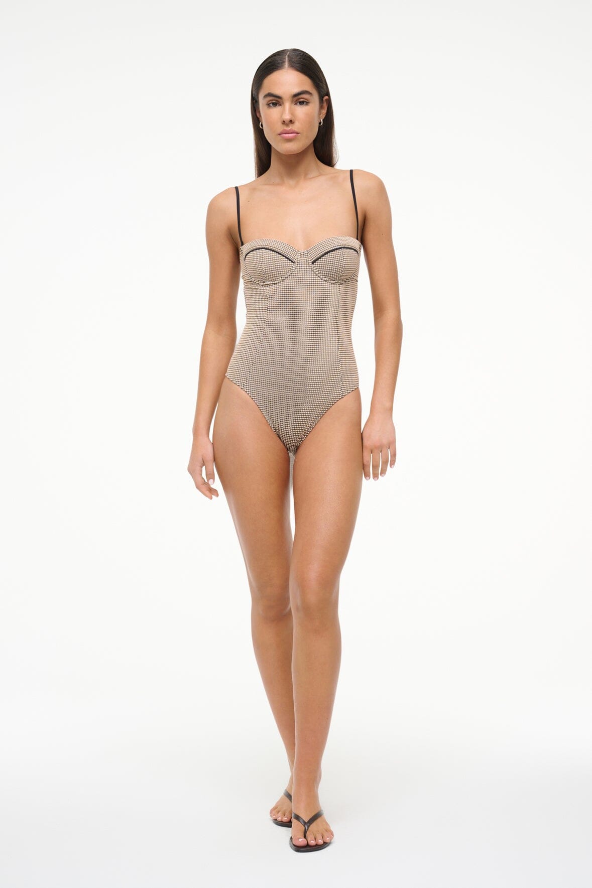 The Maeve One Piece features a bustier inspired bodice with a contrast trim at the bust. This style has removable spaghetti straps and a low back.