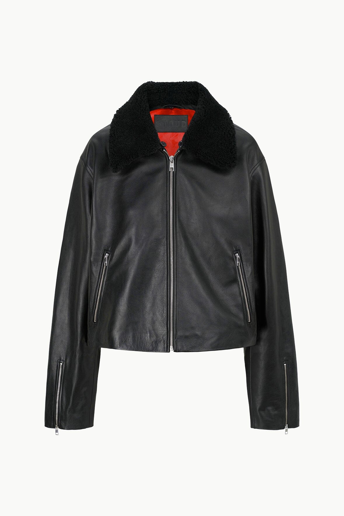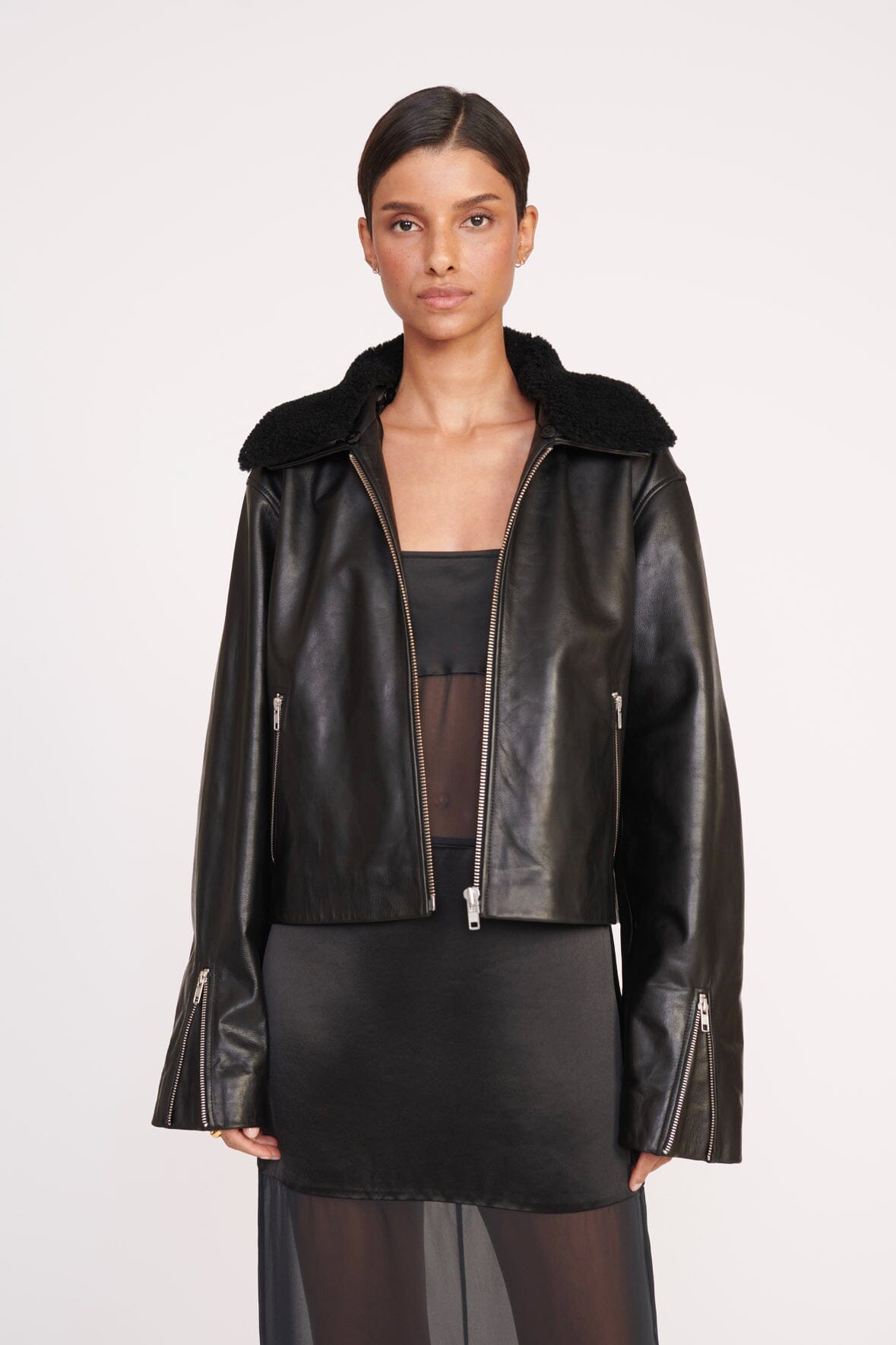 This style is a calf skin leather jacket with removable shearling collar. The Lenora Jacket features a cropped boxy fit and side zipper pocket details.