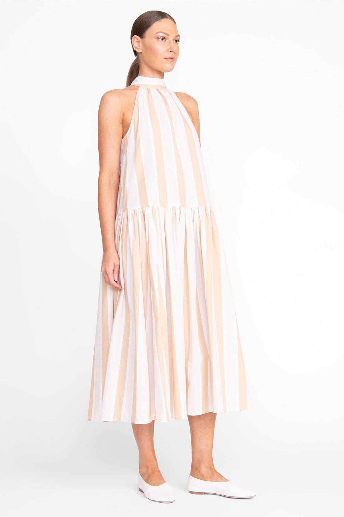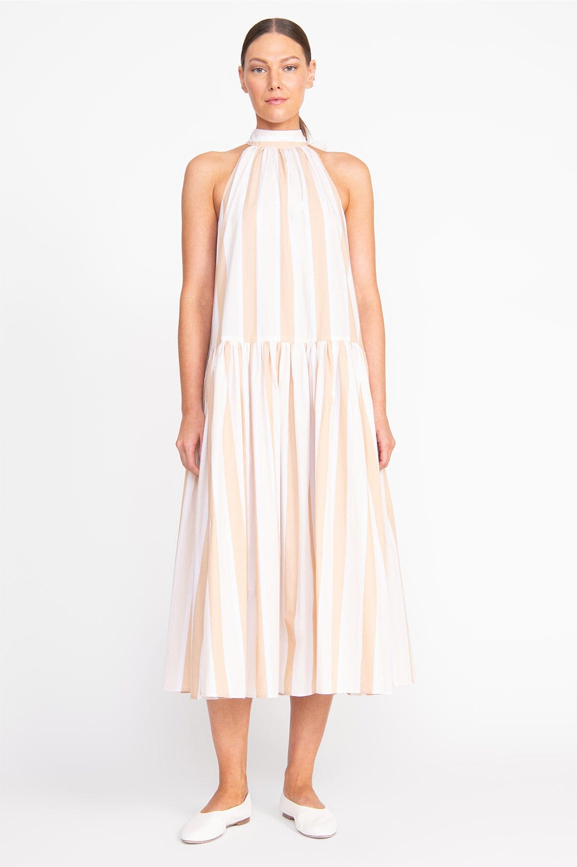 Both casual and elegant, the Midi Marlowe is a midi-length cotton poplin update to our best selling mini. This style features a halter neck with tie at the back and elongated ruffle tier.