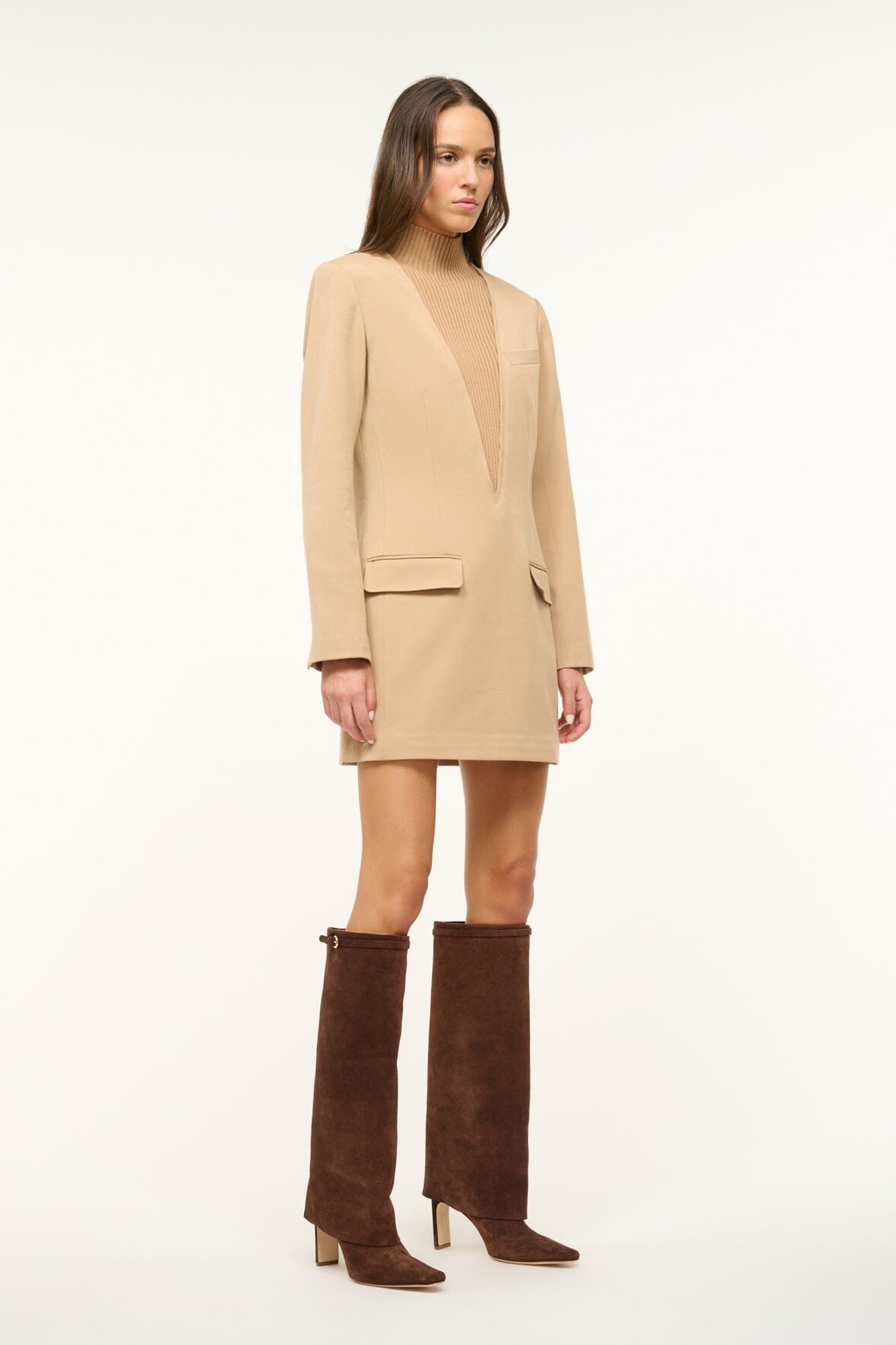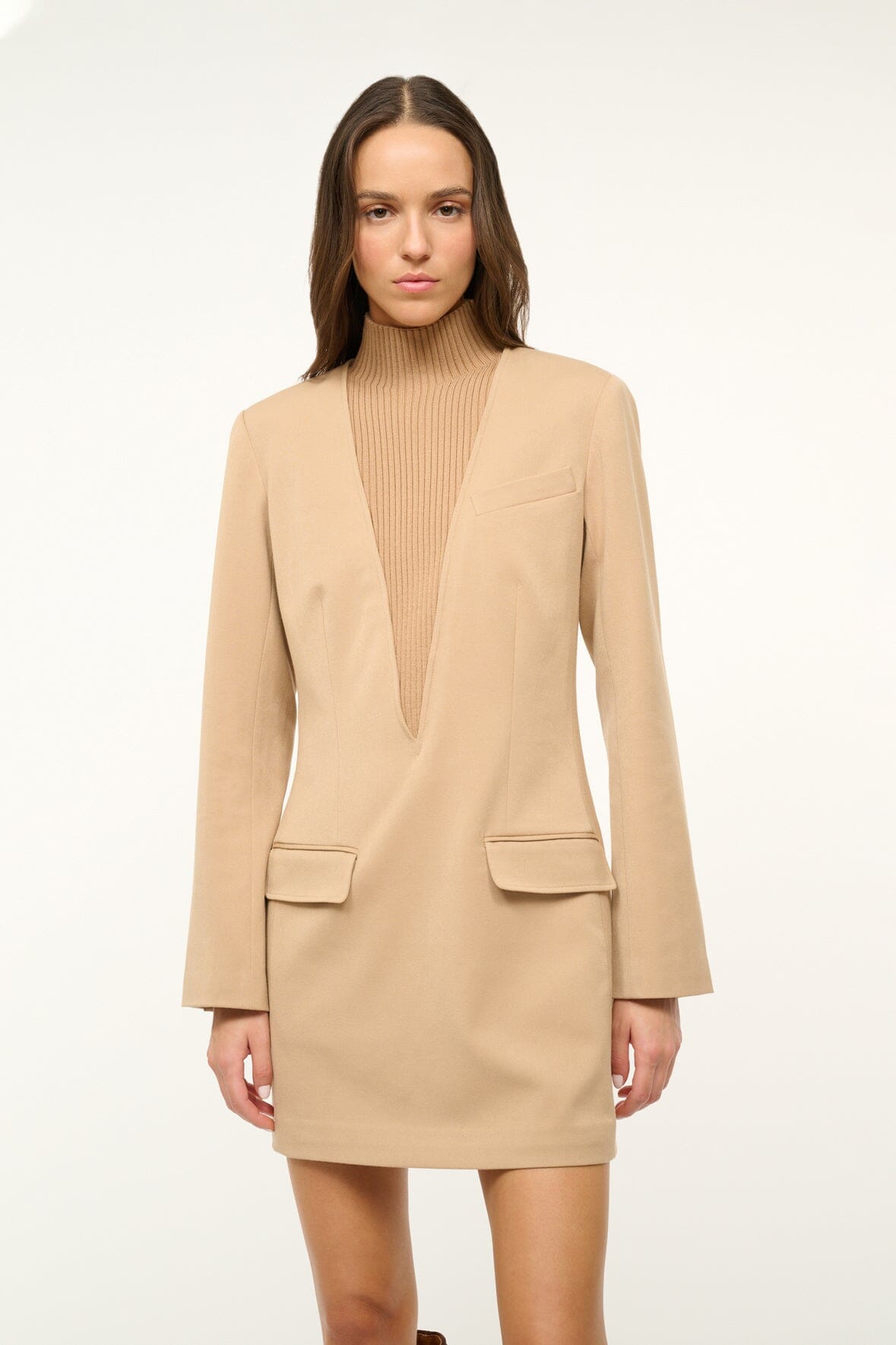 The Mott is a blazer inspired mini dress with a contrasting high neck sweater and front flap pockets.
