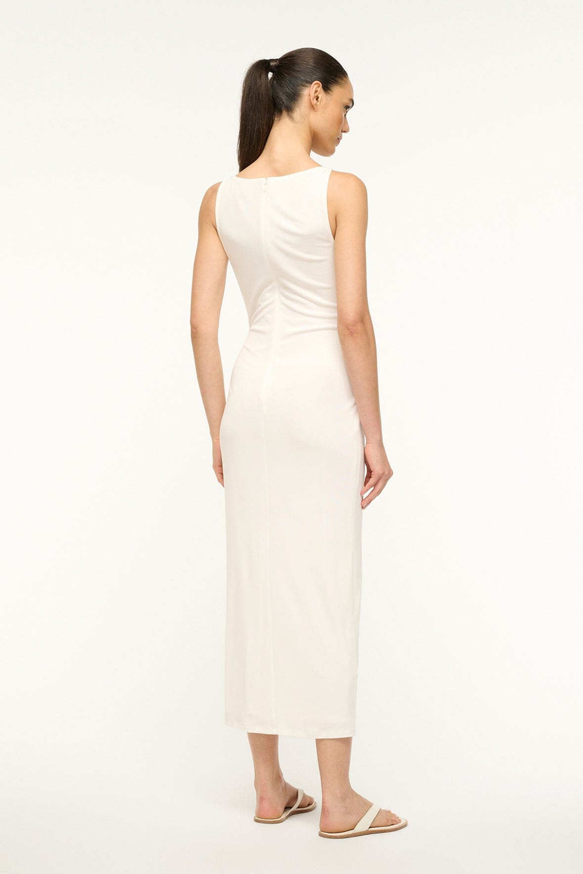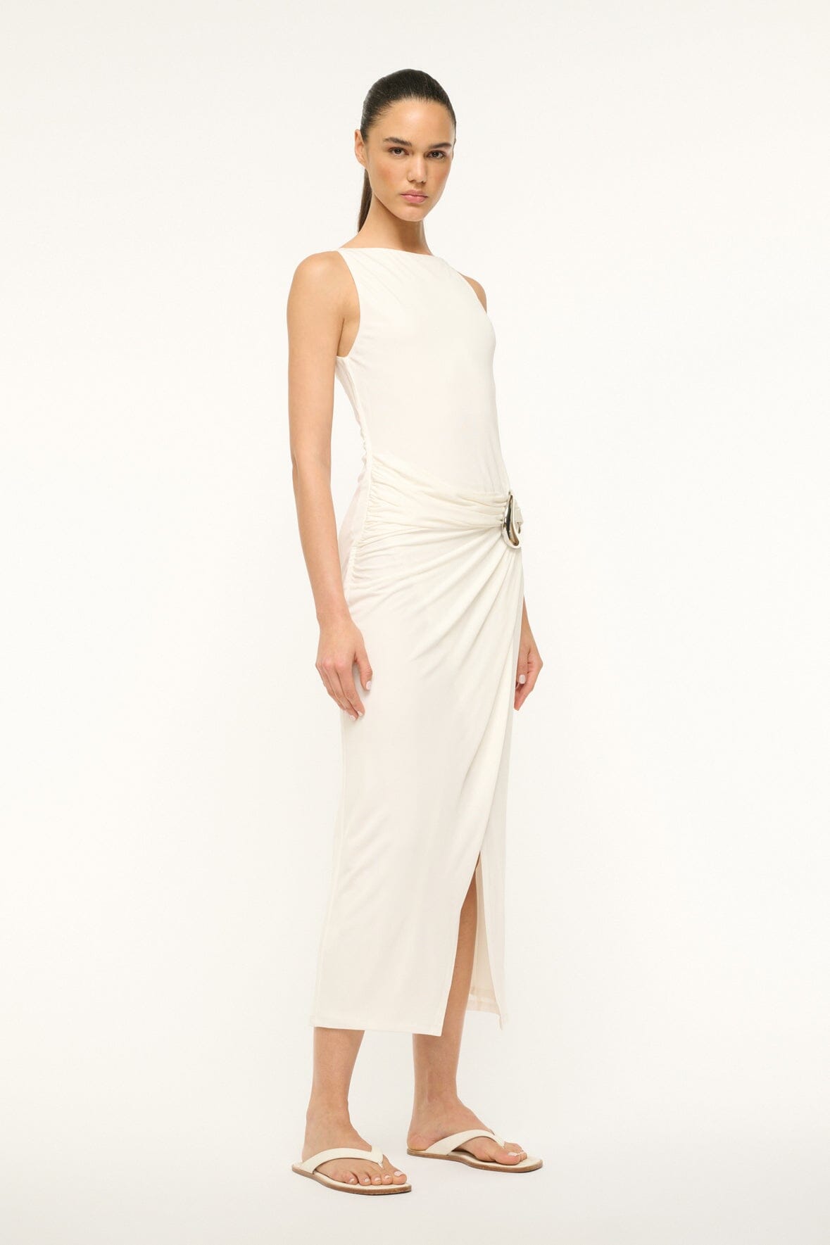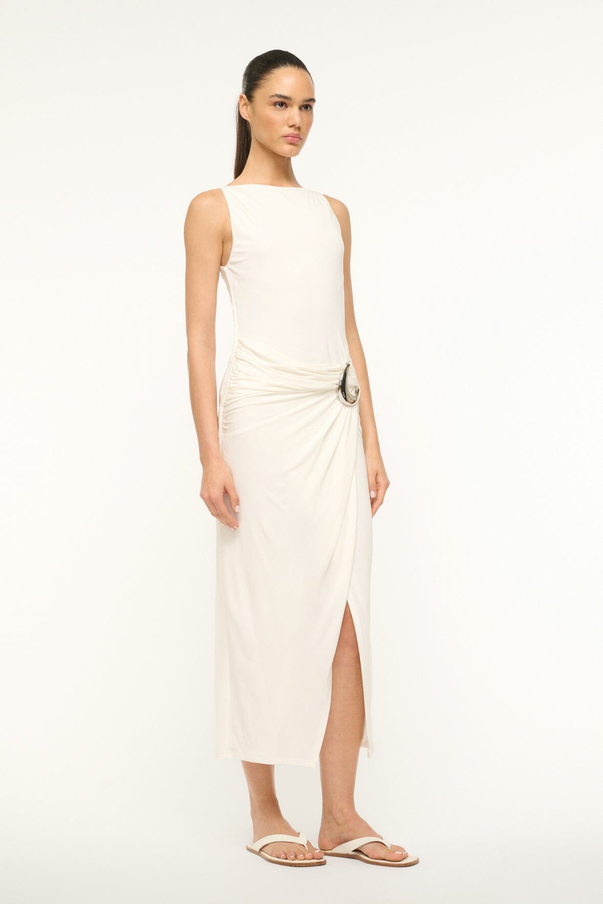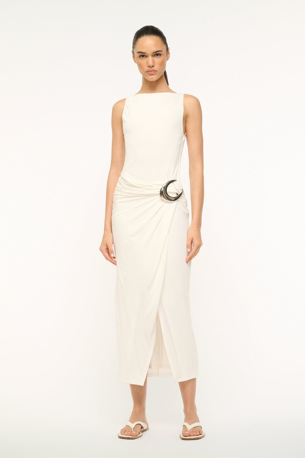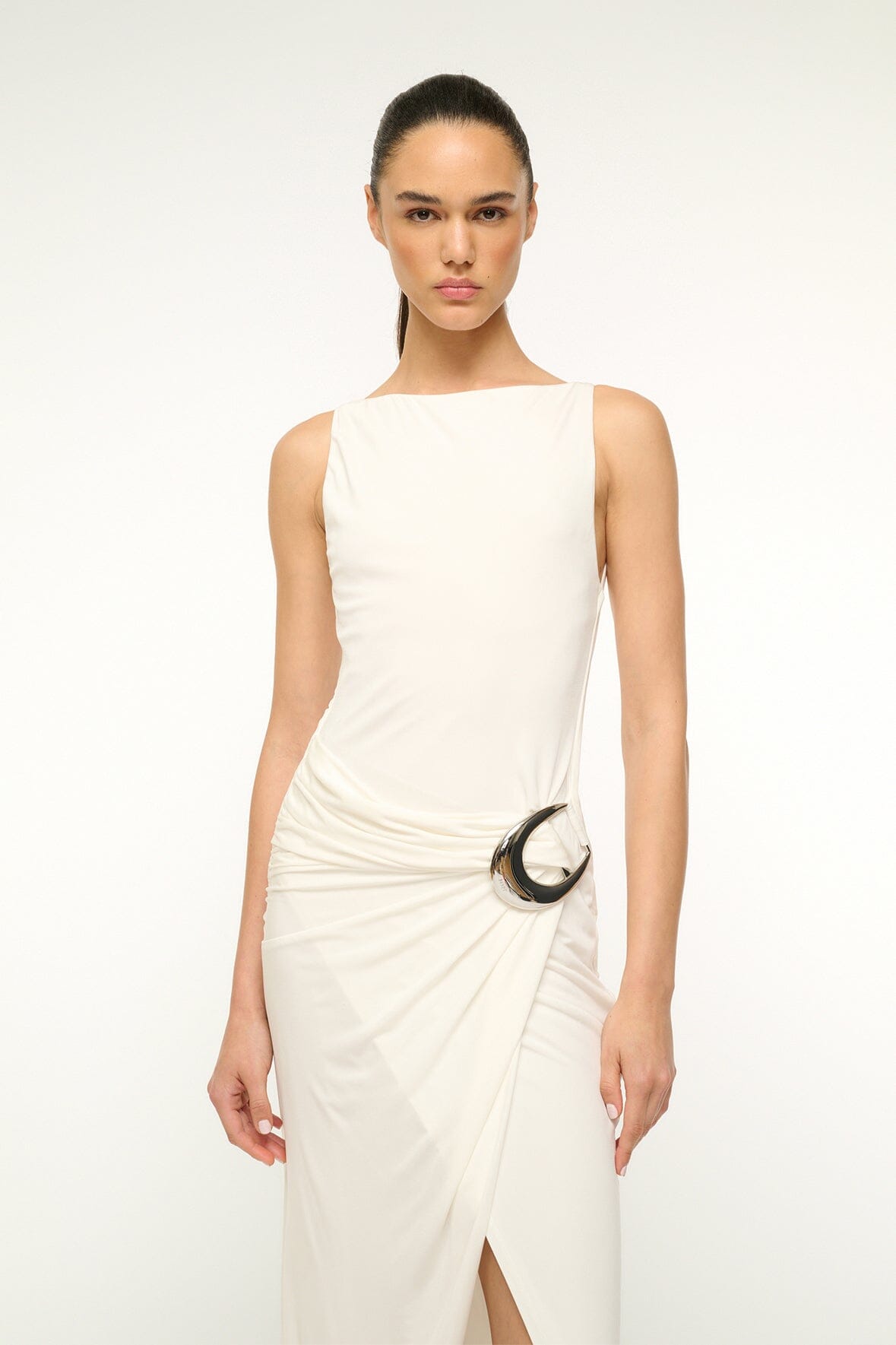 A sleeveless boatneck jersey dress, the Talia features a wrap skirt and oversized custom moon buckle hardware detail gathered at the waist.