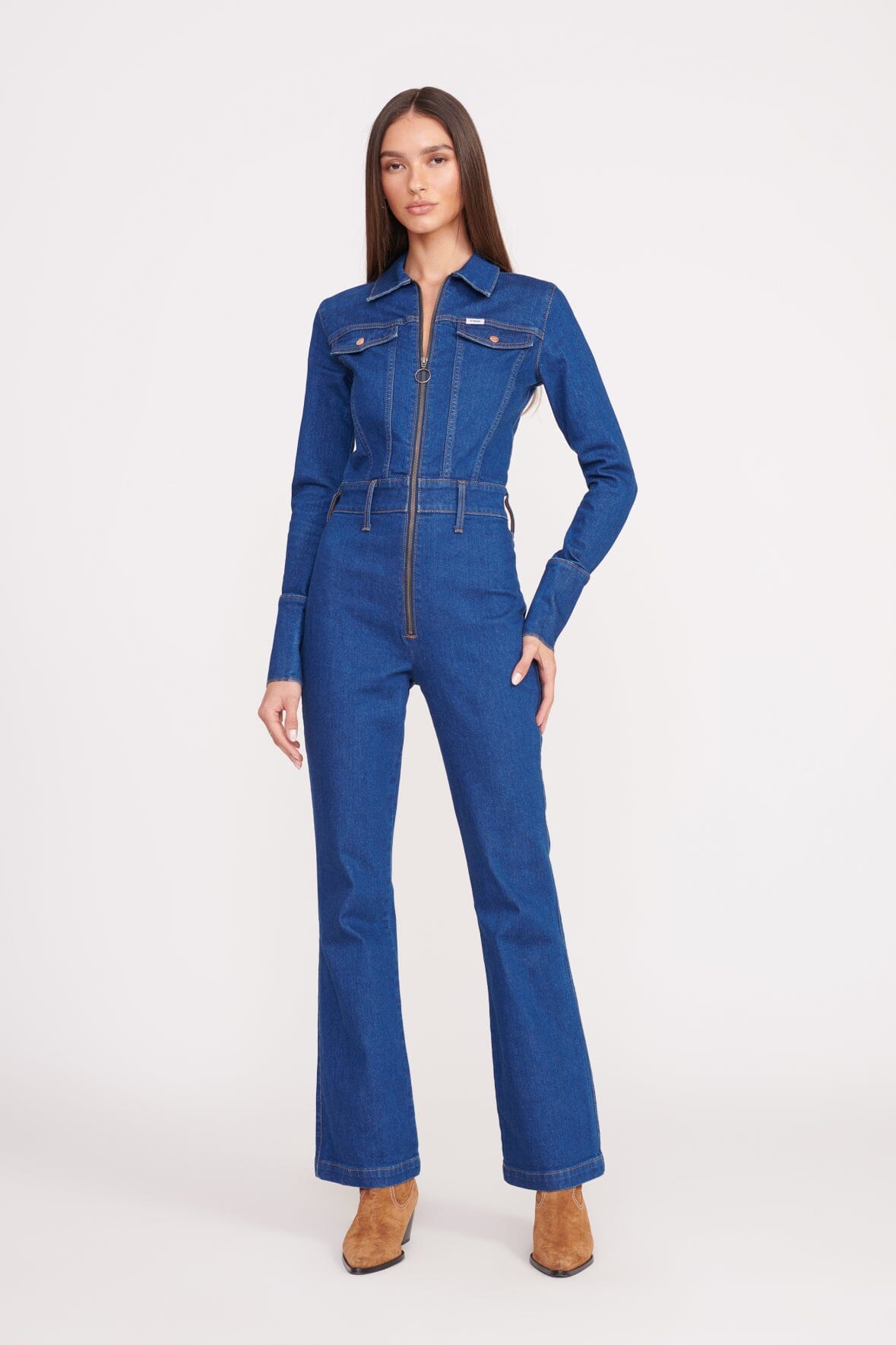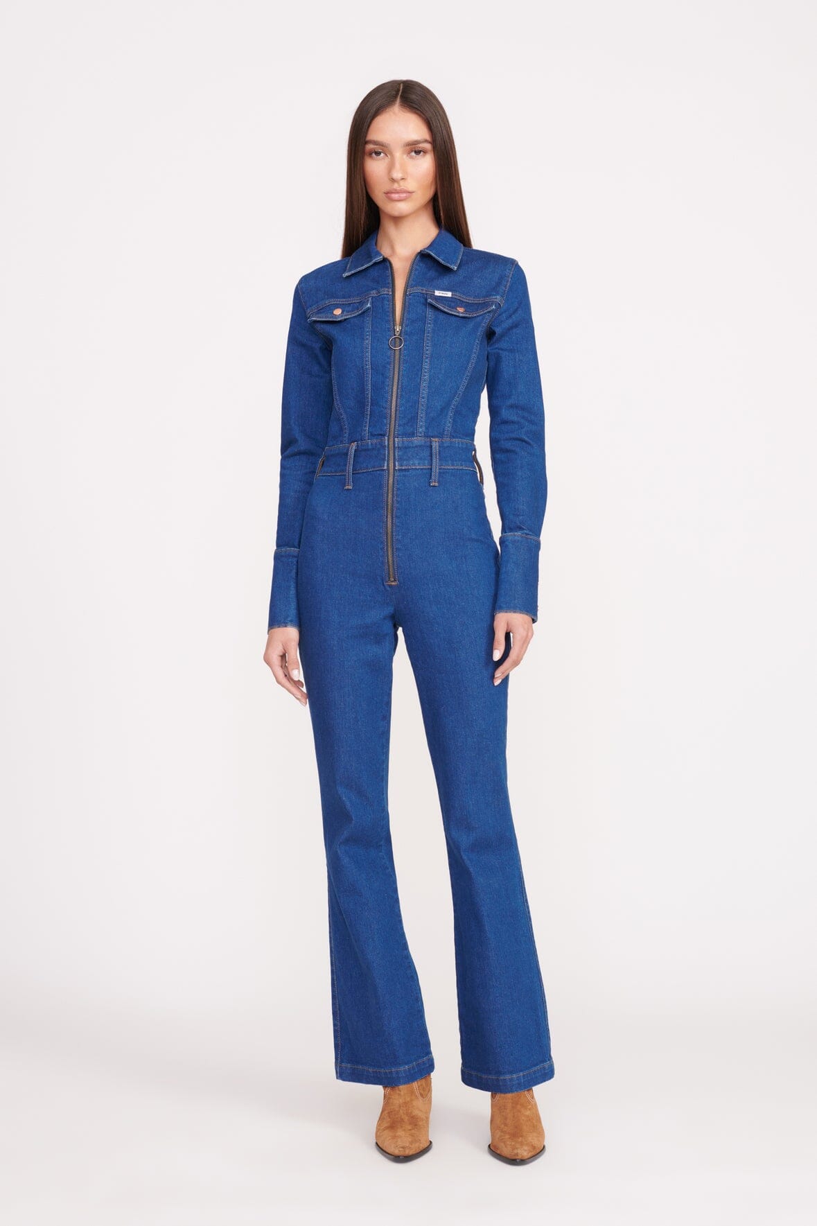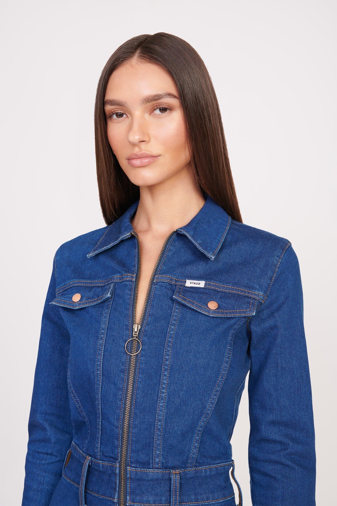 The Body Jumpsuit is our sexy fitted denim jumpsuit. This style features a zip-front, two snap pockets at the chest, and our STAUD belt loop detail at the waist. The jumpsuit is fitted through the body and has a flared leg.