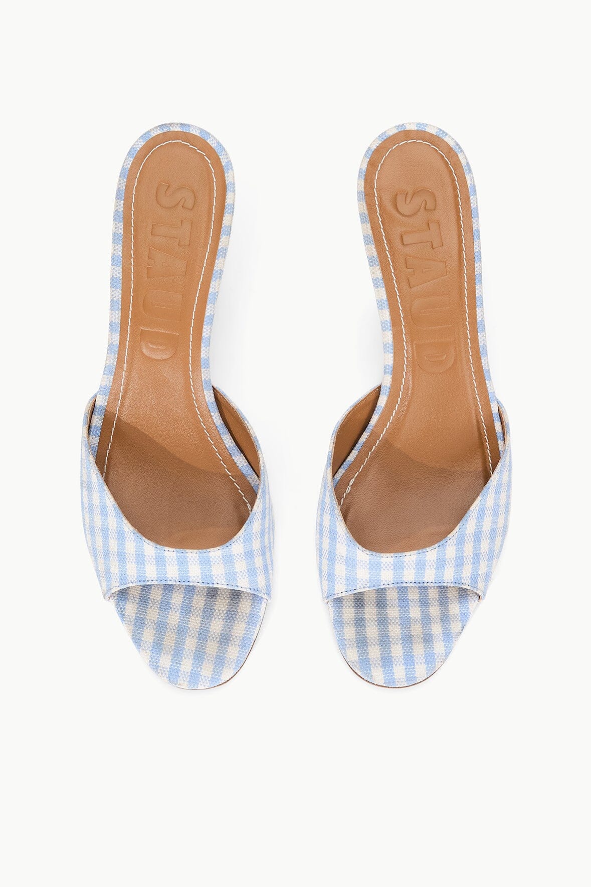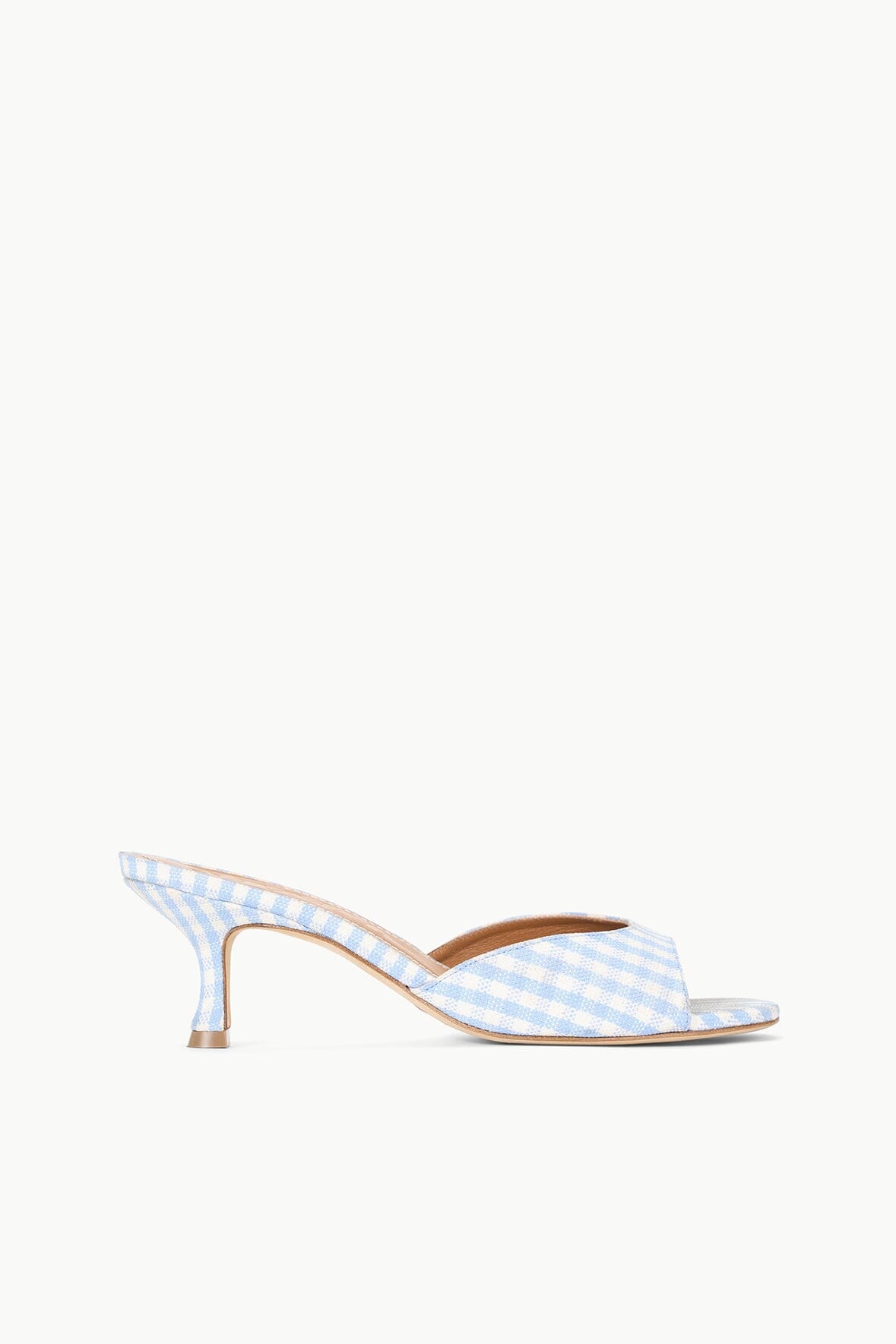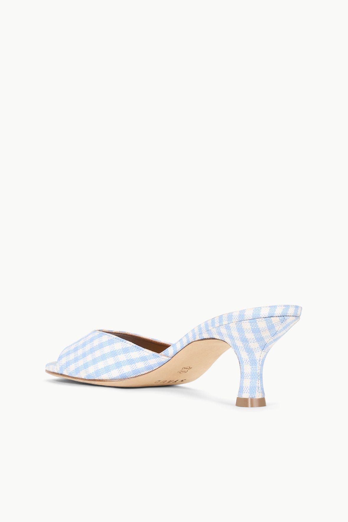 An open-toe mule featuring a gingham cotton canvas upper, the Brigitte is an essential kitten heel for versatile dressing.