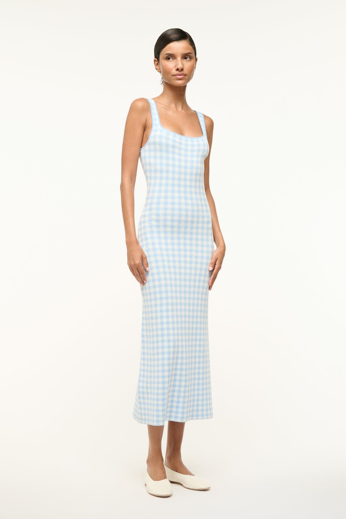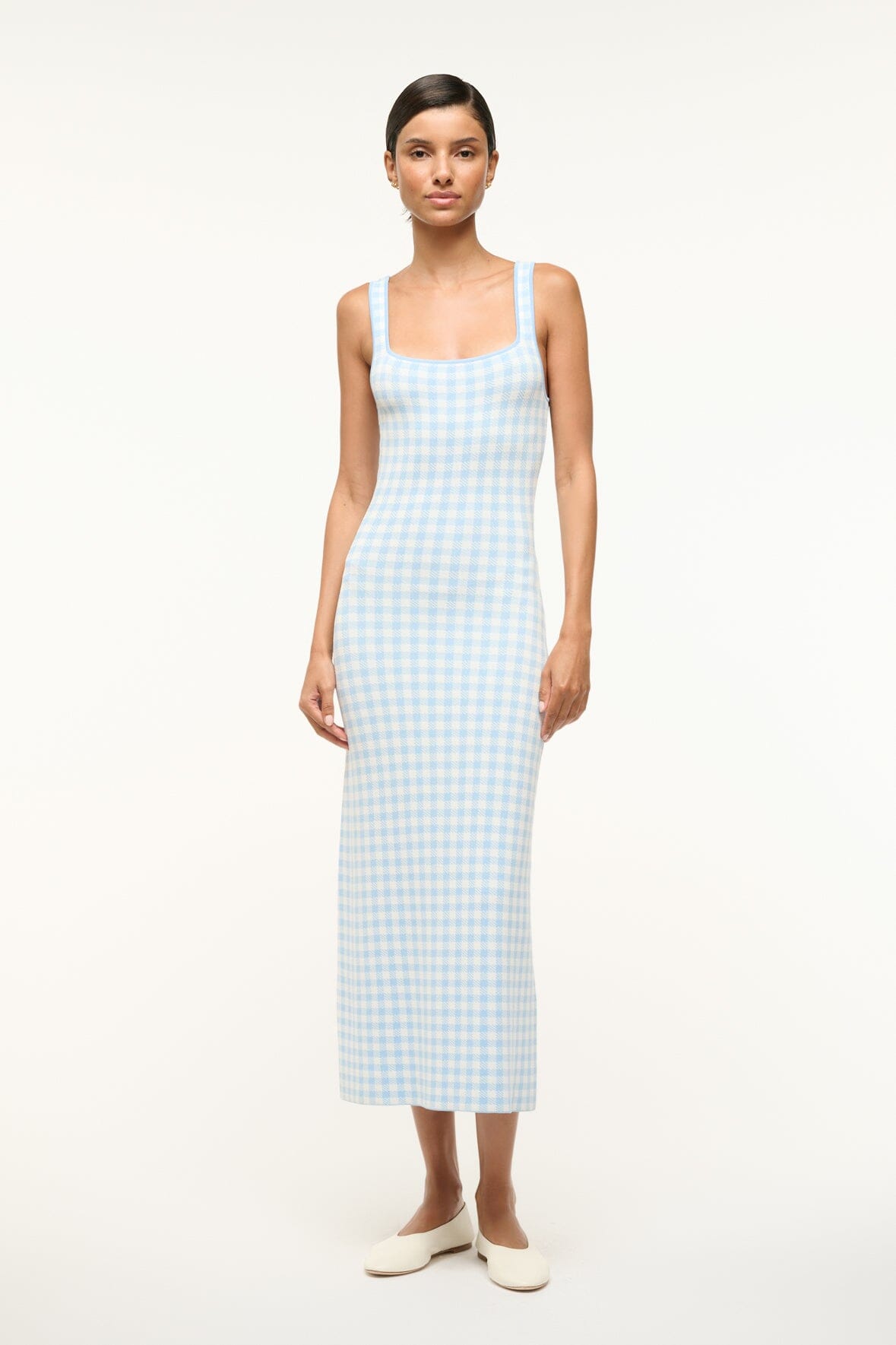 The Katie Dress is a midi length dress made from our best-selling compact knit featuring a square neckline and bra-friendly straps.