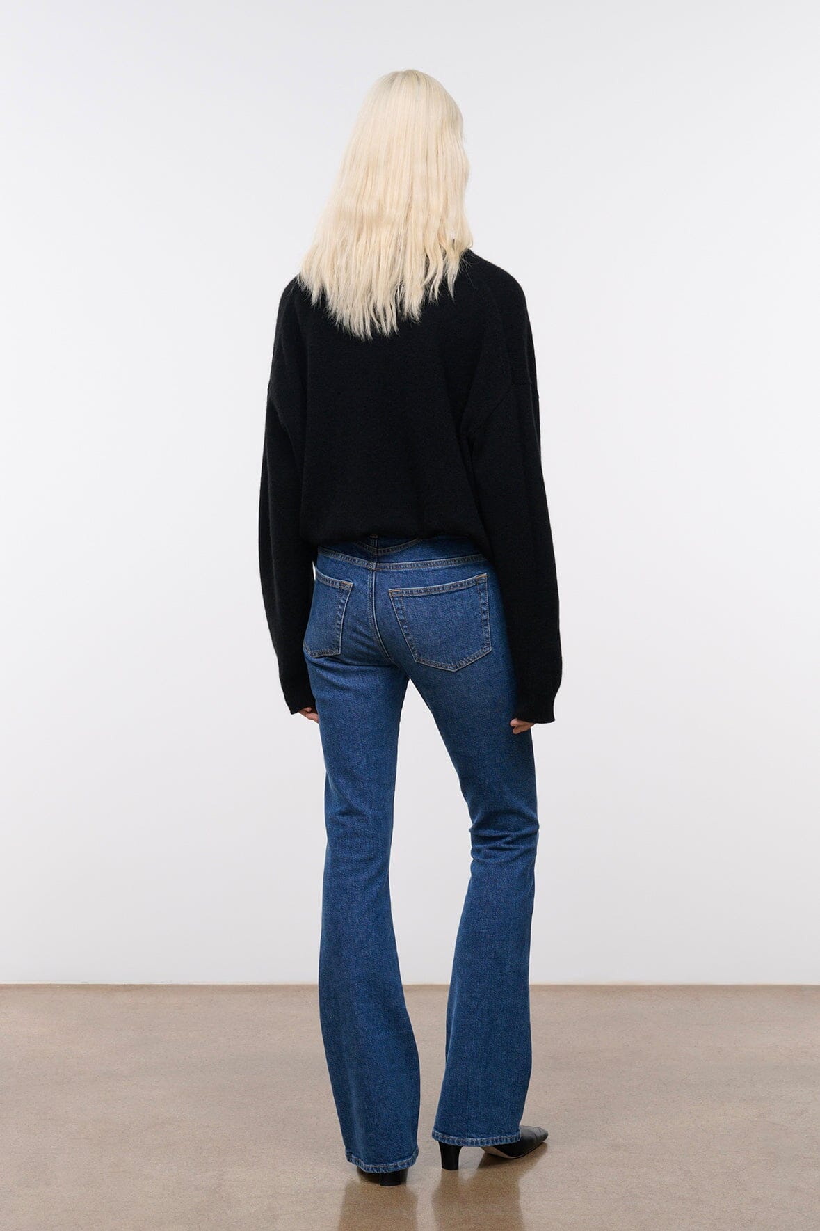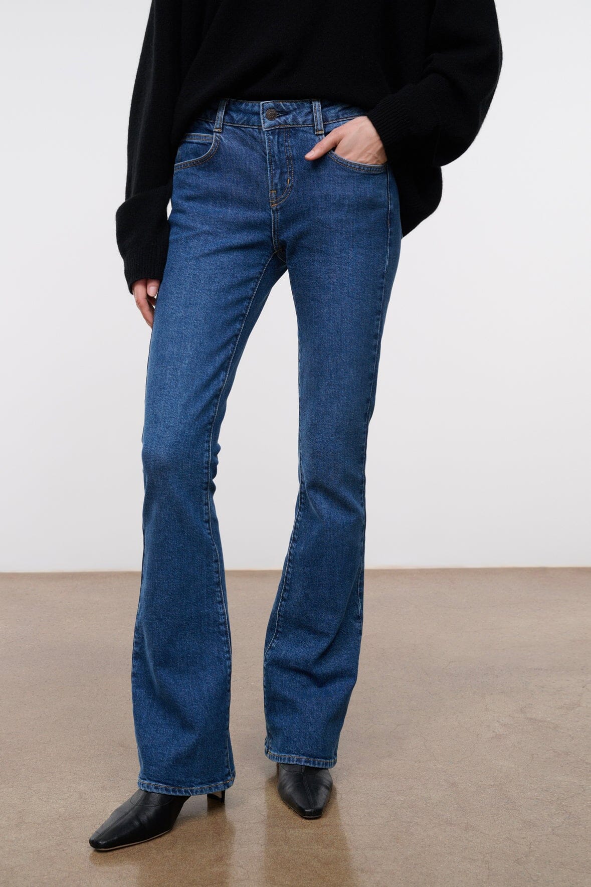 The Kyle Jean is a flattering, ‘90s-inspired silhouette with a low-rise waist and cinching V-shaped yoke at the back. Cut from denim with a hint of stretch, its shape contours the hips and thighs, then falls to a dramatically flared leg. Complete with antique-finish hardware and logo-embroidered zip fly.