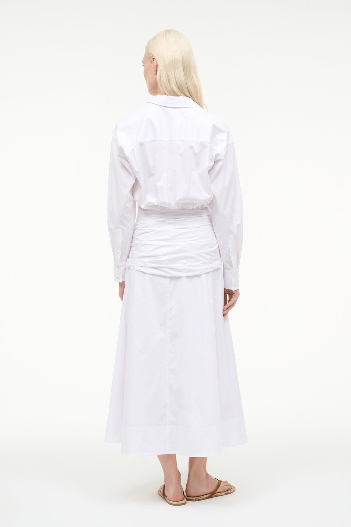 The Indya is a stretch poplin shirtdress offering a defind silhouette with a ruched waistband. Long sleeves add versatile coverage in a crisp white fabric to transition throughout the seasons.