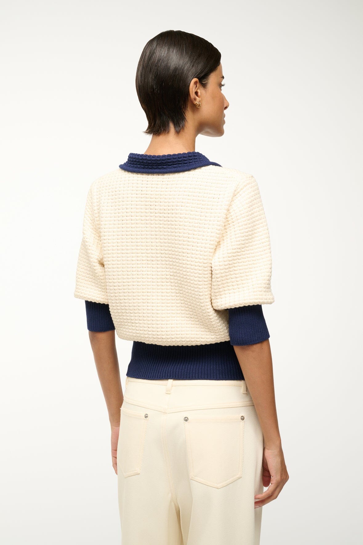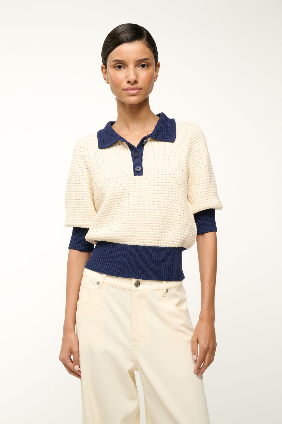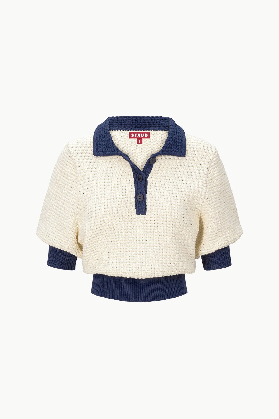 A short sleeve polo top, the Altea Sweater is made out of a chunky cotton waffle knit. This style features contrast cuffs, hem and collar.