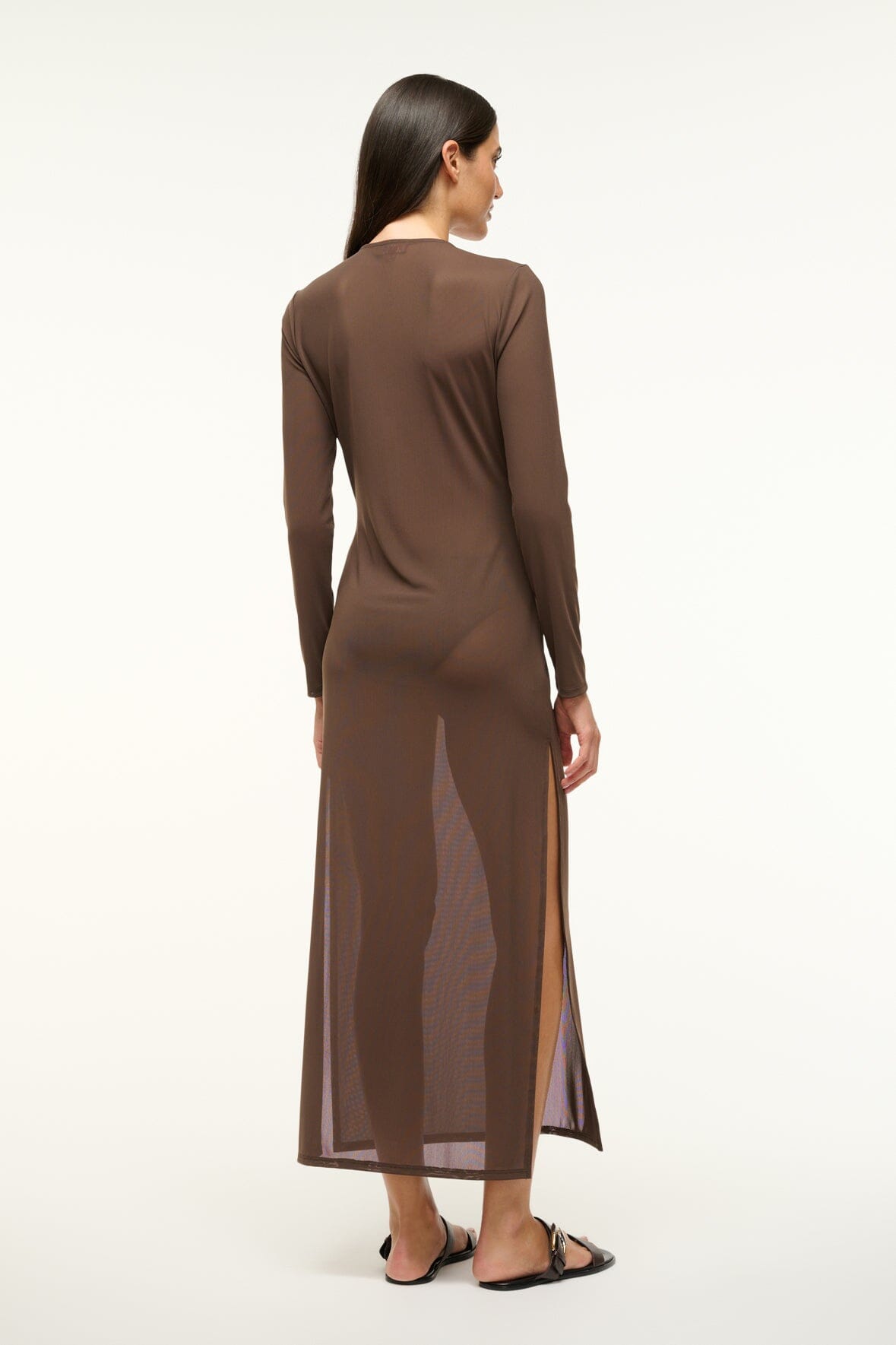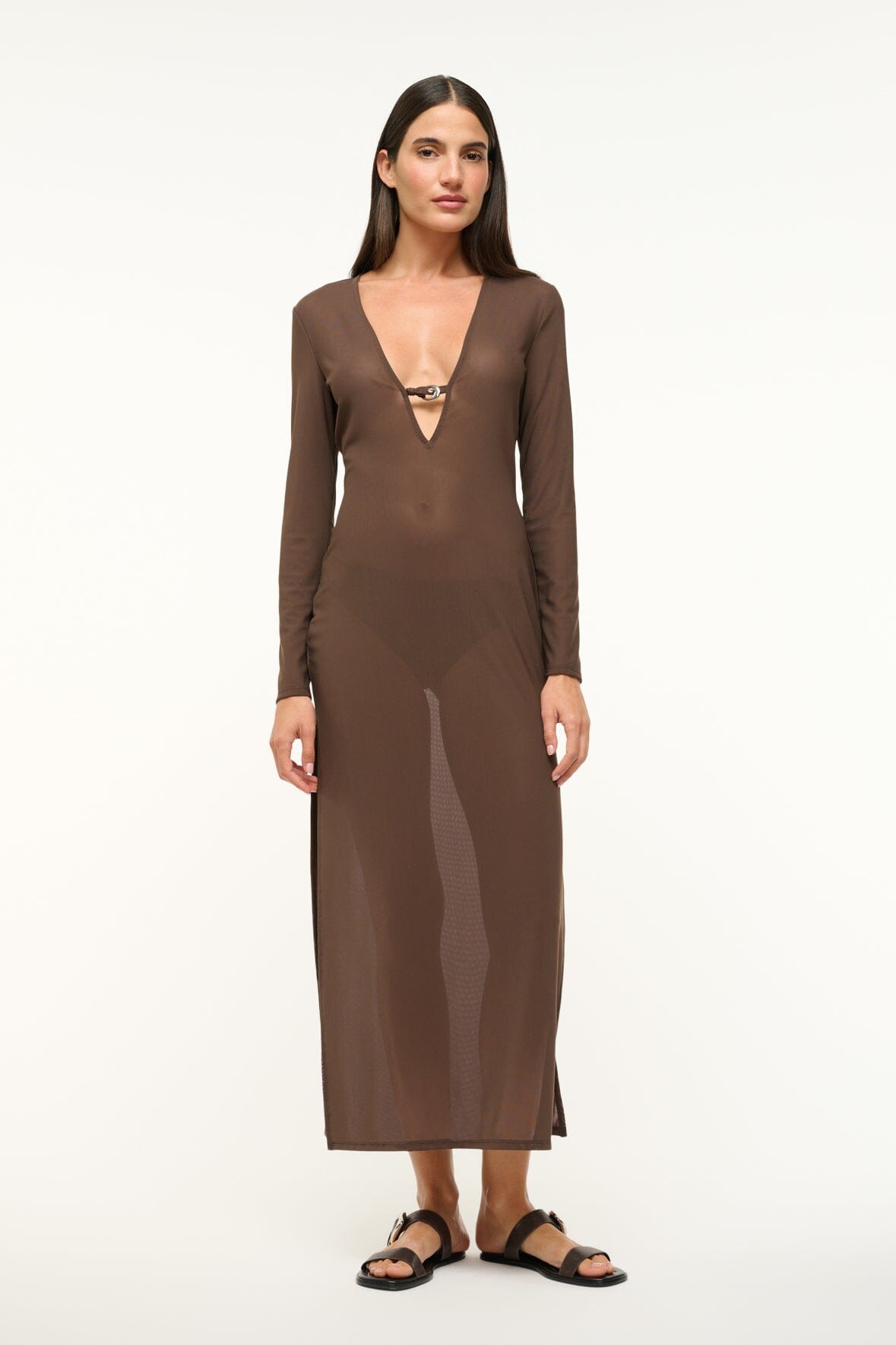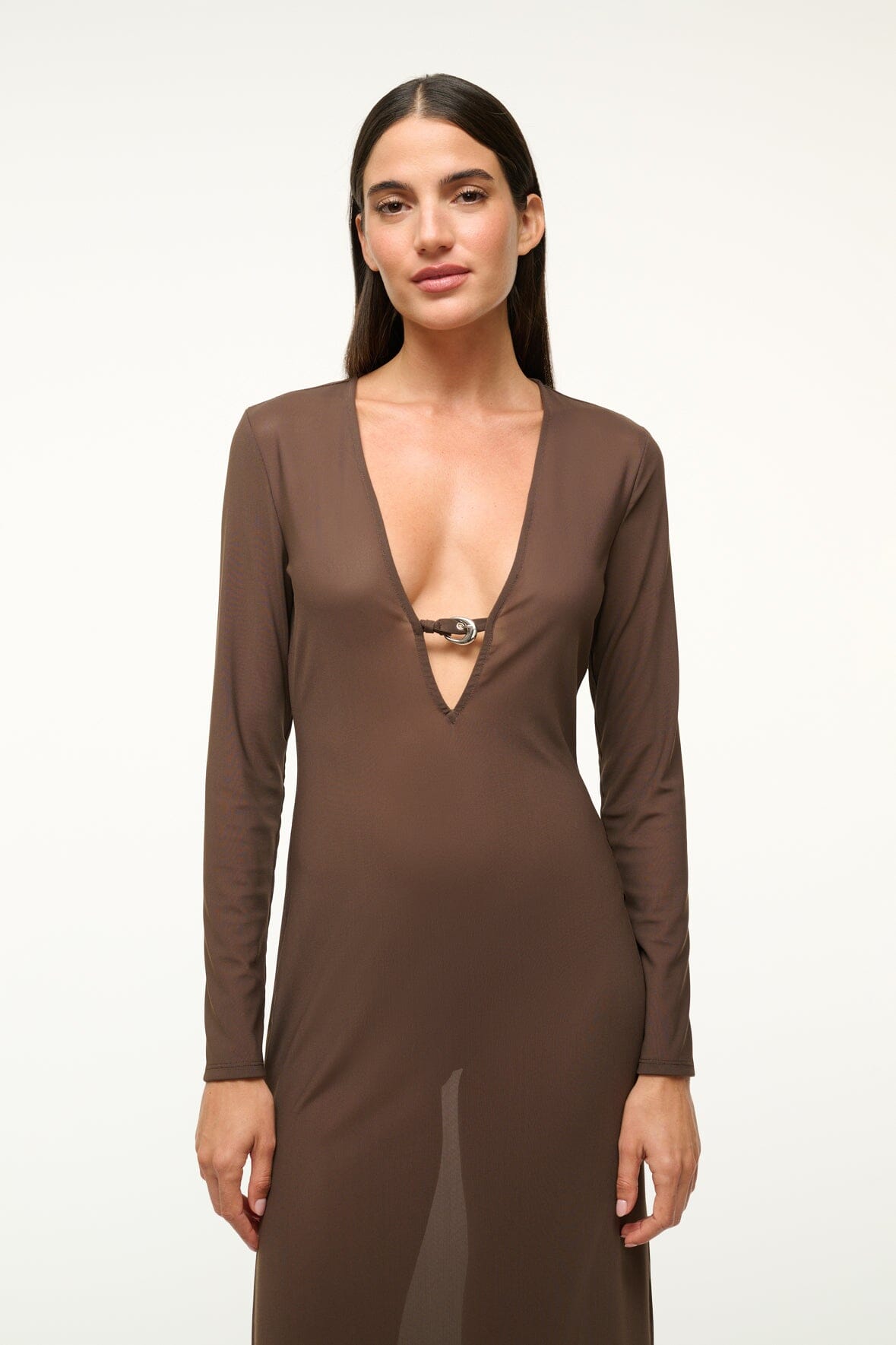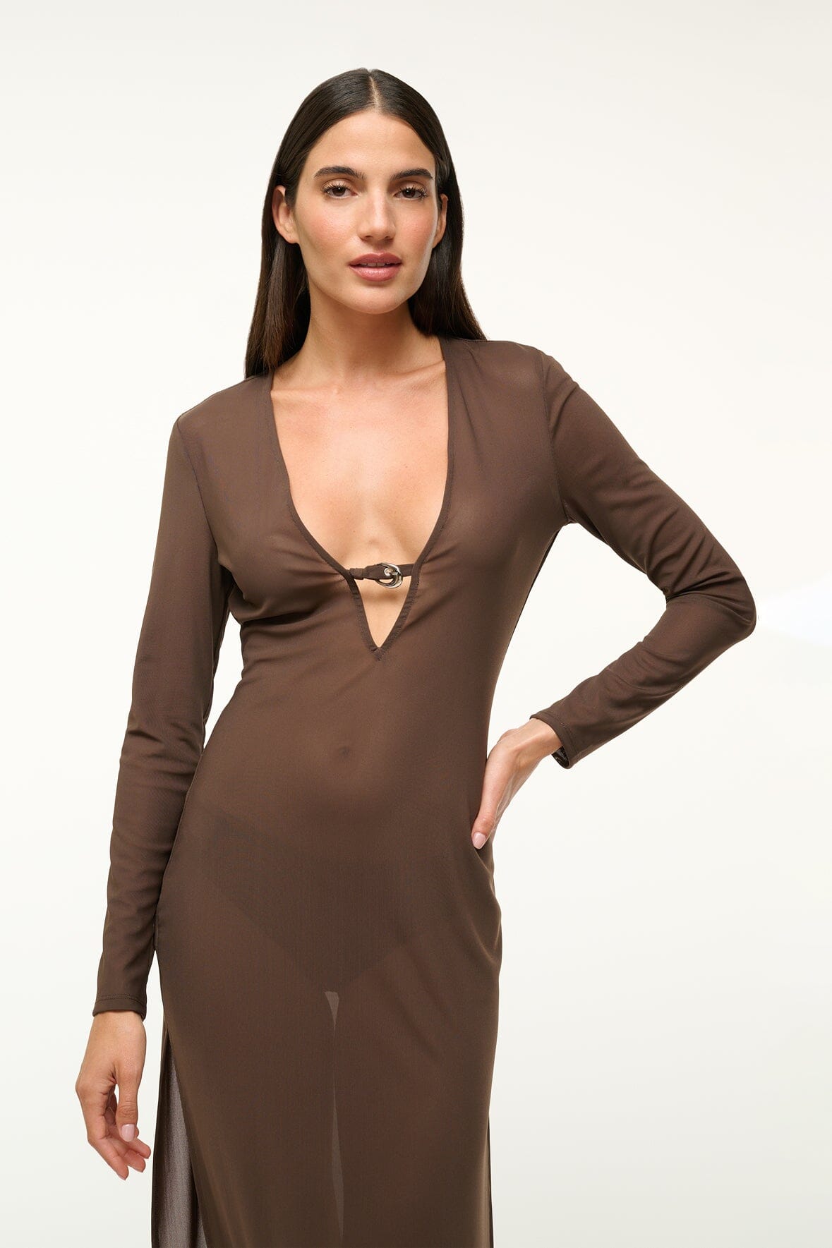 The Cleo Dress is a new swim cover-up made in our power mesh fabric. This style features a deep v-neckline and is adorned with our signature moon buckle detailing. This style has full length sleeves and side slits for easy resort wardrobing.