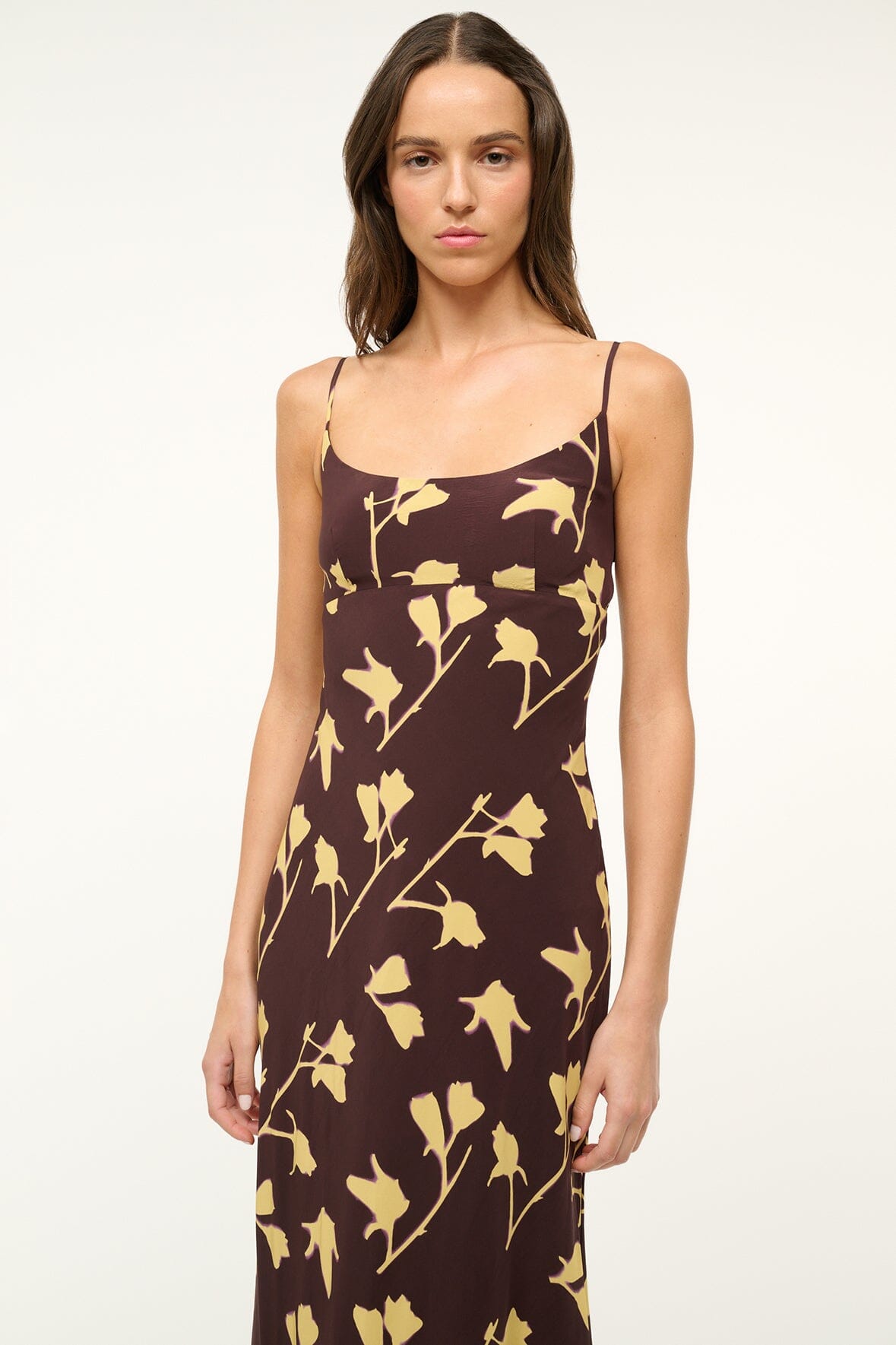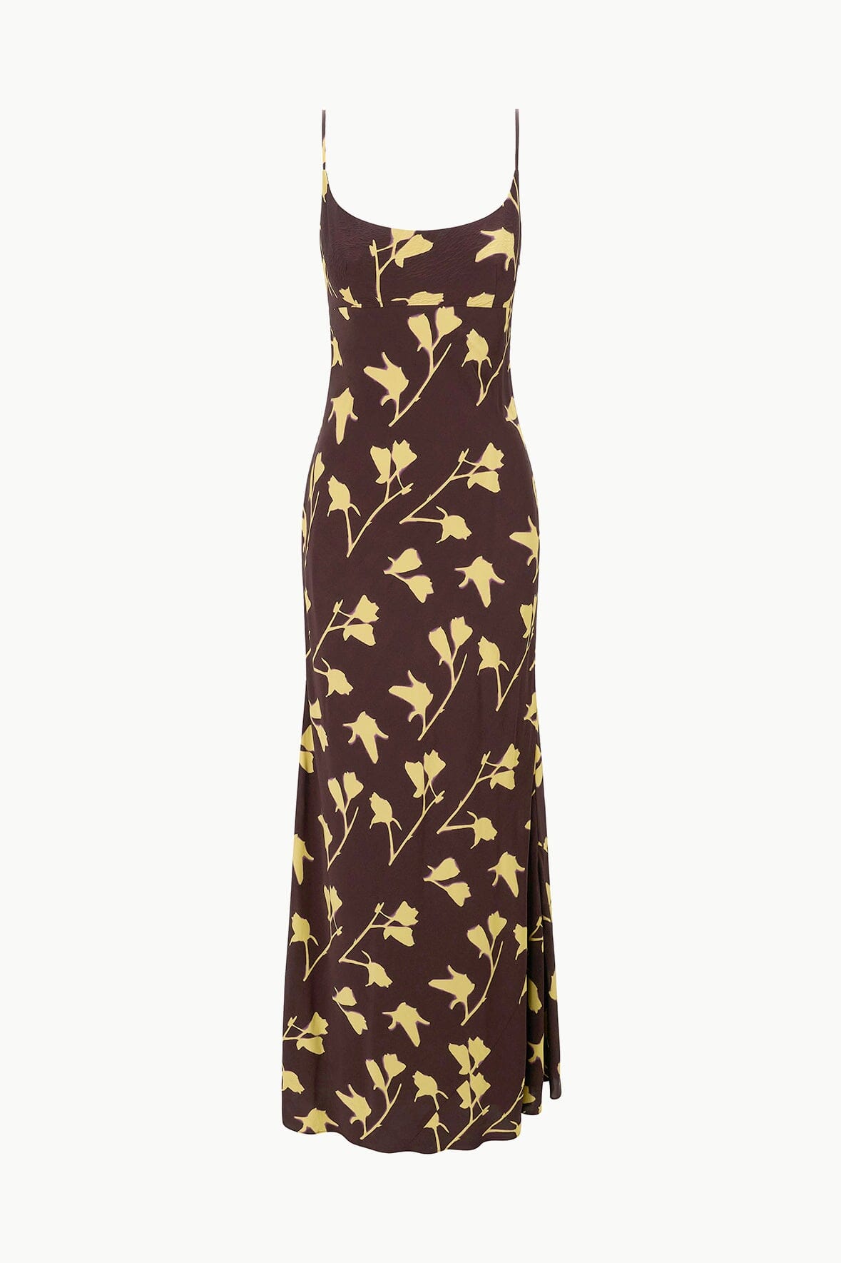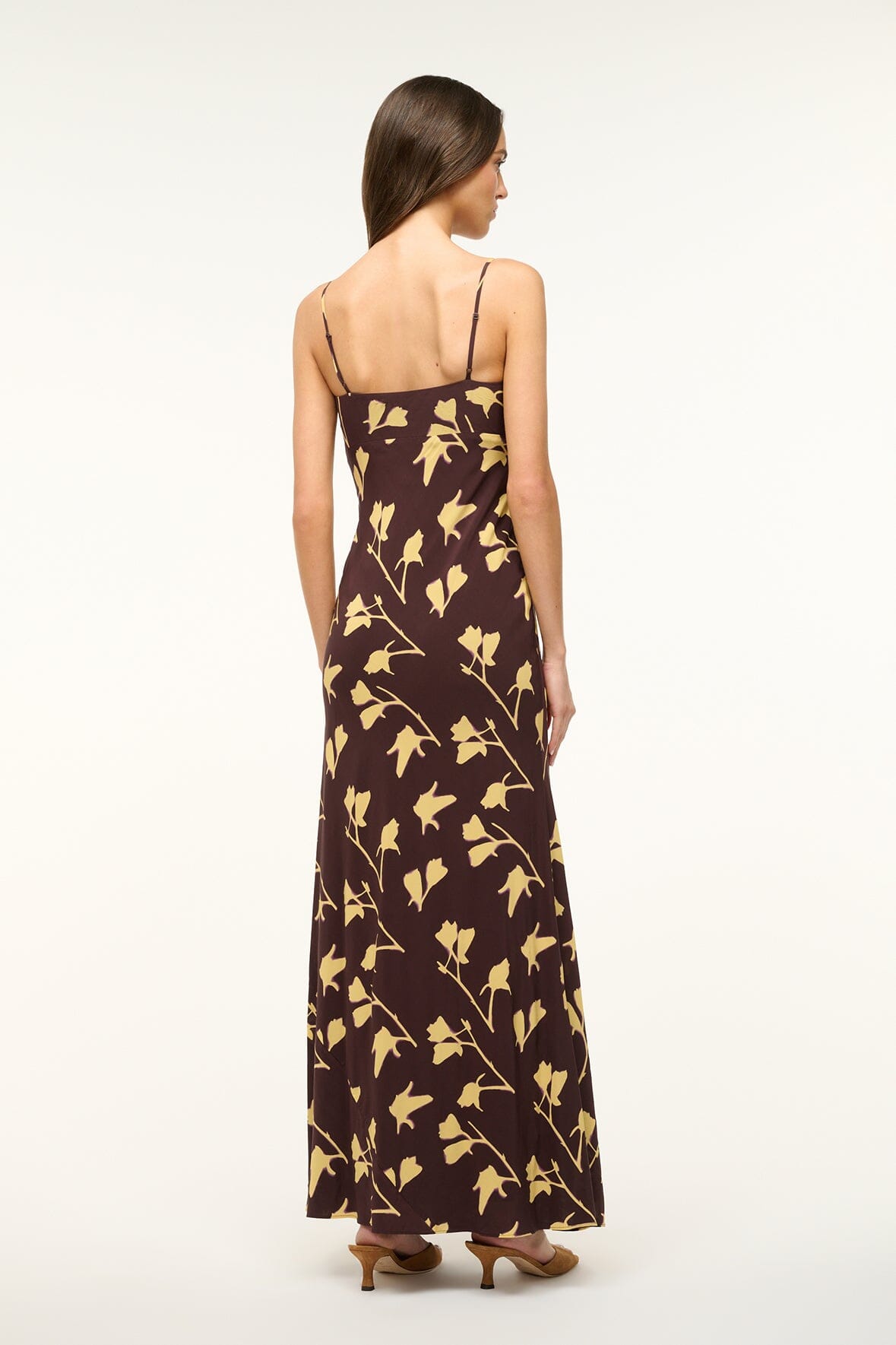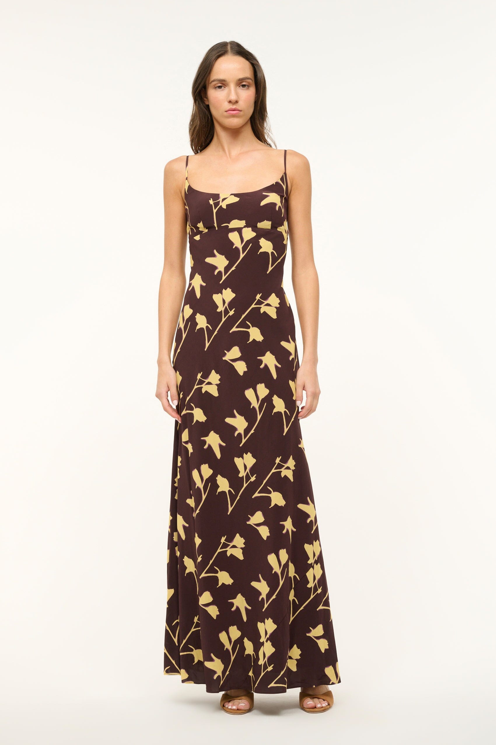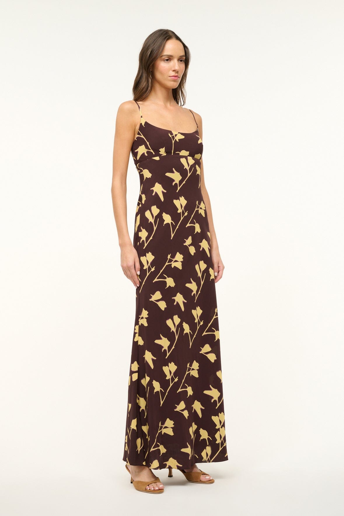 The Dinah Dress is a viscose crepe maxi slip dress with an empire waist and adjustable spaghetti straps.