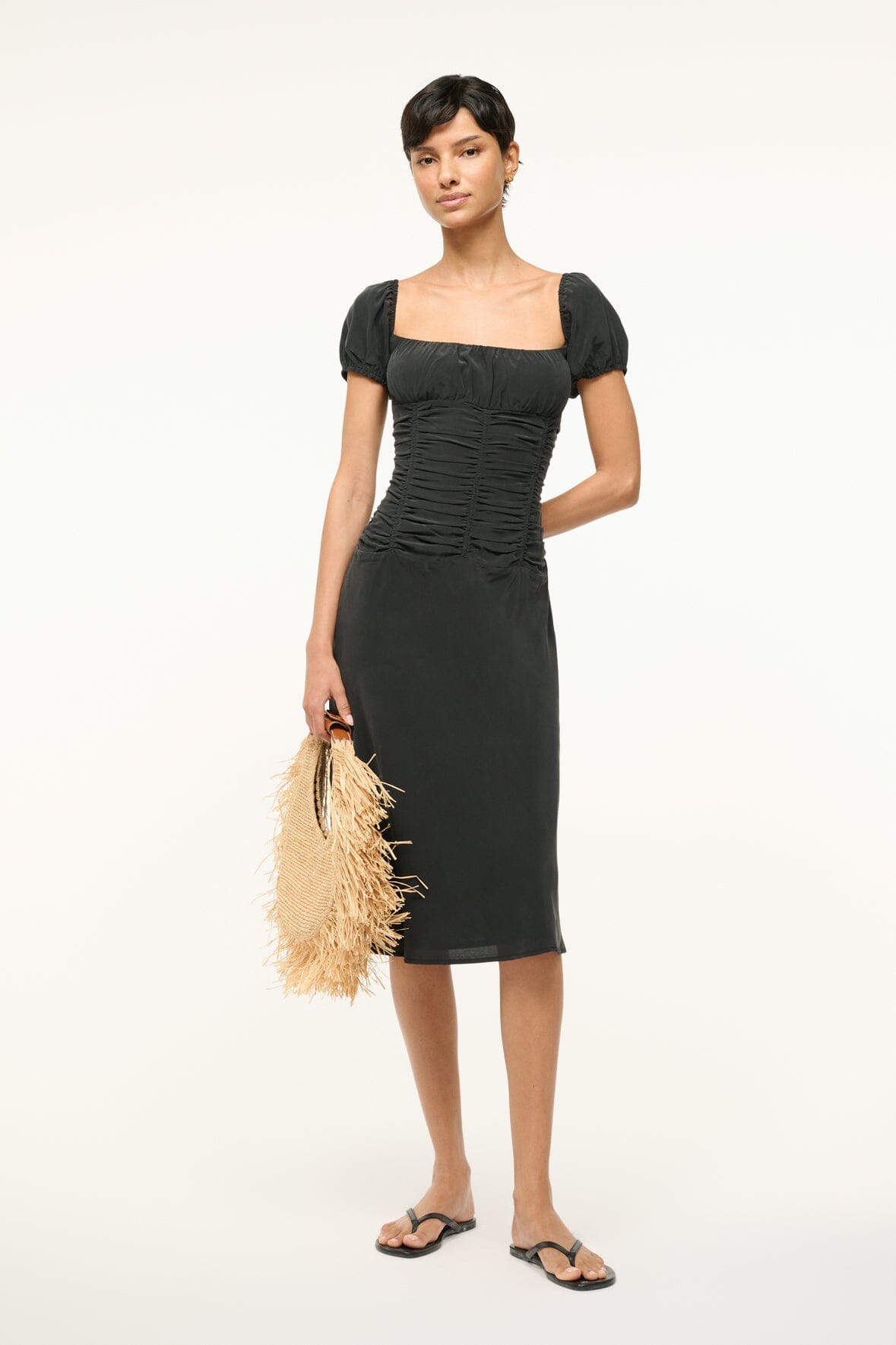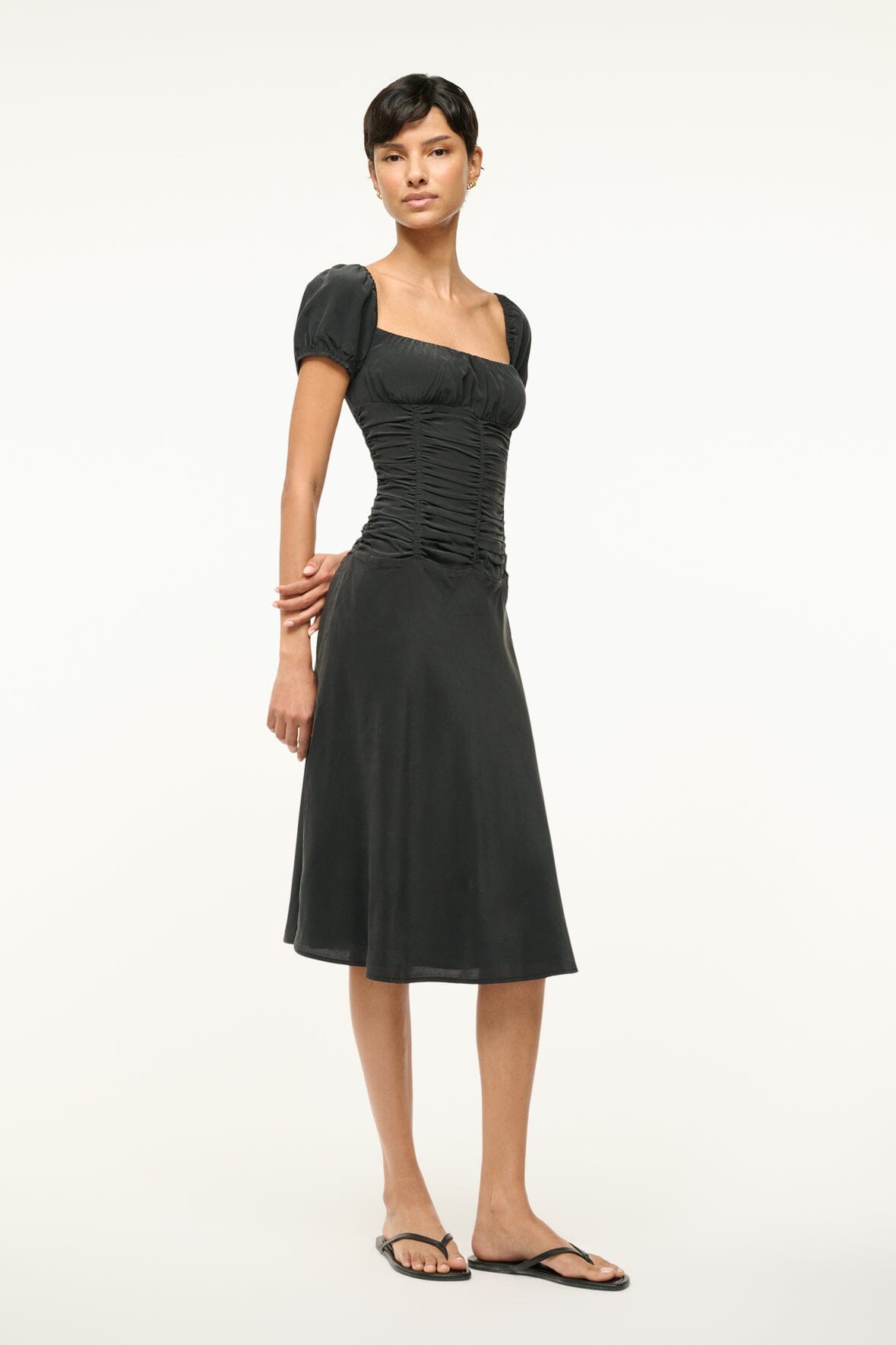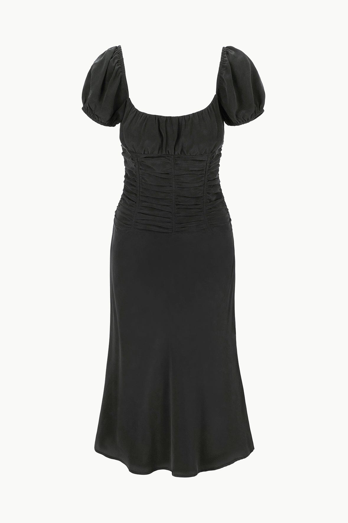 The Elba Dress is a midi-length silk dress with a shirred cap sleeve and corset-style seaming throughout the waist.