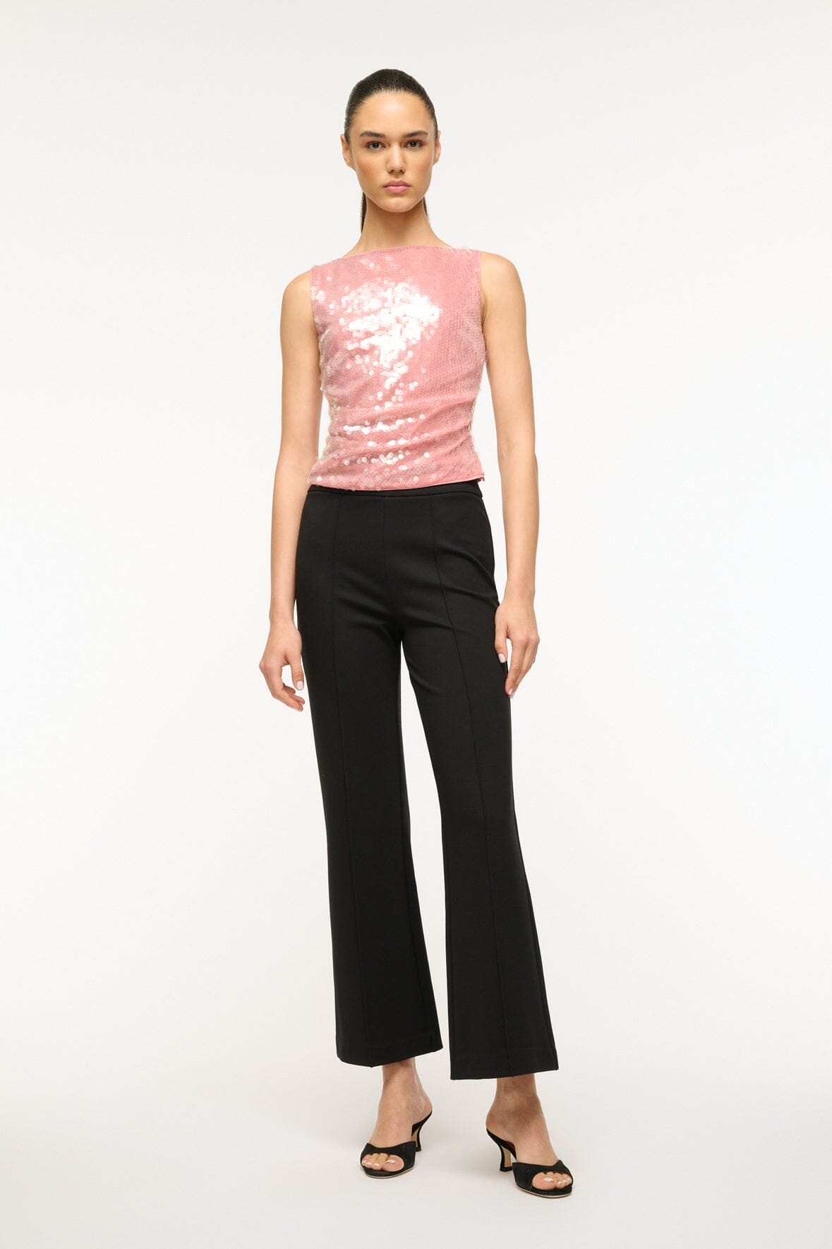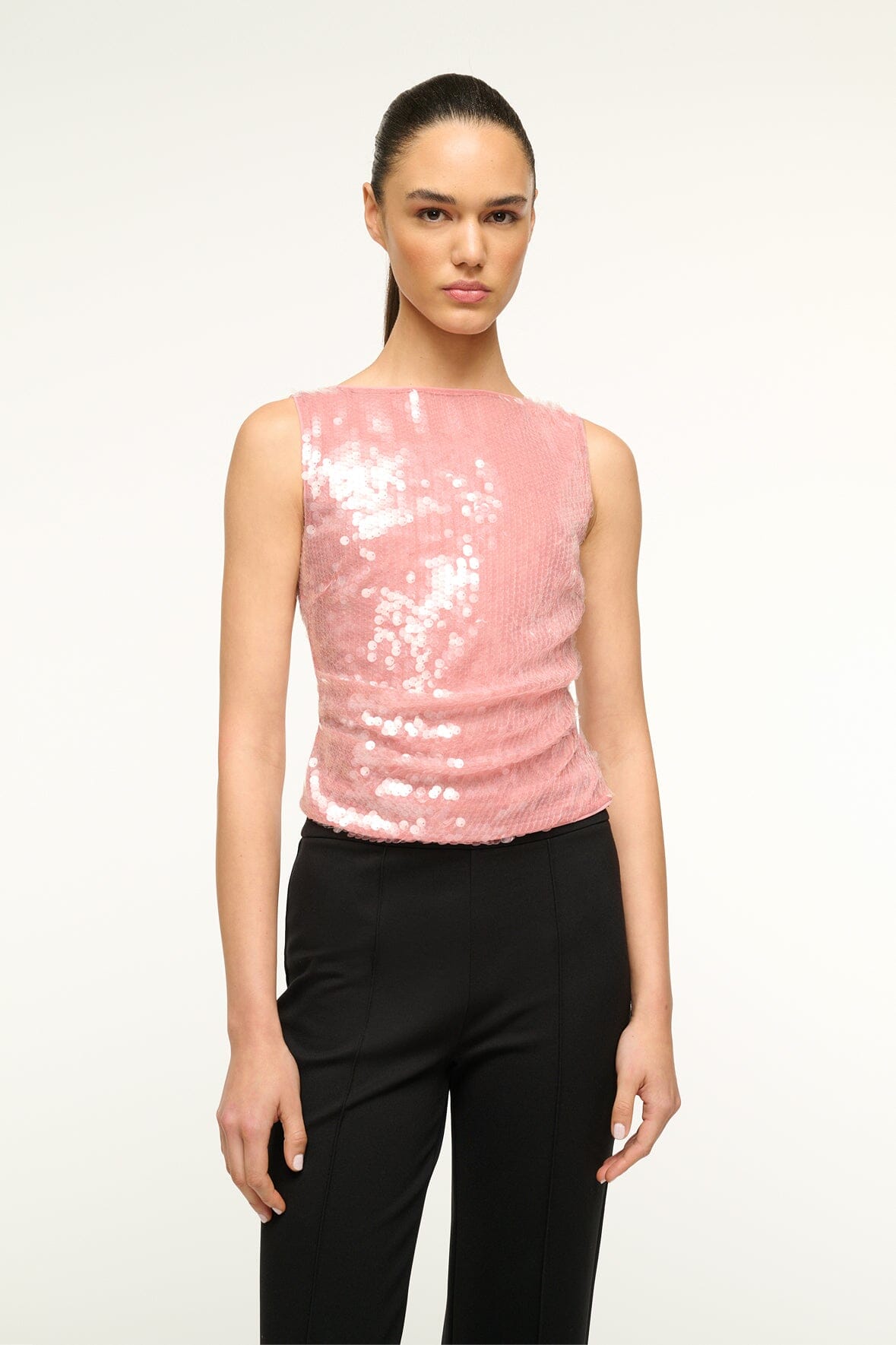 The Eton Top is a boatneck sequined top with asymmetric draping at the waist and a button closure. It can be paired with the Casey Skirt for a matching set.