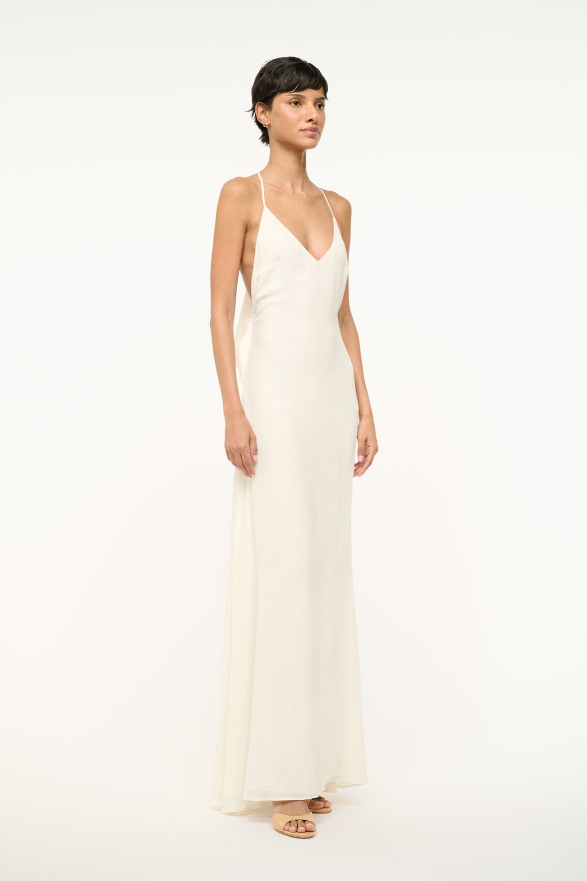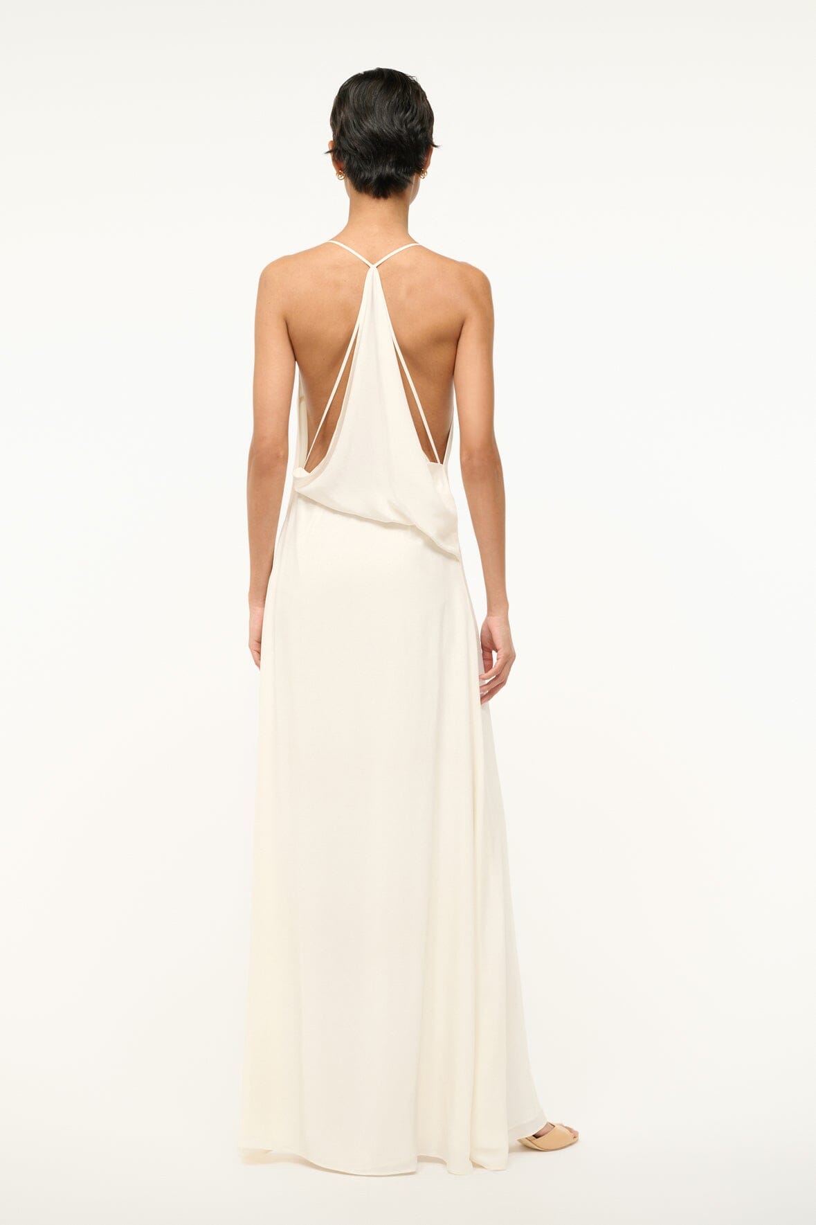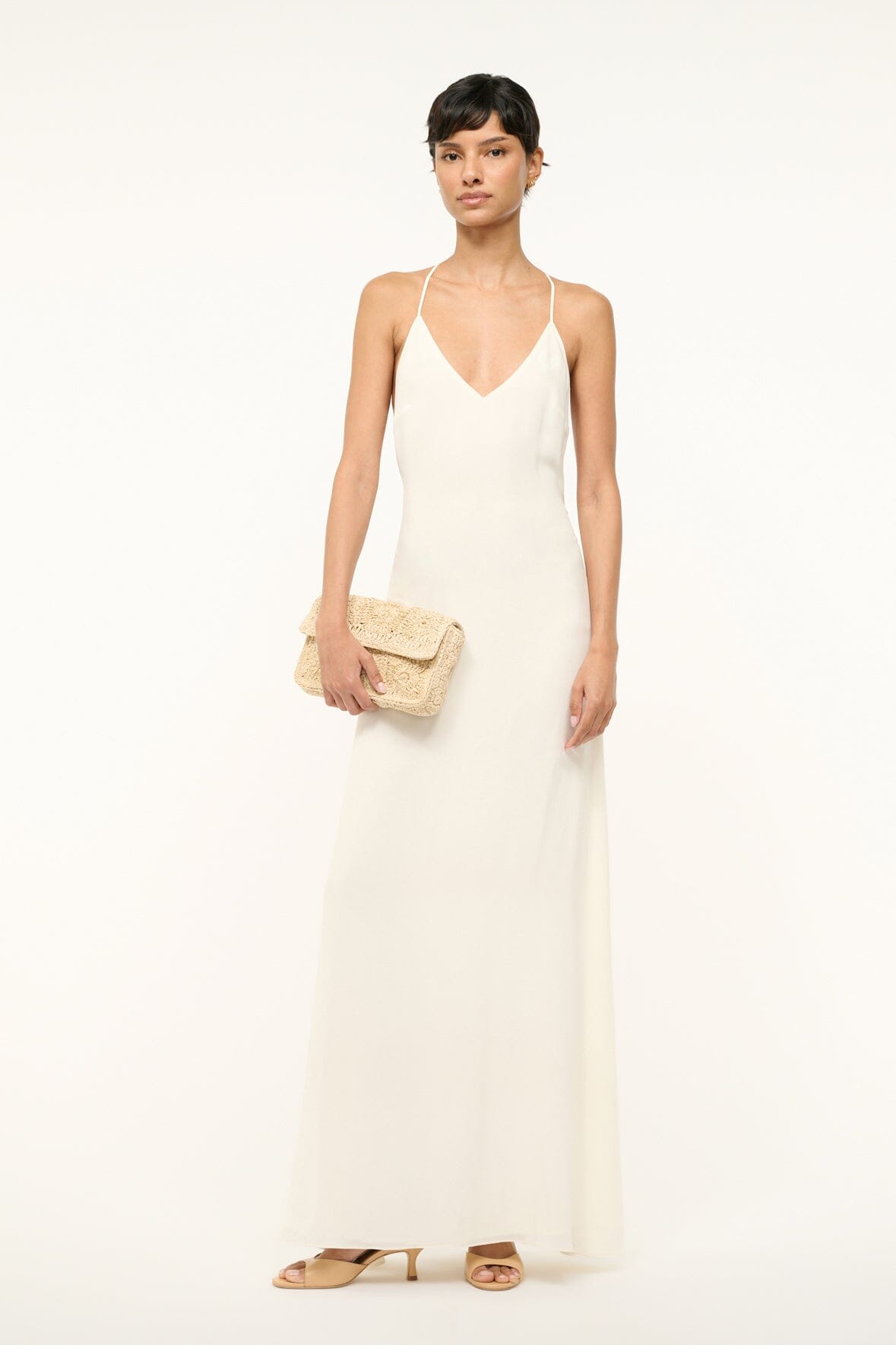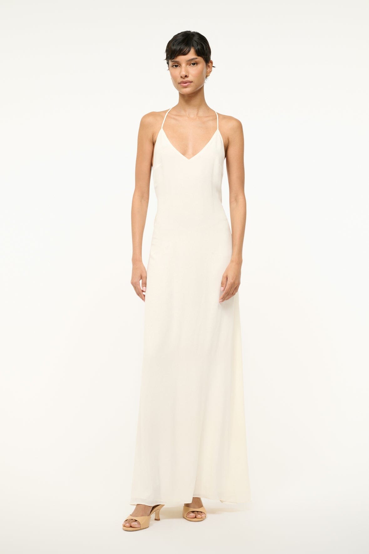 A new silk dress silhouette for Spring, the Machu is a v-neck maxi gown with an symmetrical back halter drape detail and an a-line skirt.