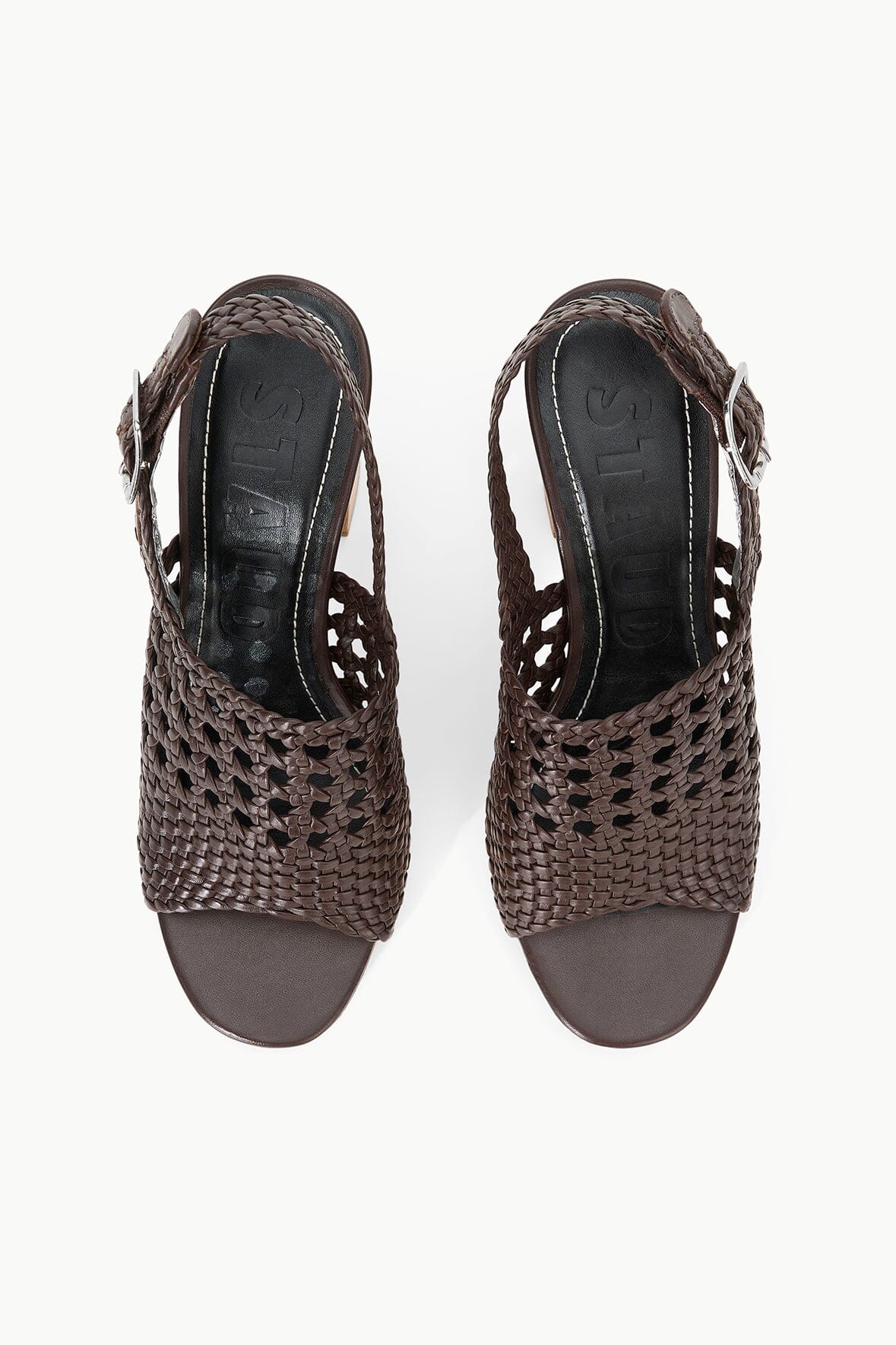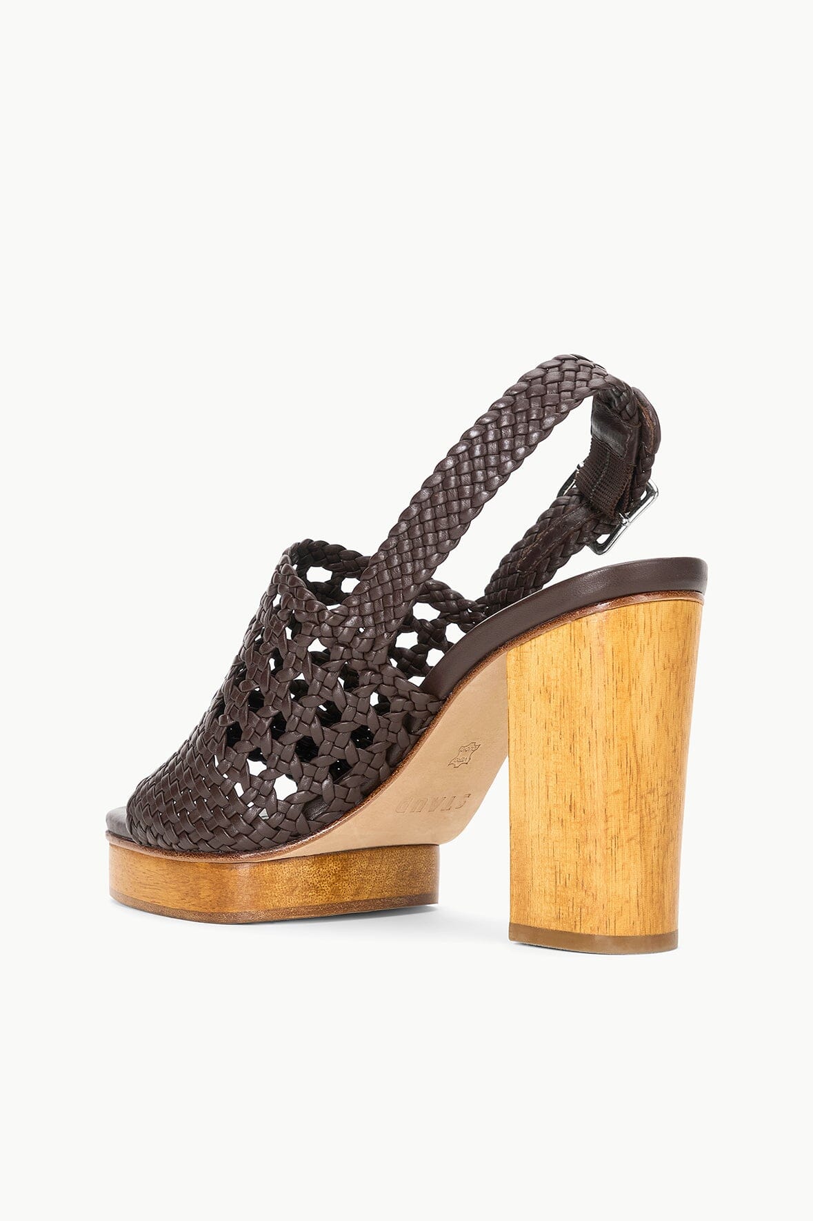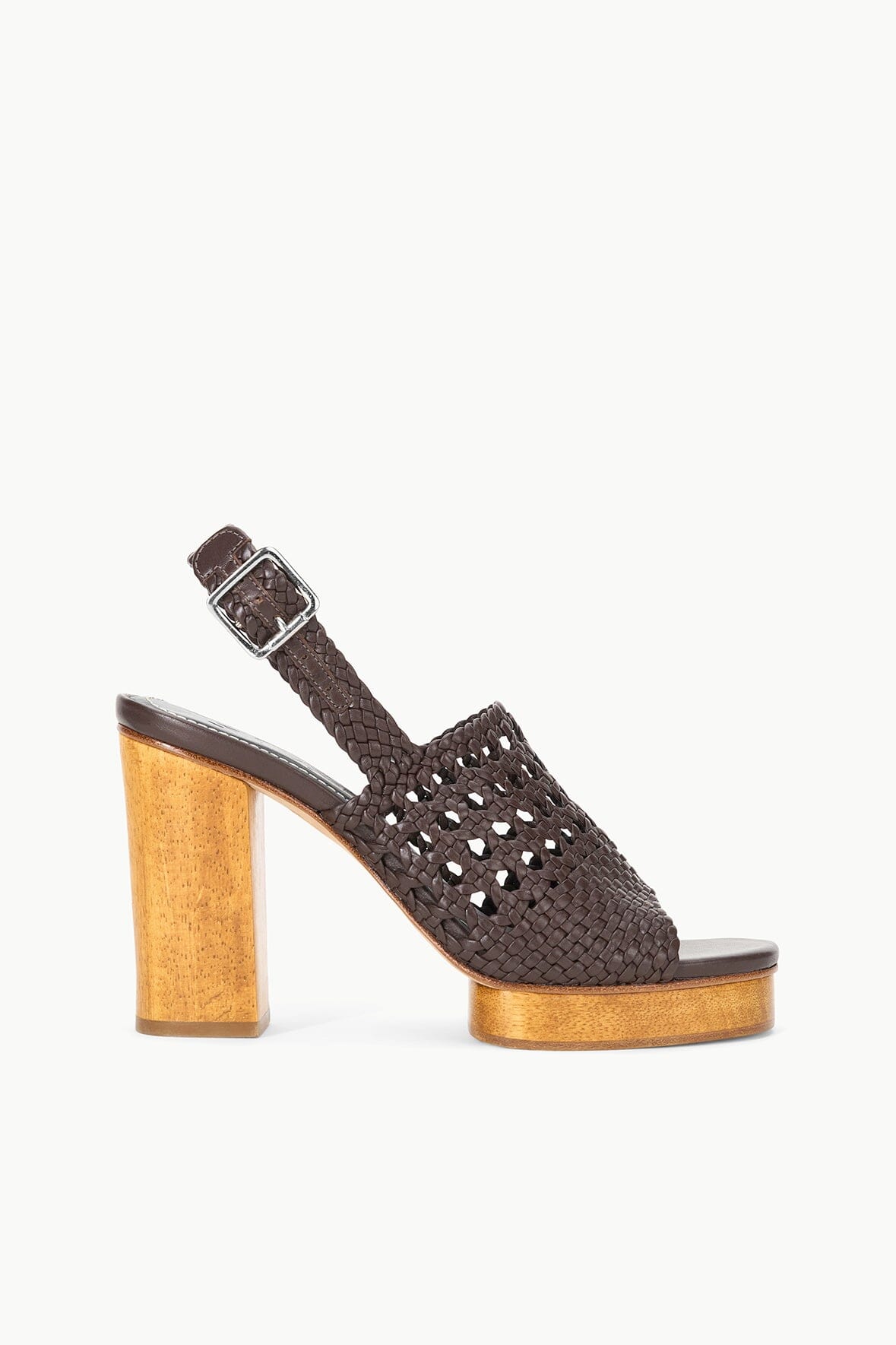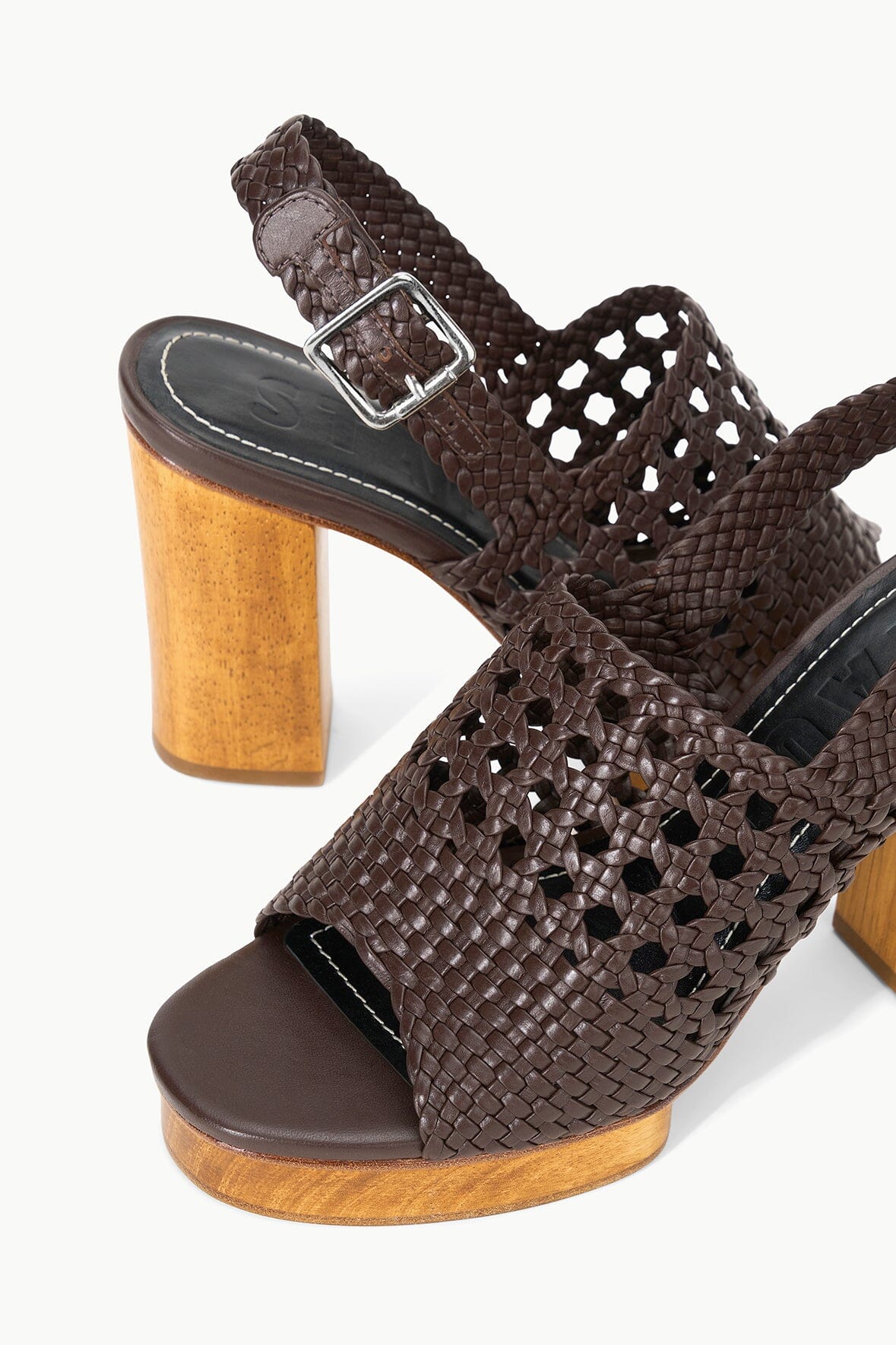 The Martina Platform is a new block heel sandal for Spring. This style features a wooden sole and a woven leather upper, with an adjustable ankle strap.