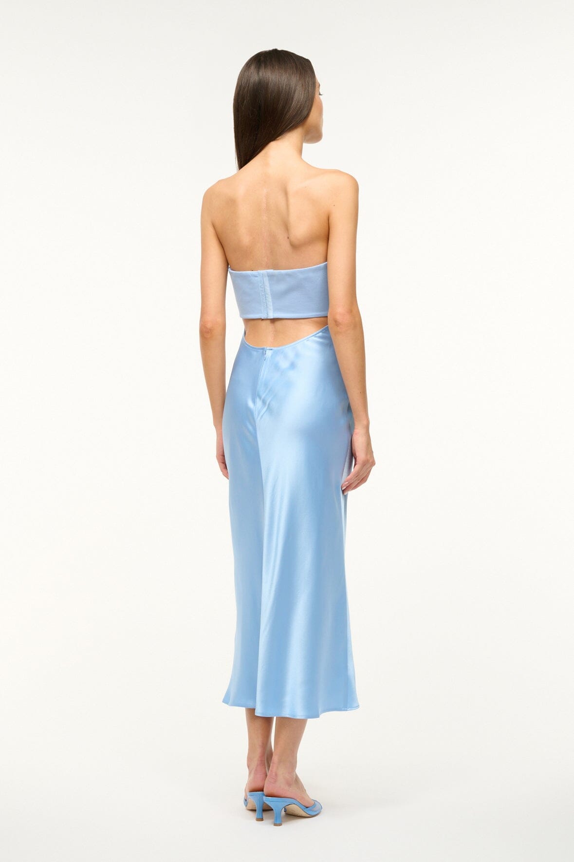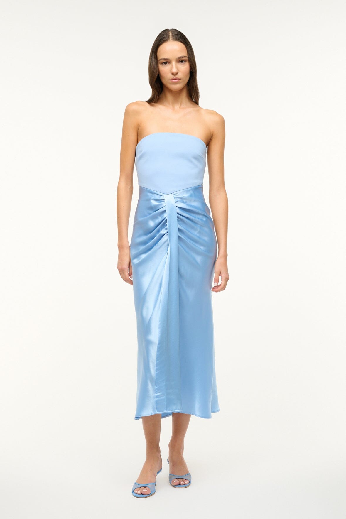 An update to our timeless Wayfaring Dress, the Midi Wayfaring Dress is a midi length evening dress with a ponte bodice and a ruched satin skirt. This strapless dress features a strapless bra-friendly bodice, with an open lower back.