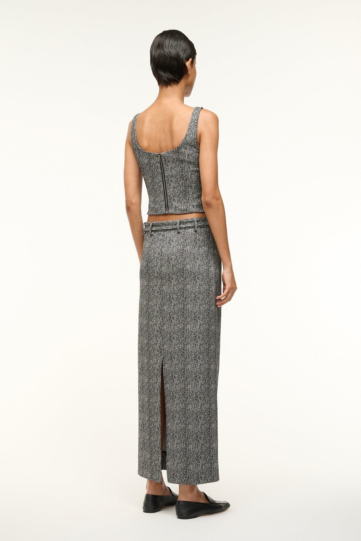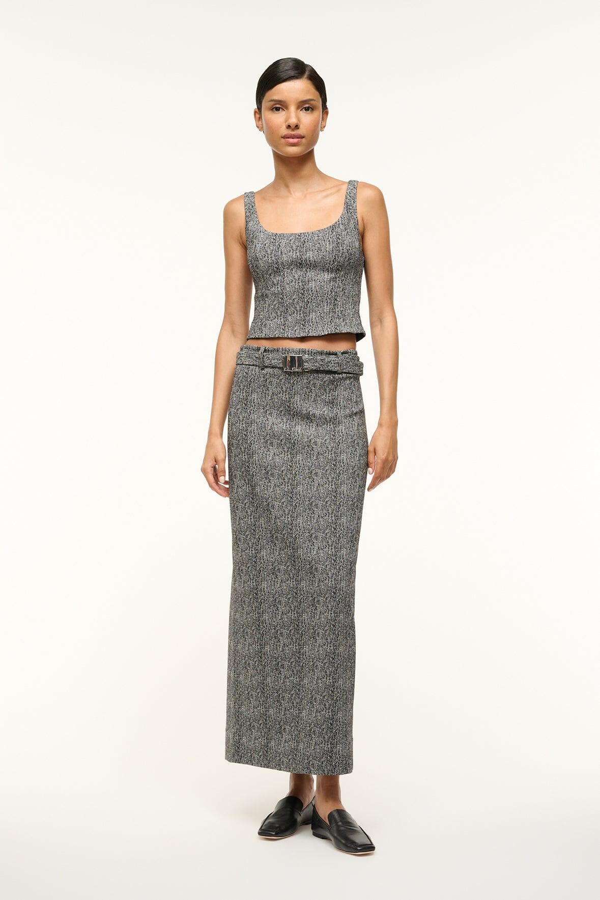 The Murray Skirt is a low-rise column skirt with a removable metal logo skater belt and a back slit. Wear with the matching Wells Top for a coordinating set.