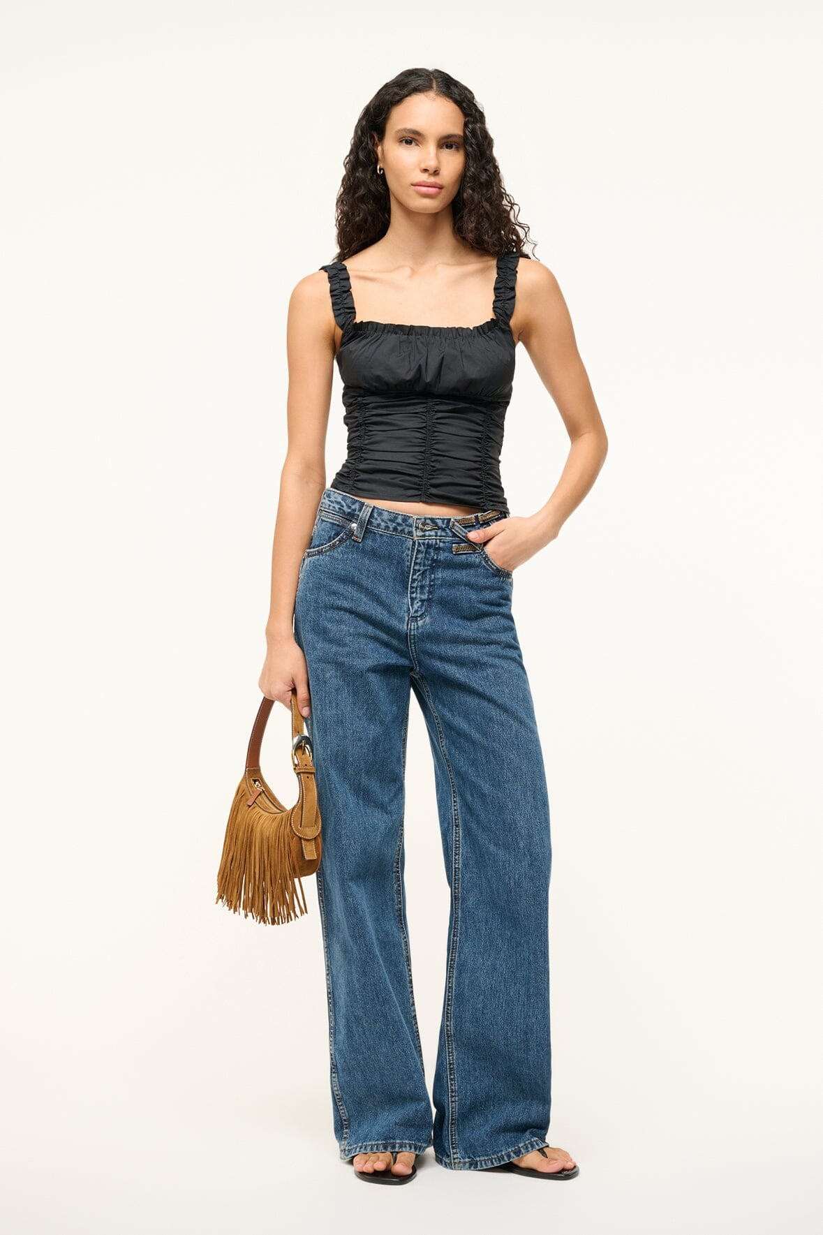 The Nic is a scoop neck sleeveless top made in our popular stretch poplin fabric, featuring ruffled straps and shirred corset seaming at the waist.