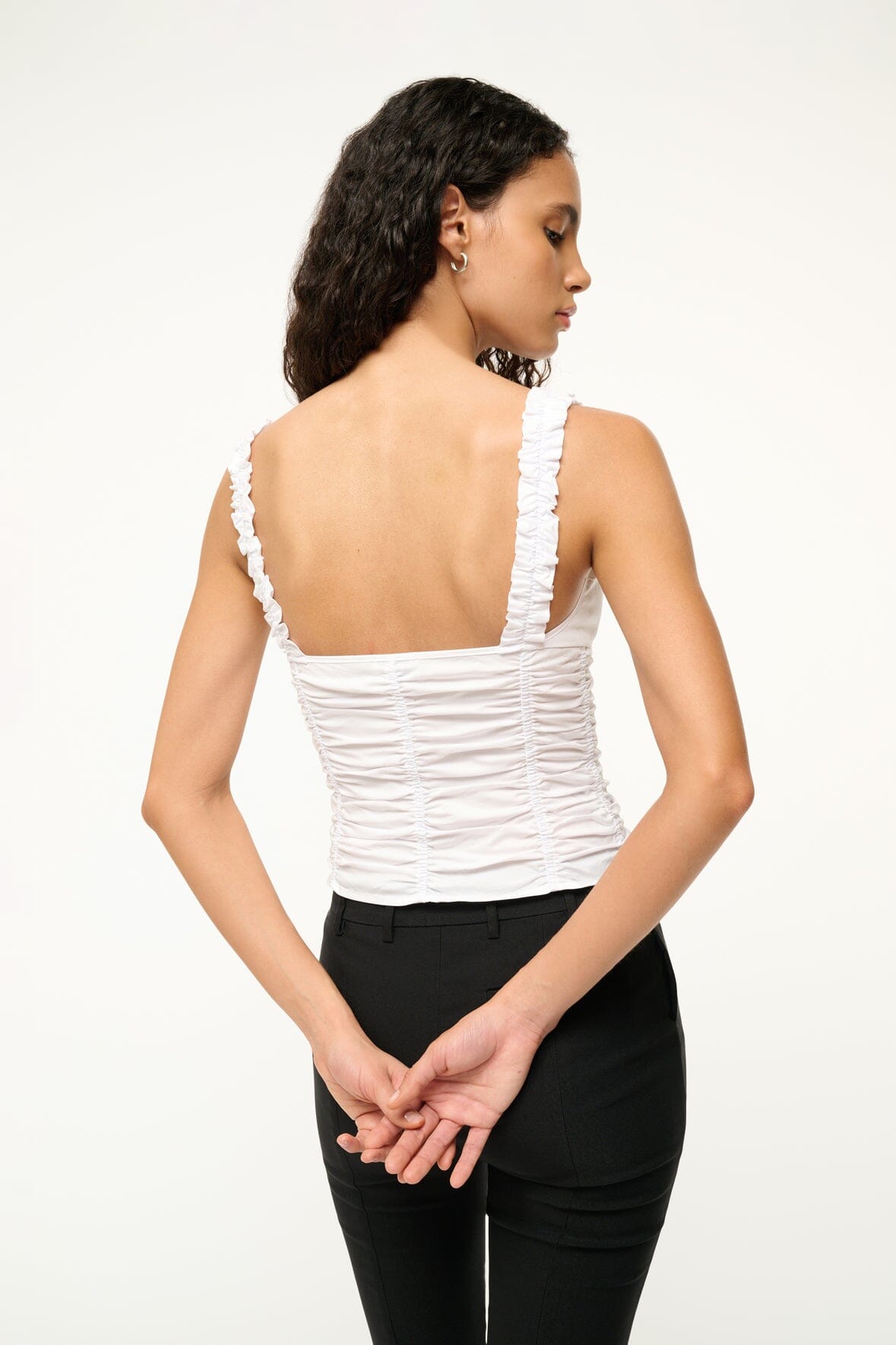 The Nic is a scoop neck sleeveless top made in our popular stretch poplin fabric, featuring ruffled straps and shirred corset seaming at the waist.