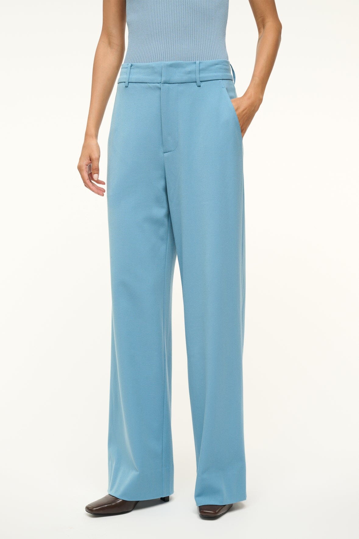 The Prince Pant is a flat front wide leg pant made from soft suiting. It features a zipper fly and back welt pockets.