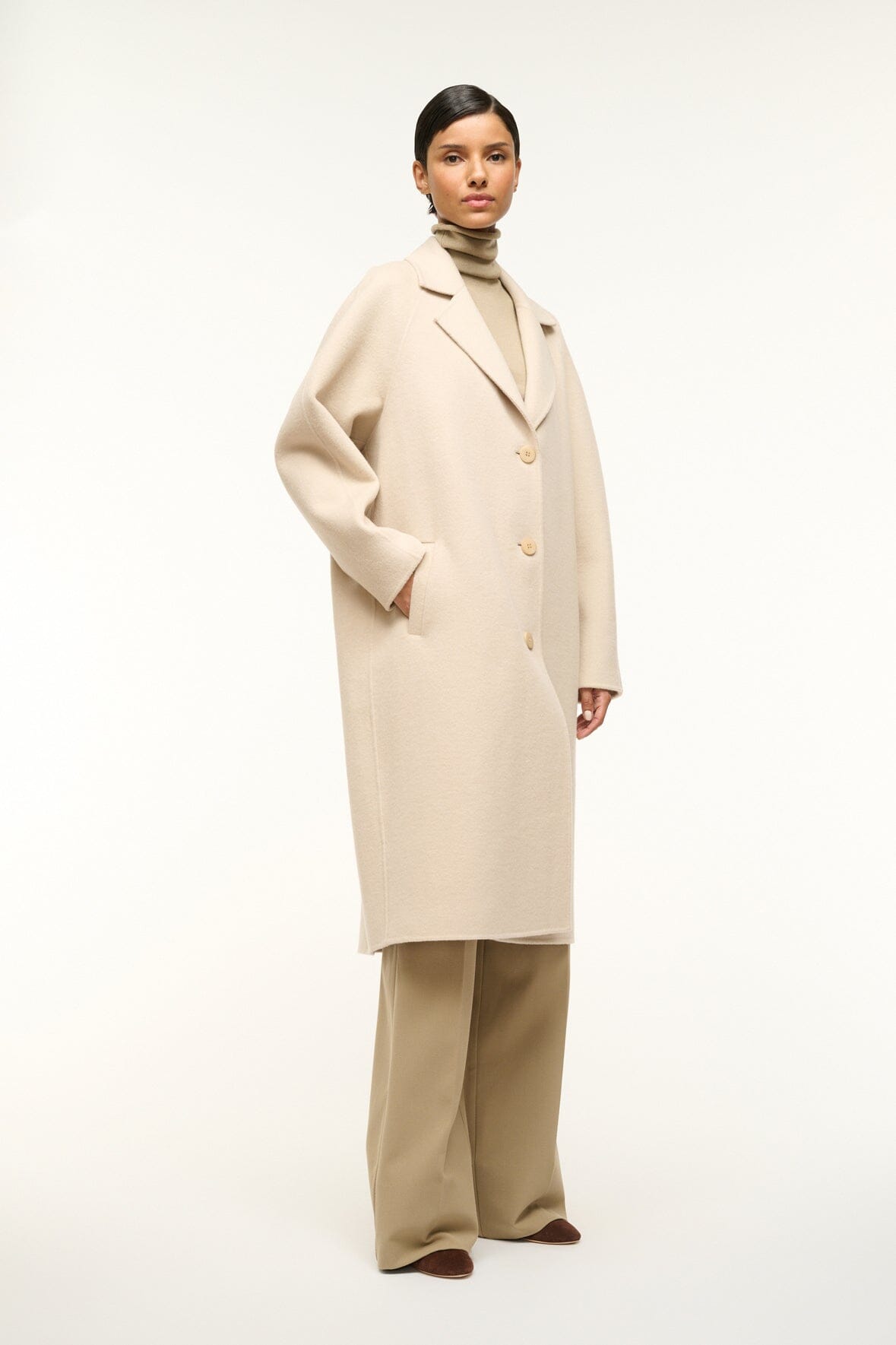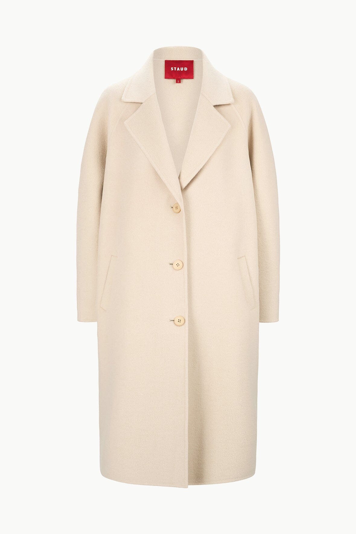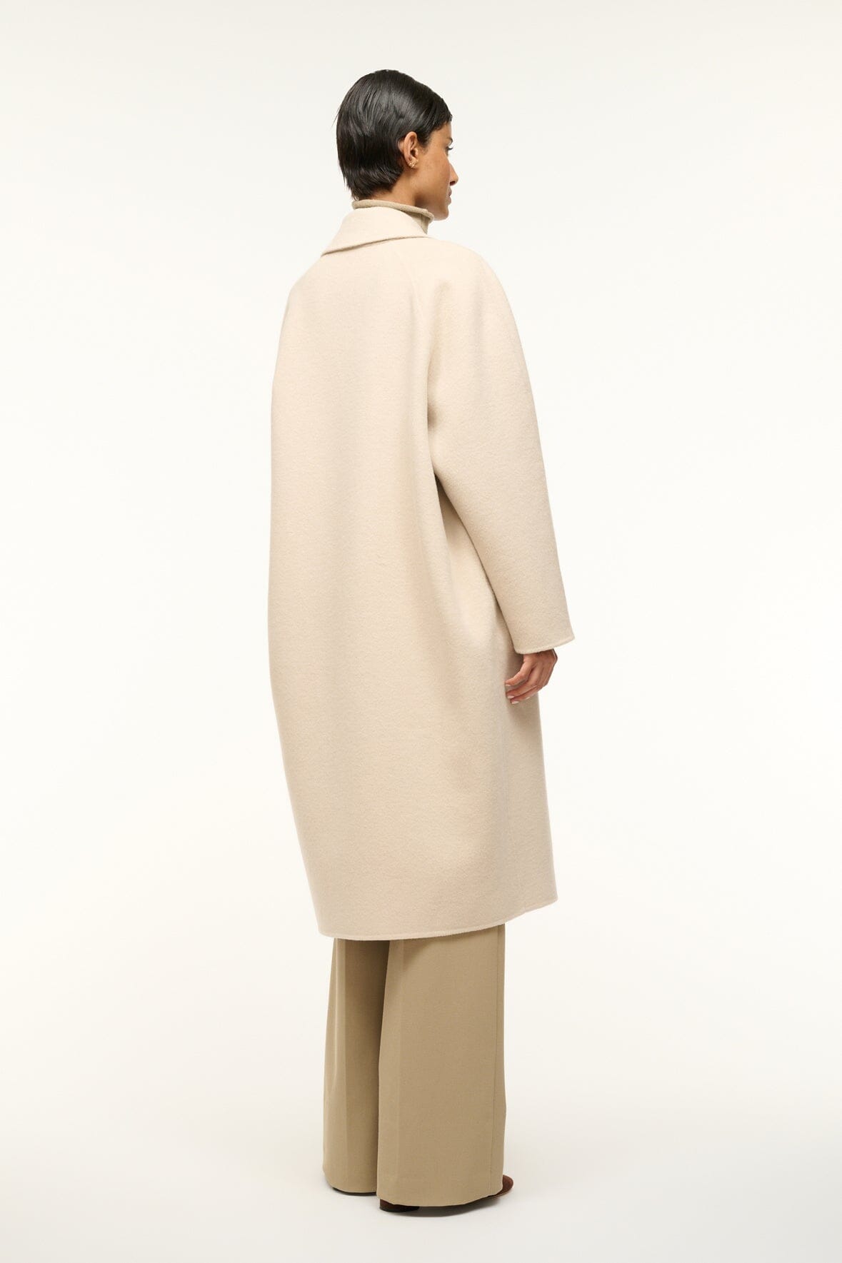 The Chrysalis Coat is a wool cocoon coat with a center front button closure, notched collar and raglan sleeves.