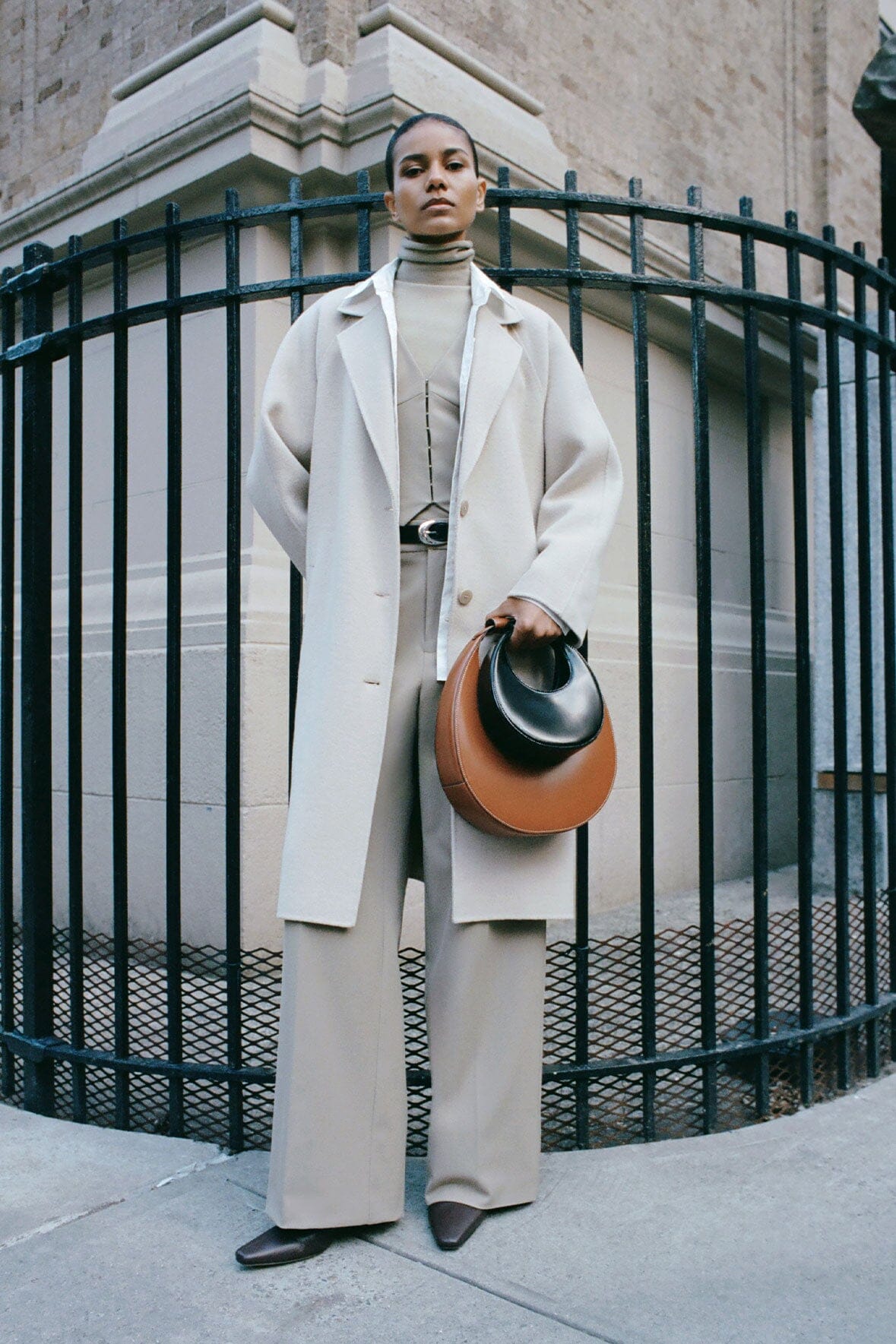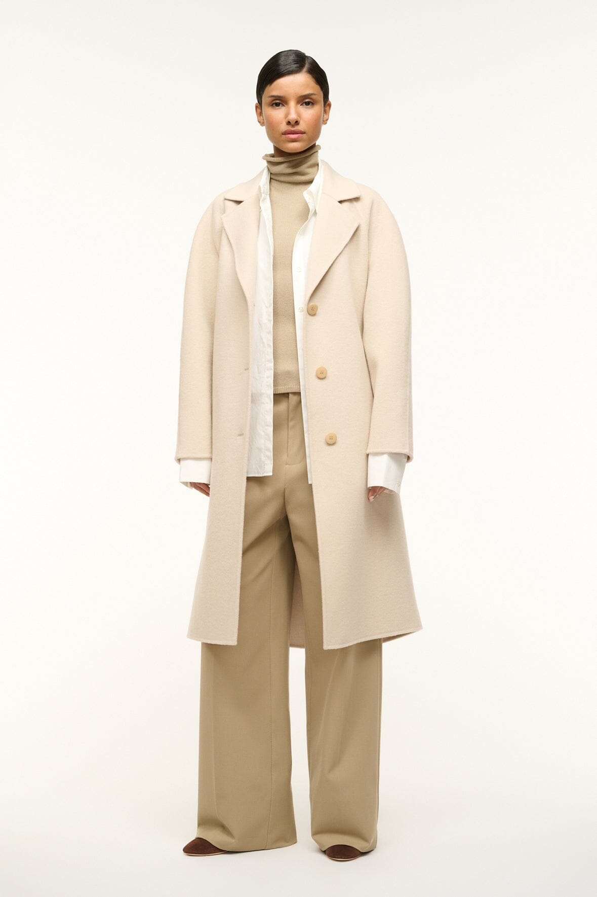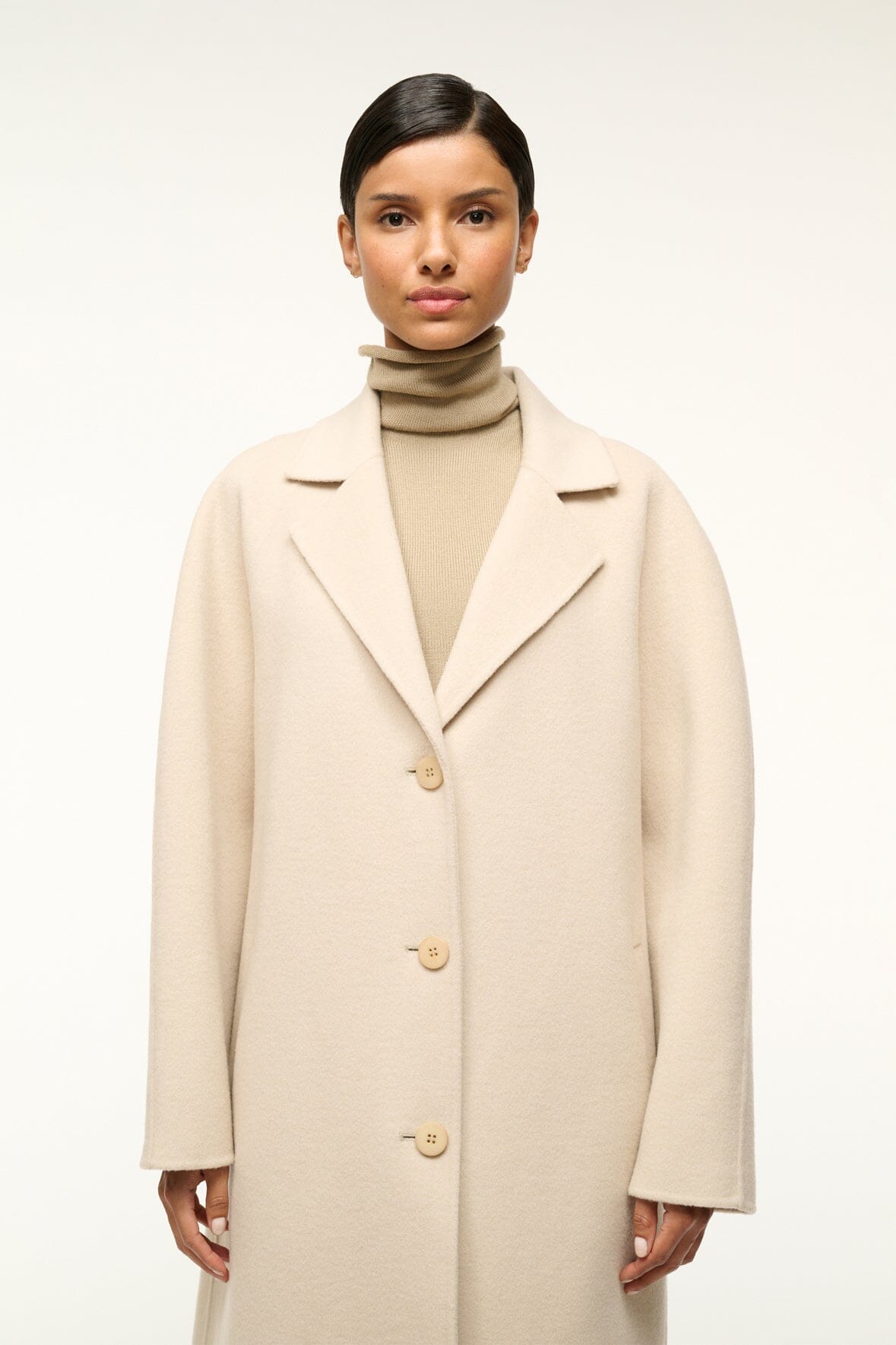 The Chrysalis Coat is a wool cocoon coat with a center front button closure, notched collar and raglan sleeves.