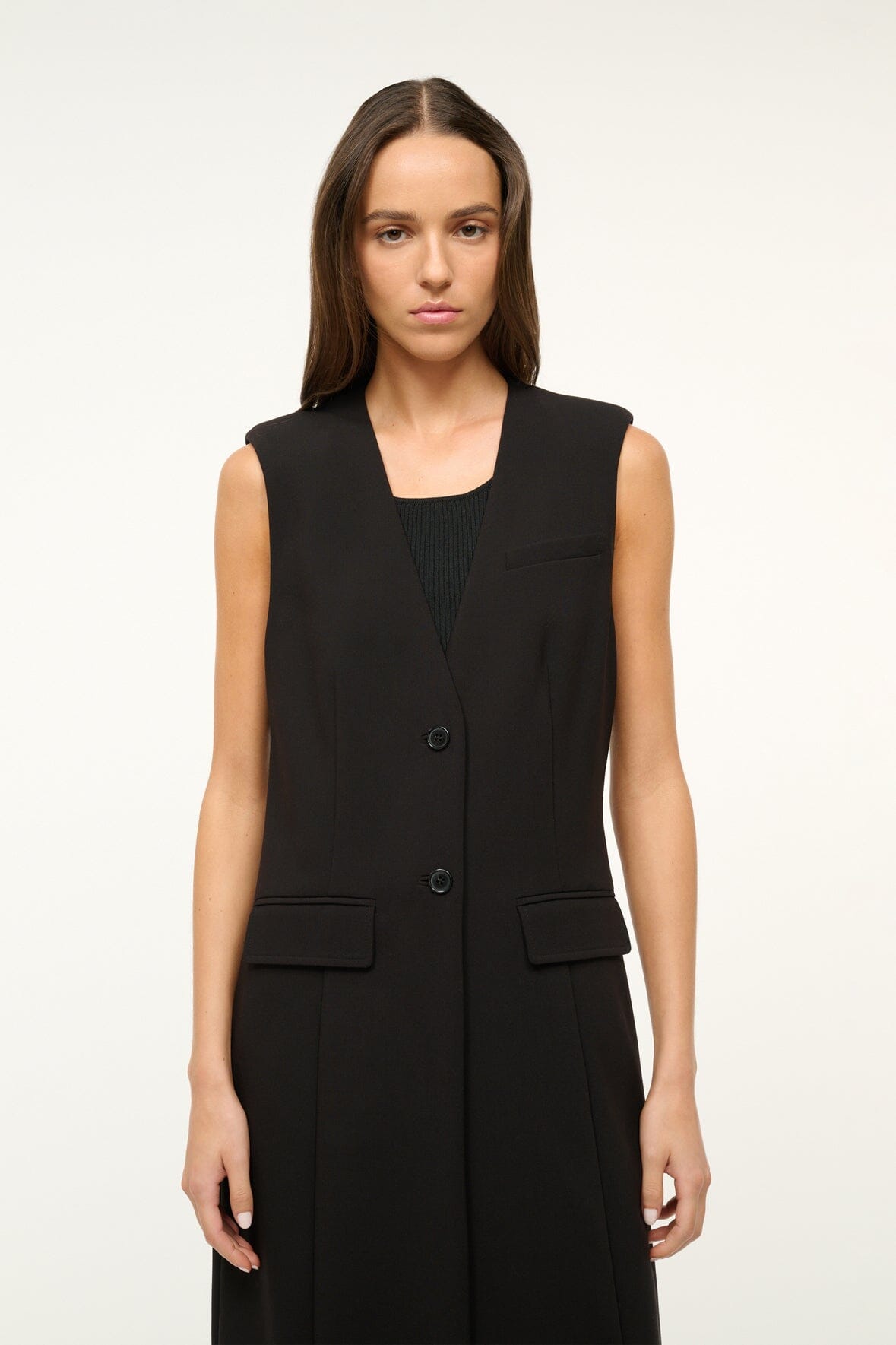 The Varick Vest is a transitional suiting piece with lightly padded shoulders and a center front button closure. It can be worn as a top or as a layering piece paired with our suiting essentials.