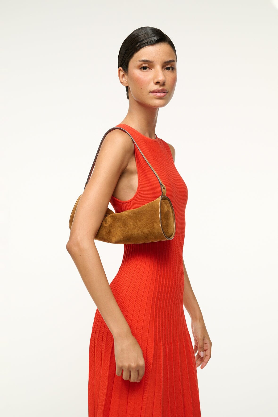 A soft suede shoulder bag with a fixed shoulder strap, zip closure and interior zip pocket.