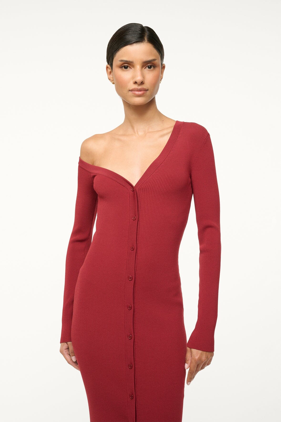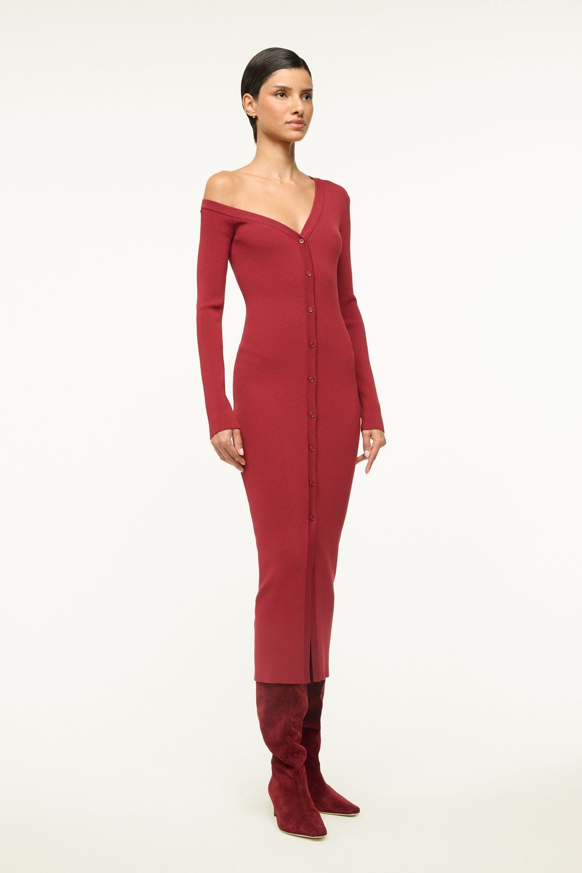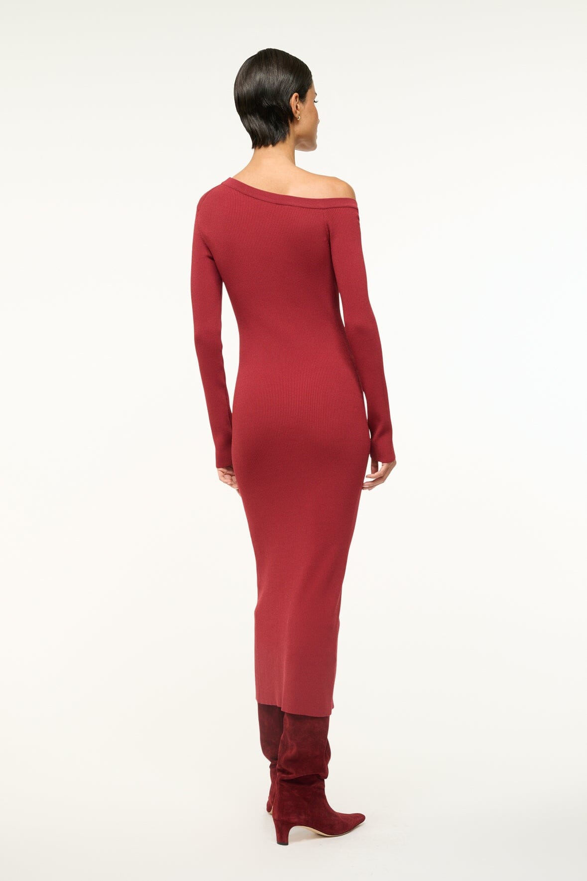 The Craftsman Sweater Dress is our update to the Craftsman Sweater. This style is an off-one-shoulder fitted midi dress.