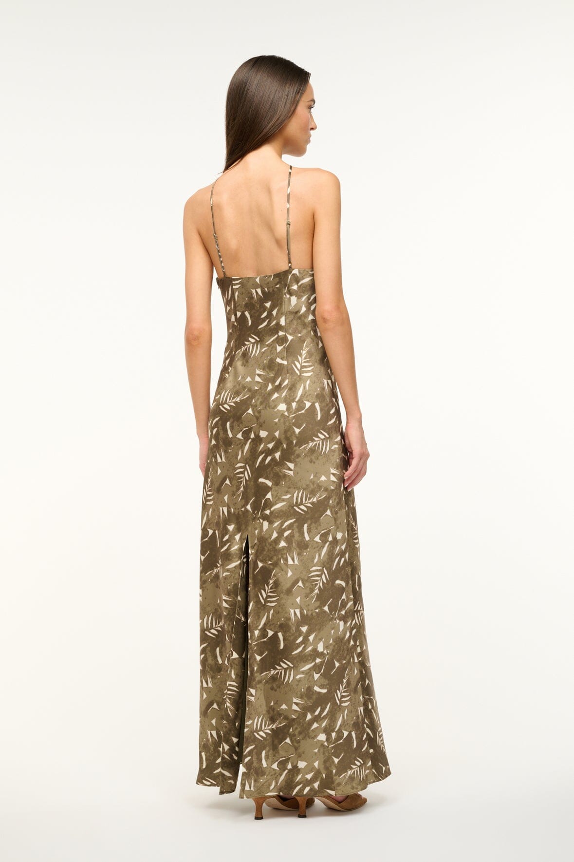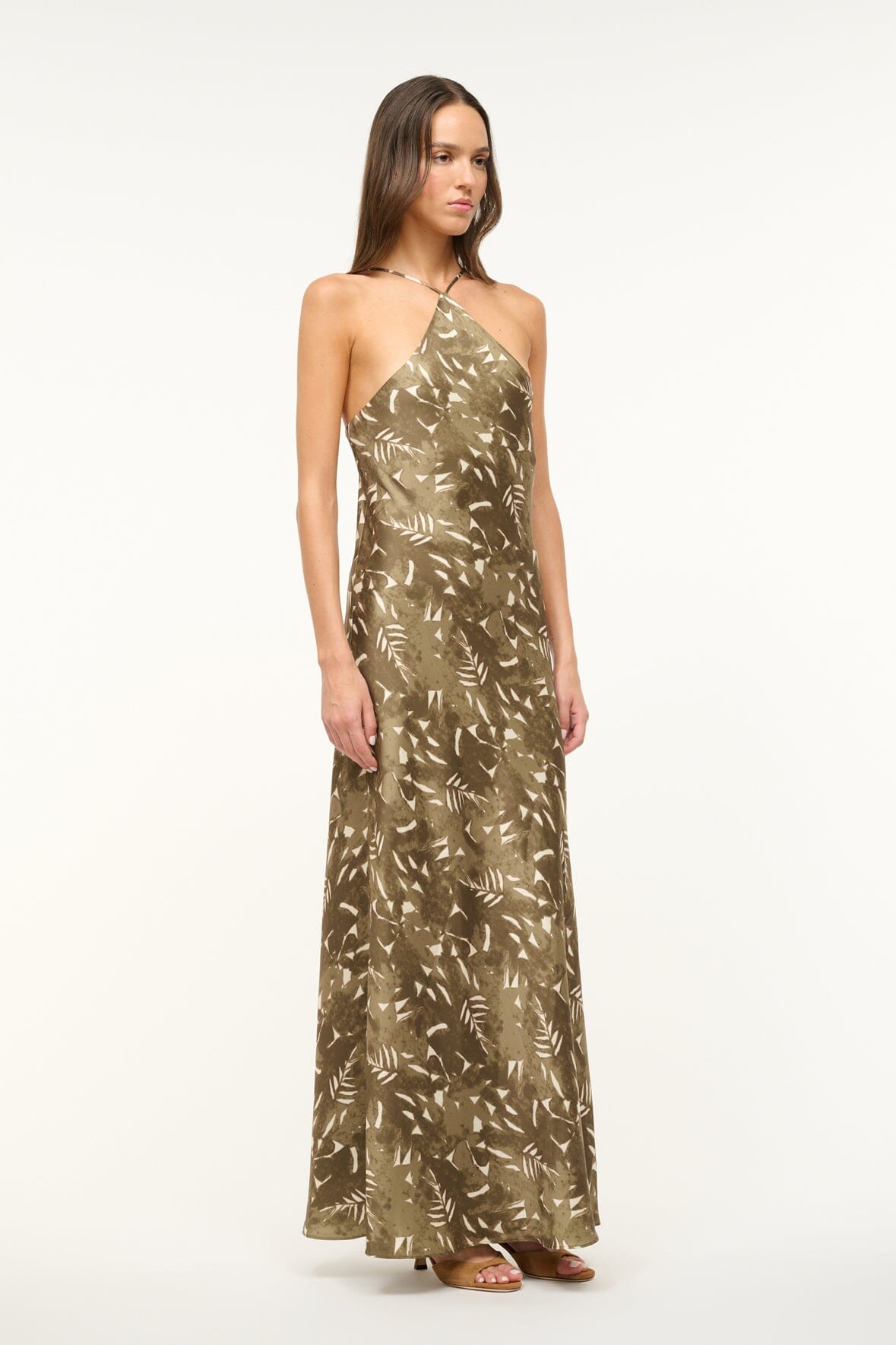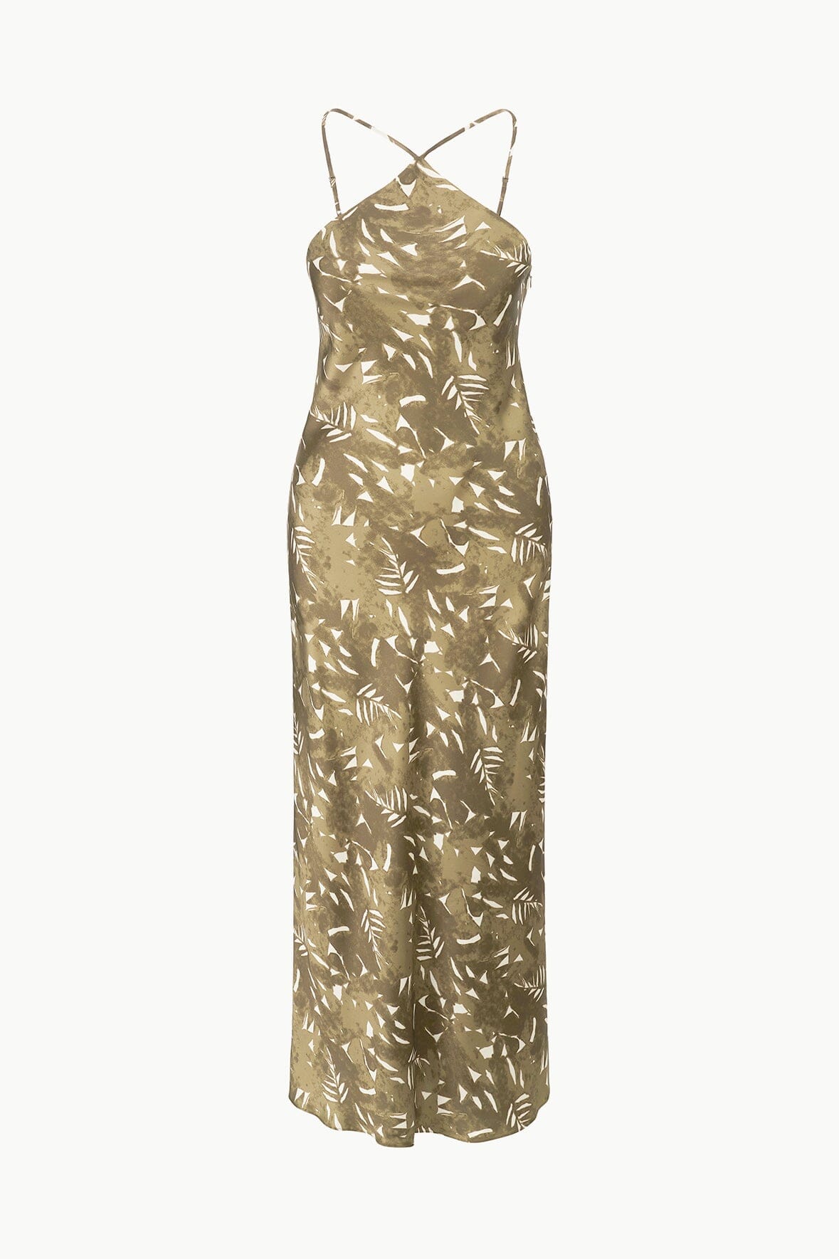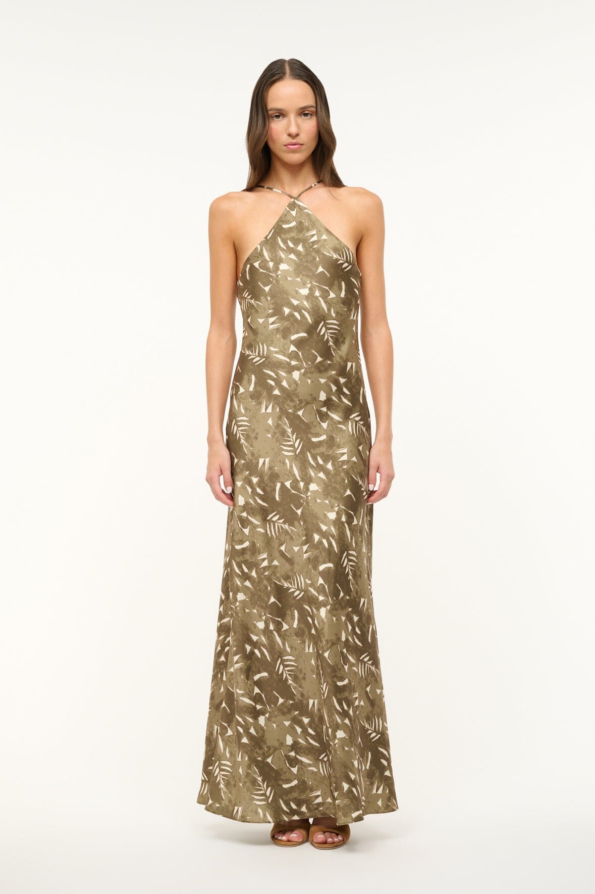 A fitted bias cut maxi dress featuring a painted palm pattern. The Cubism Dress features a halter neckline and adjustable crossover straps at the back.