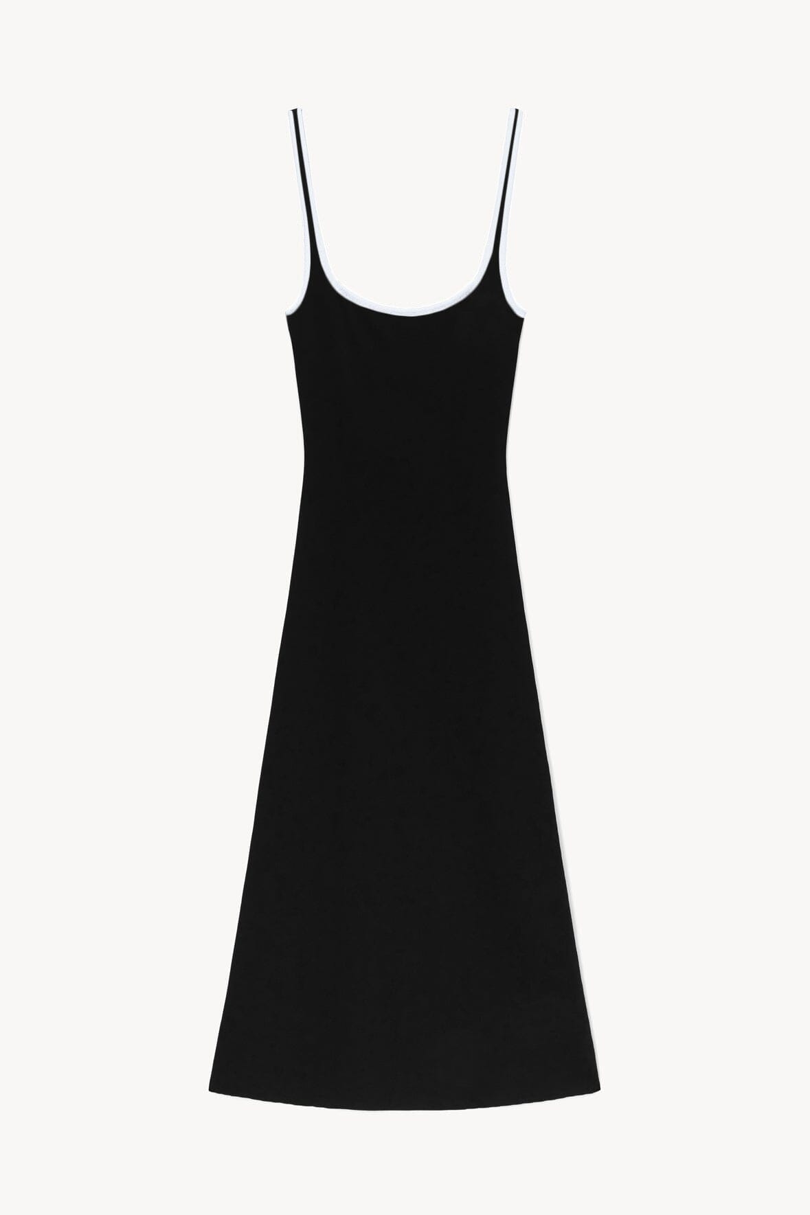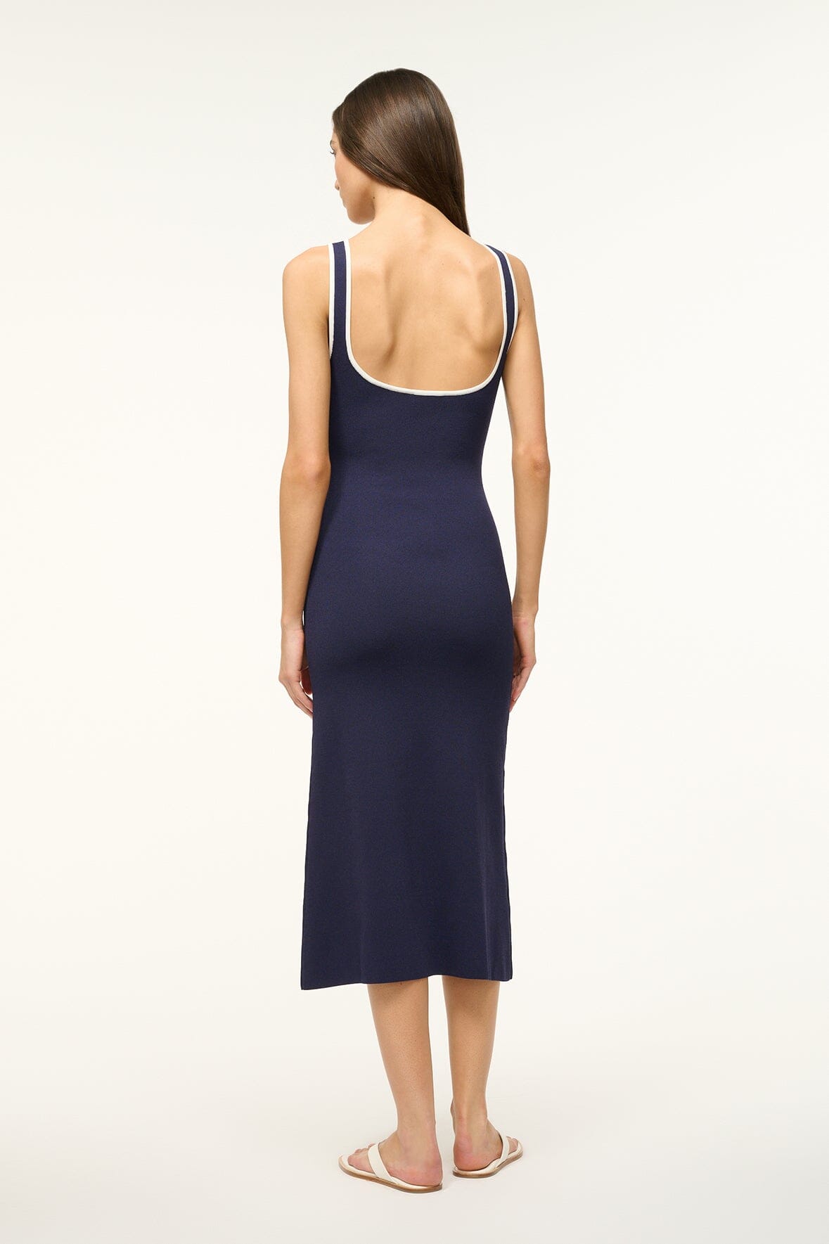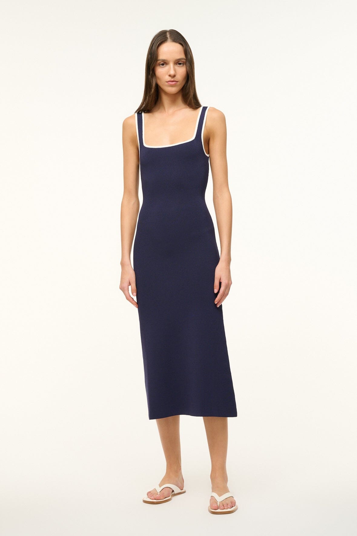 A fitted sleeveless dress made out of compact knit fabric. This style features a wide square neckline and midi length.