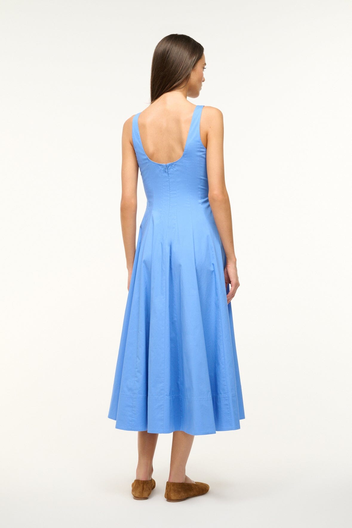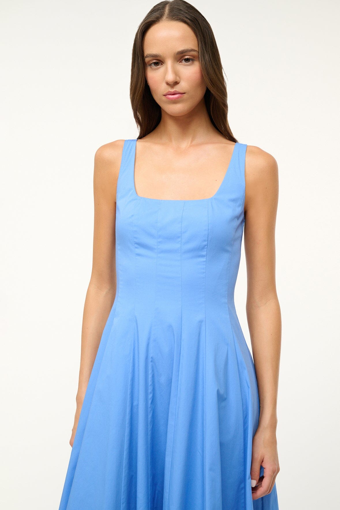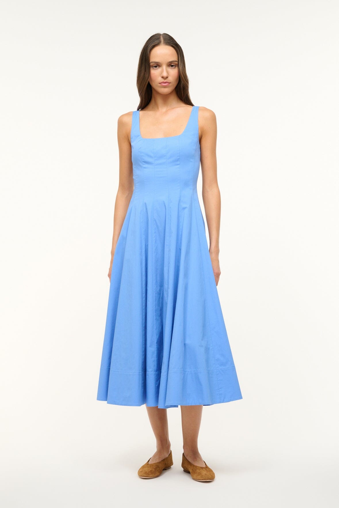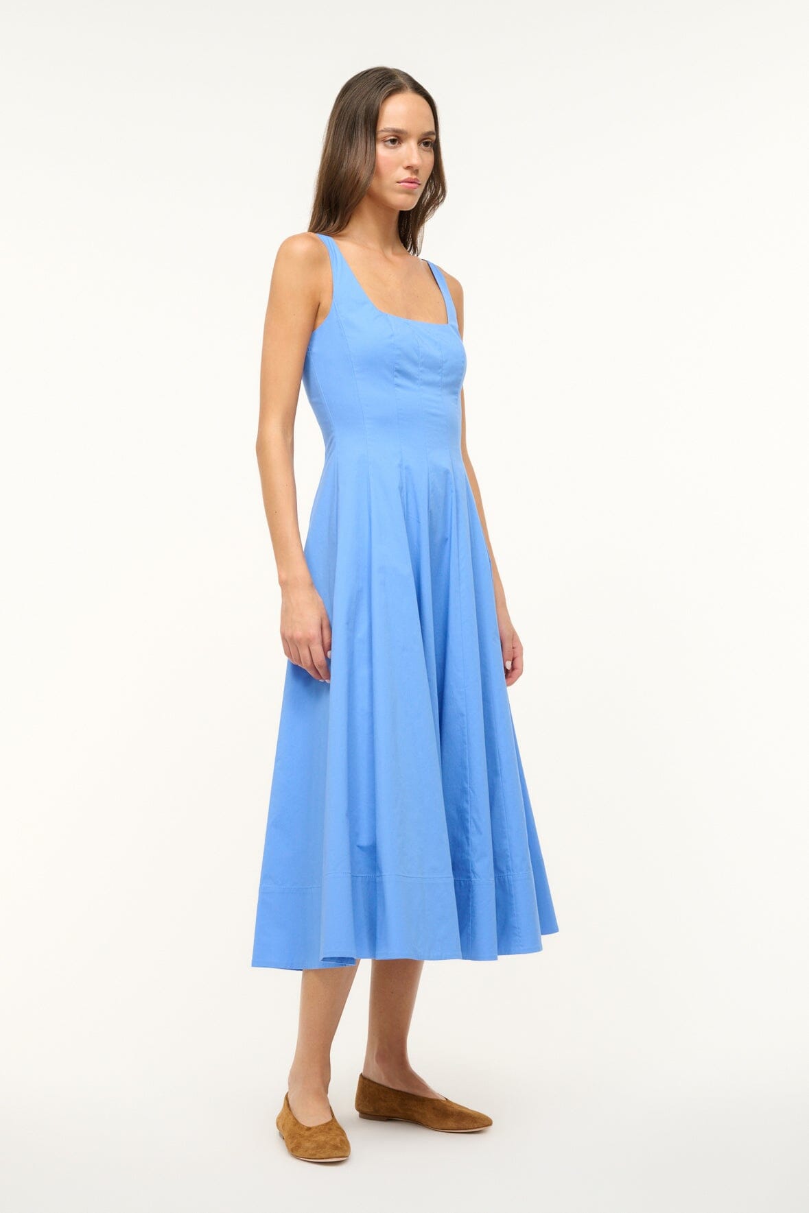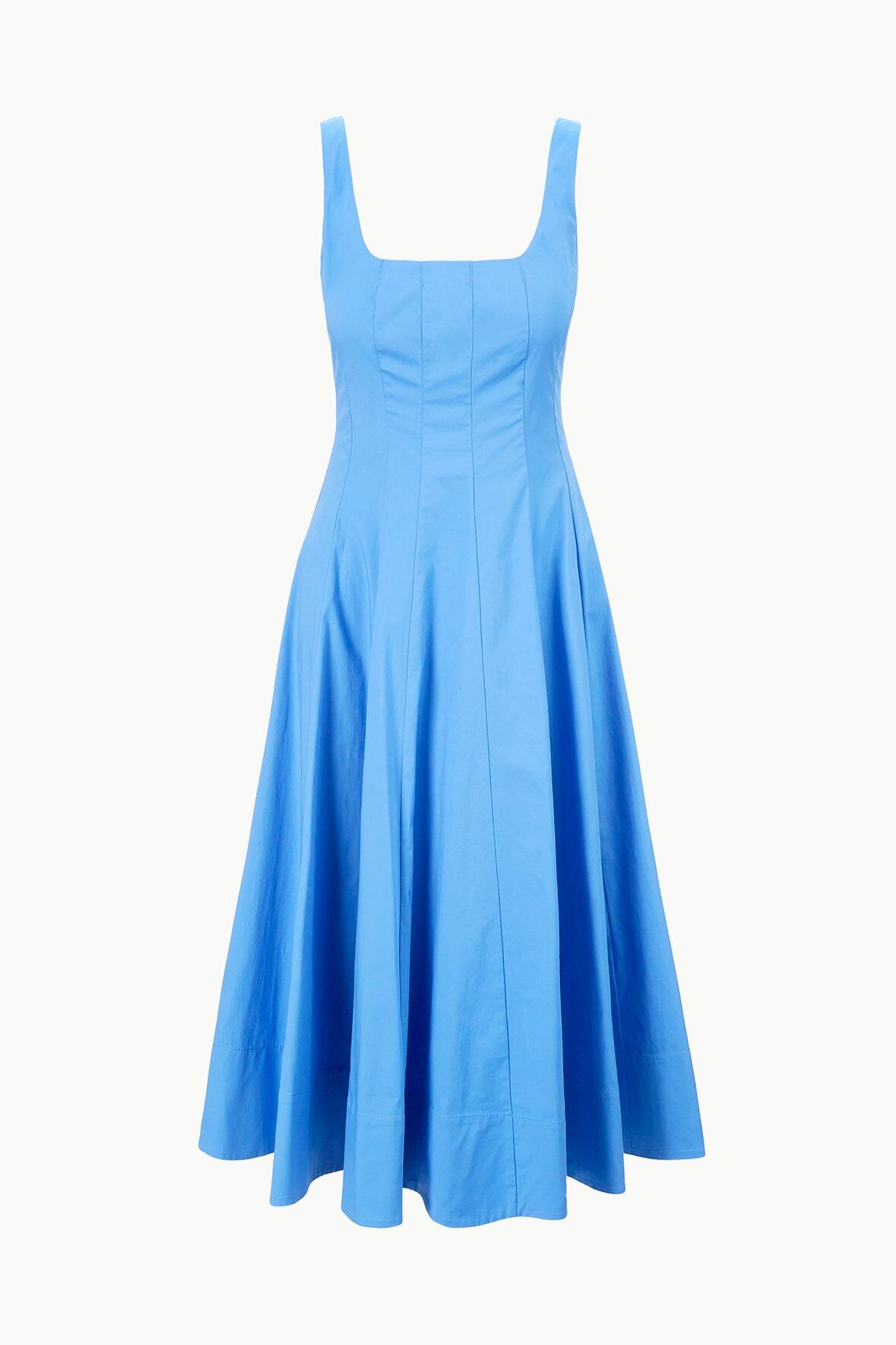The Wells Dress features a corset-style panel construction to create a flattering, fitted shape through the waist and a full skirt which hits just below the knee. Constructed in lightweight cotton poplin.