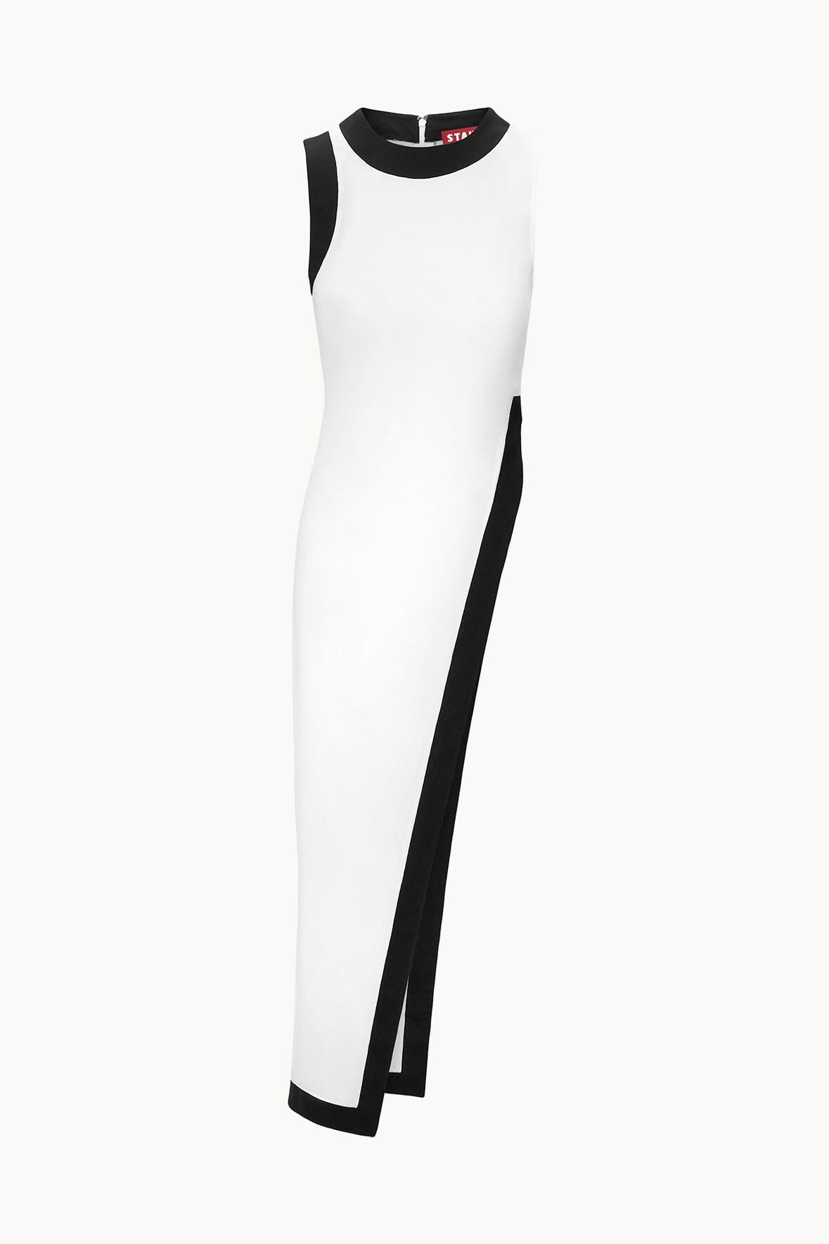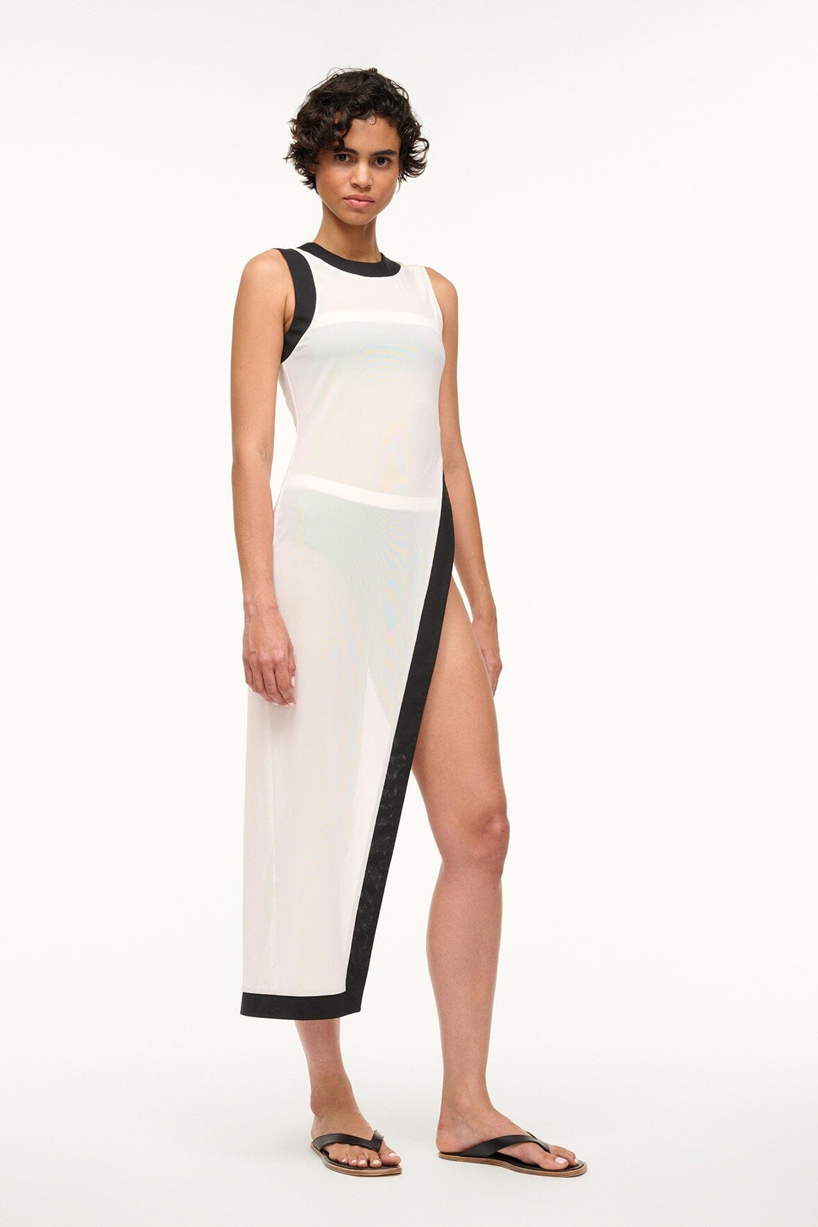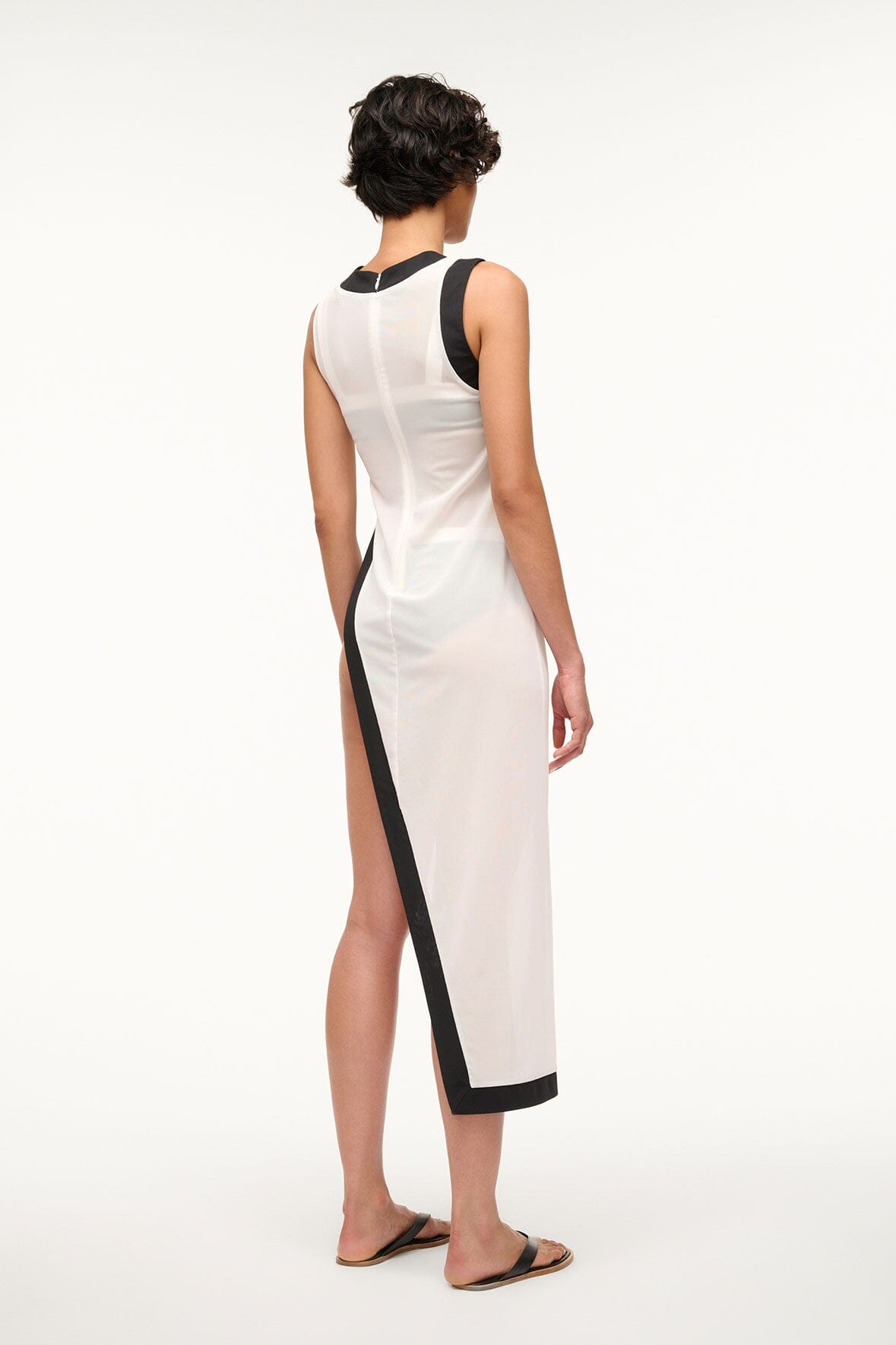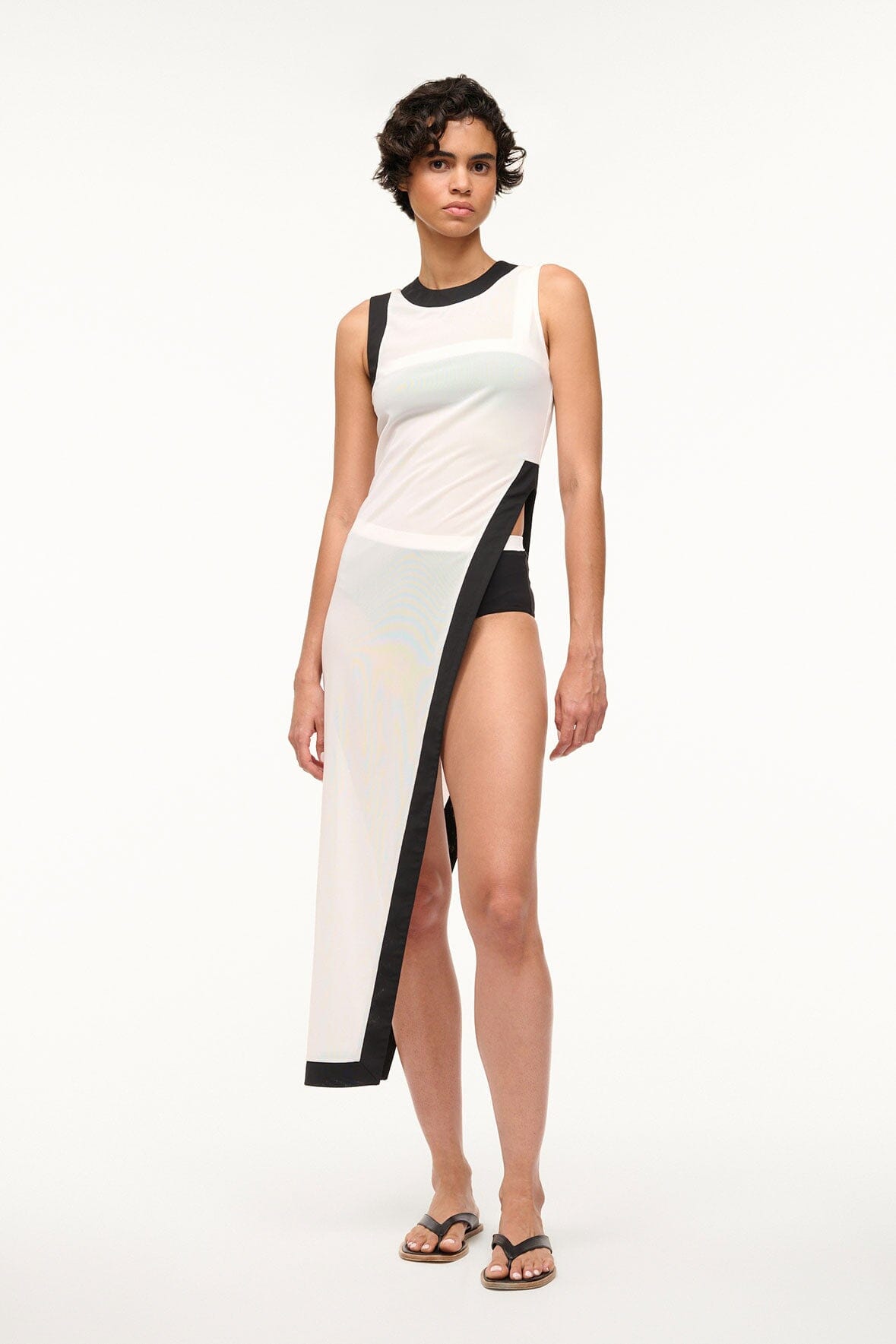 The Pointer is an asymmetrical coverup top made from our stretchy power mesh fabric. It features a center back zipper and a contrasting trim detail.