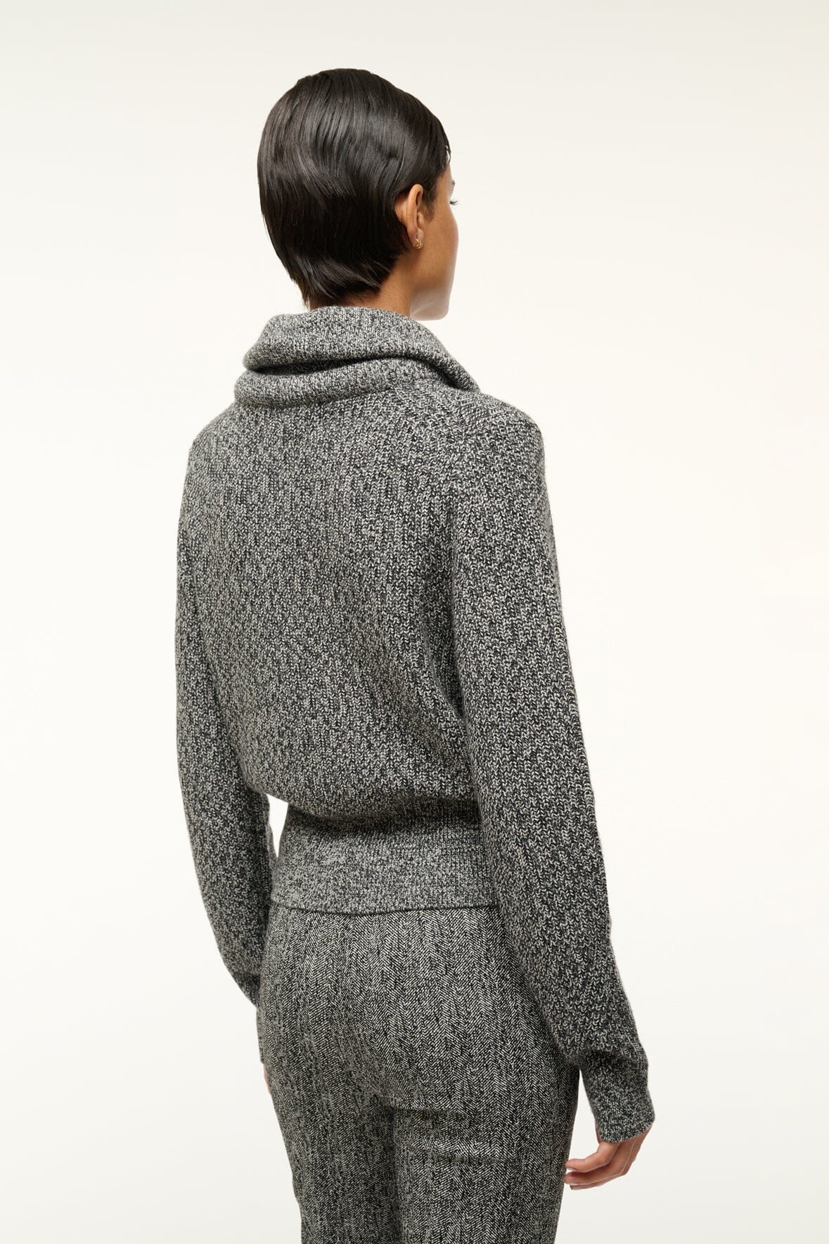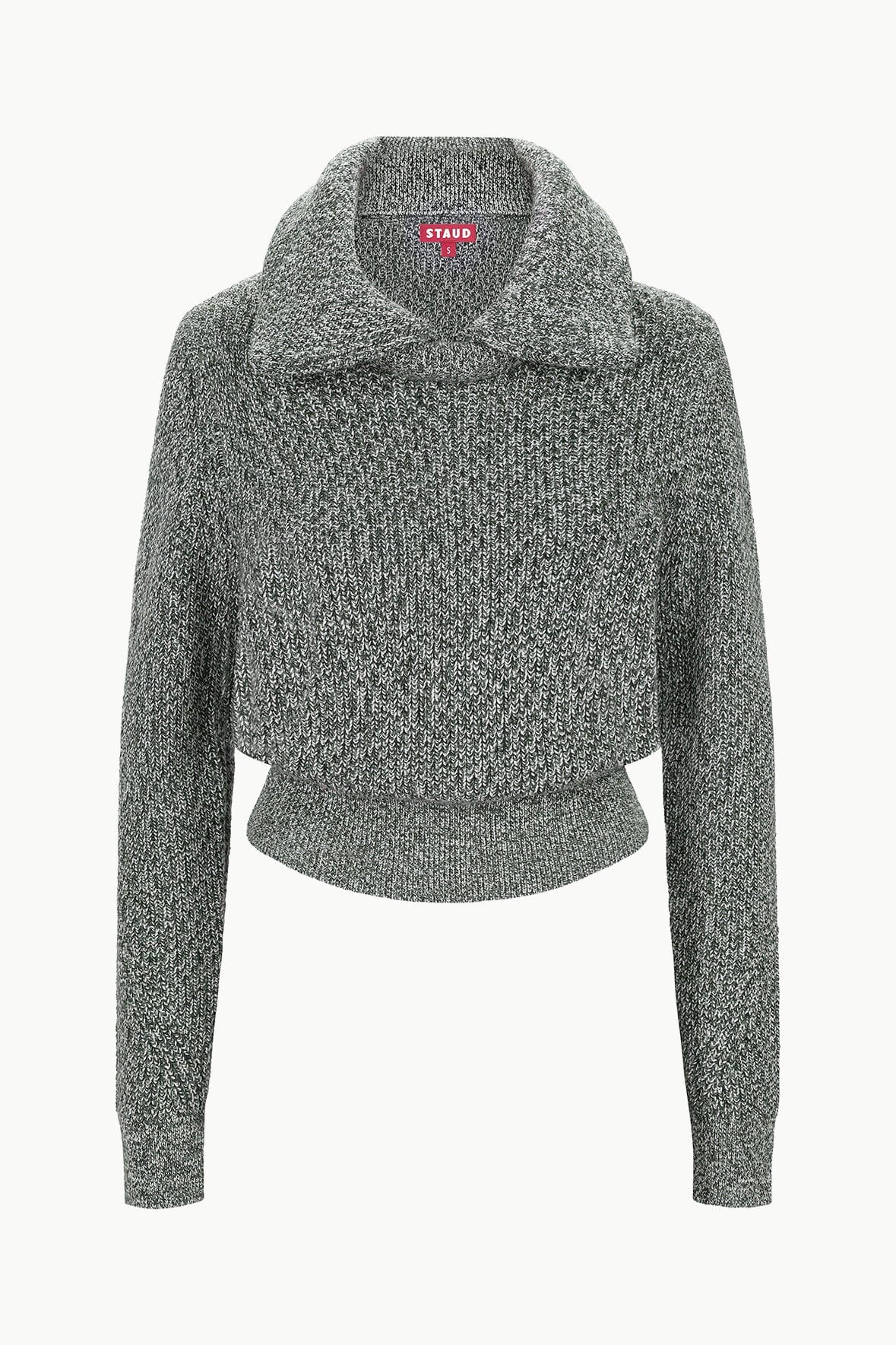 The Christopher Sweater is a chunky marled knit sweater with an exaggerated double collar and ribbed cuffs and hem.