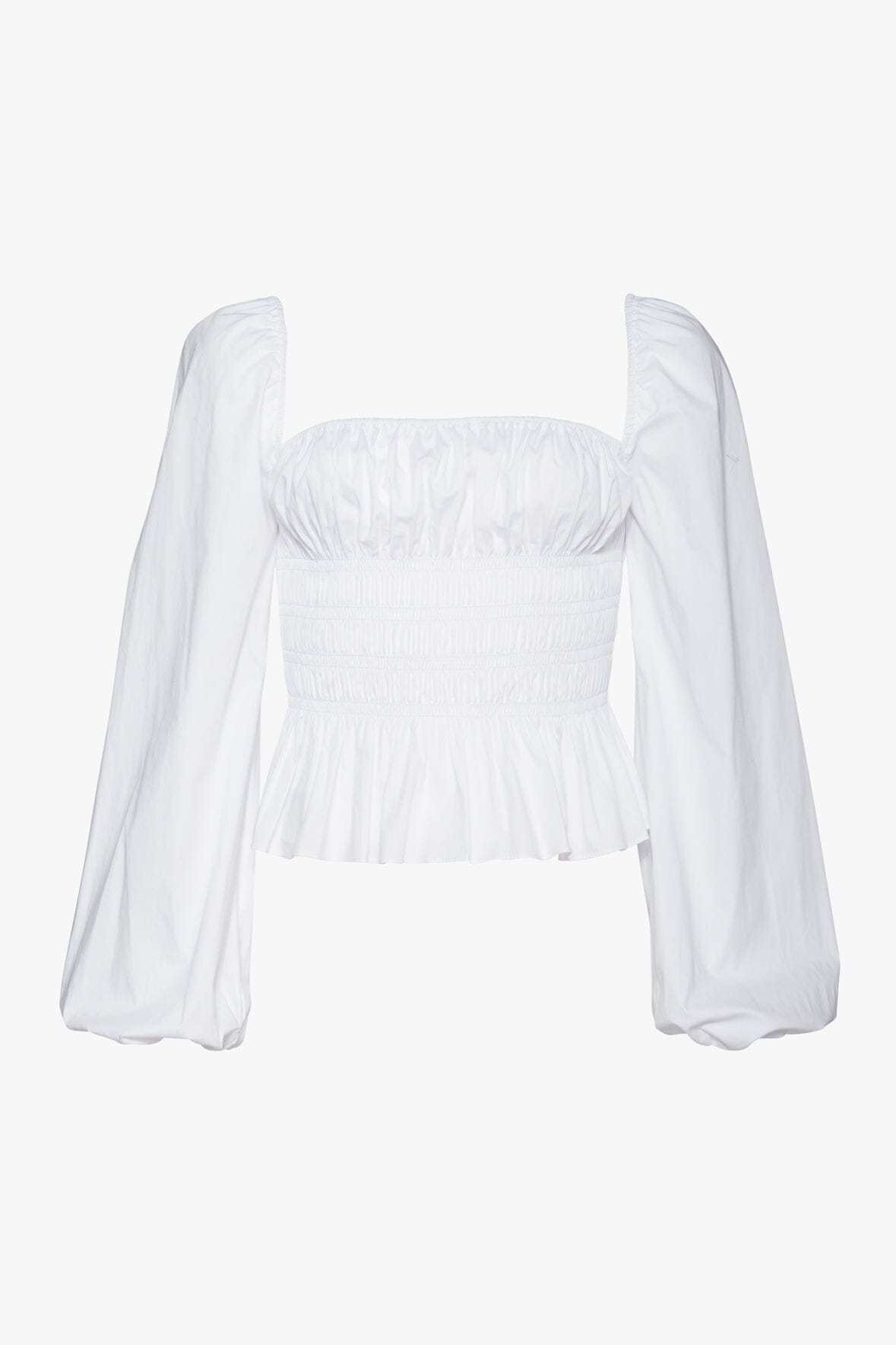 The Faye Top is a 3/4 sleeve feminine blouse. Constructed out of lightweight cotton poplin, this style features a smocked waist, square neckline and slight peplum hem.