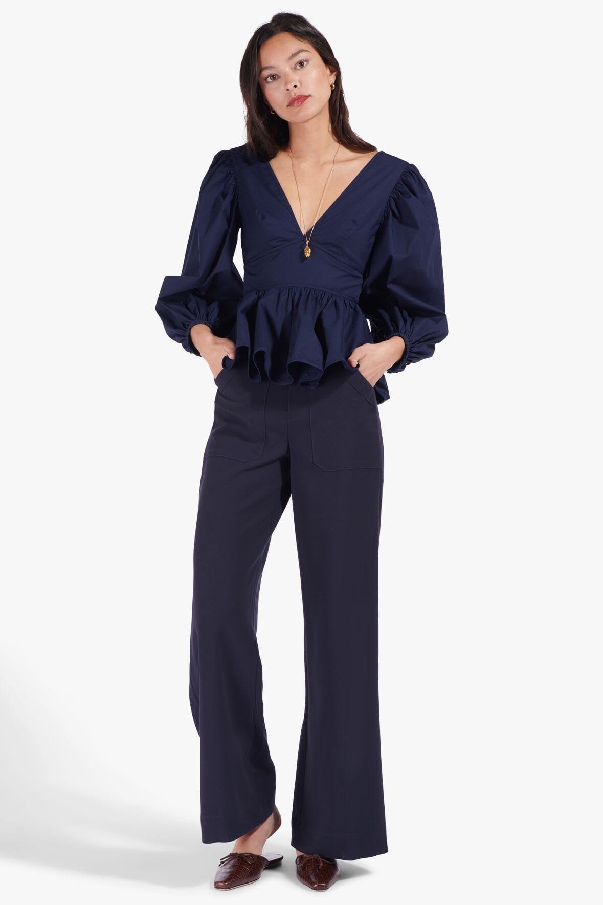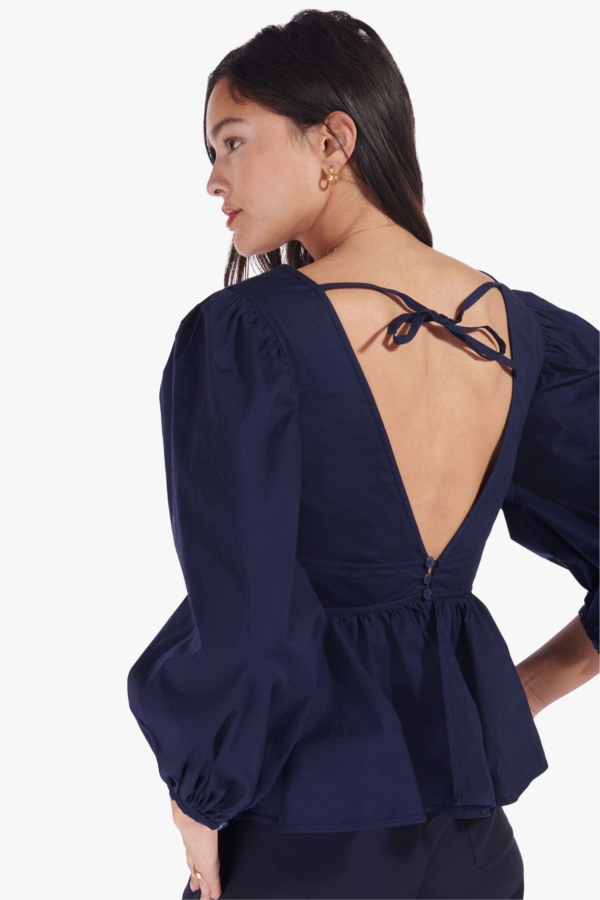 The Luna Top is made from cotton, with a cinched empire waistline. Featuring a v-neck front and back, this top has a flared hemline, partially open back detail, and a puffed long sleeve.