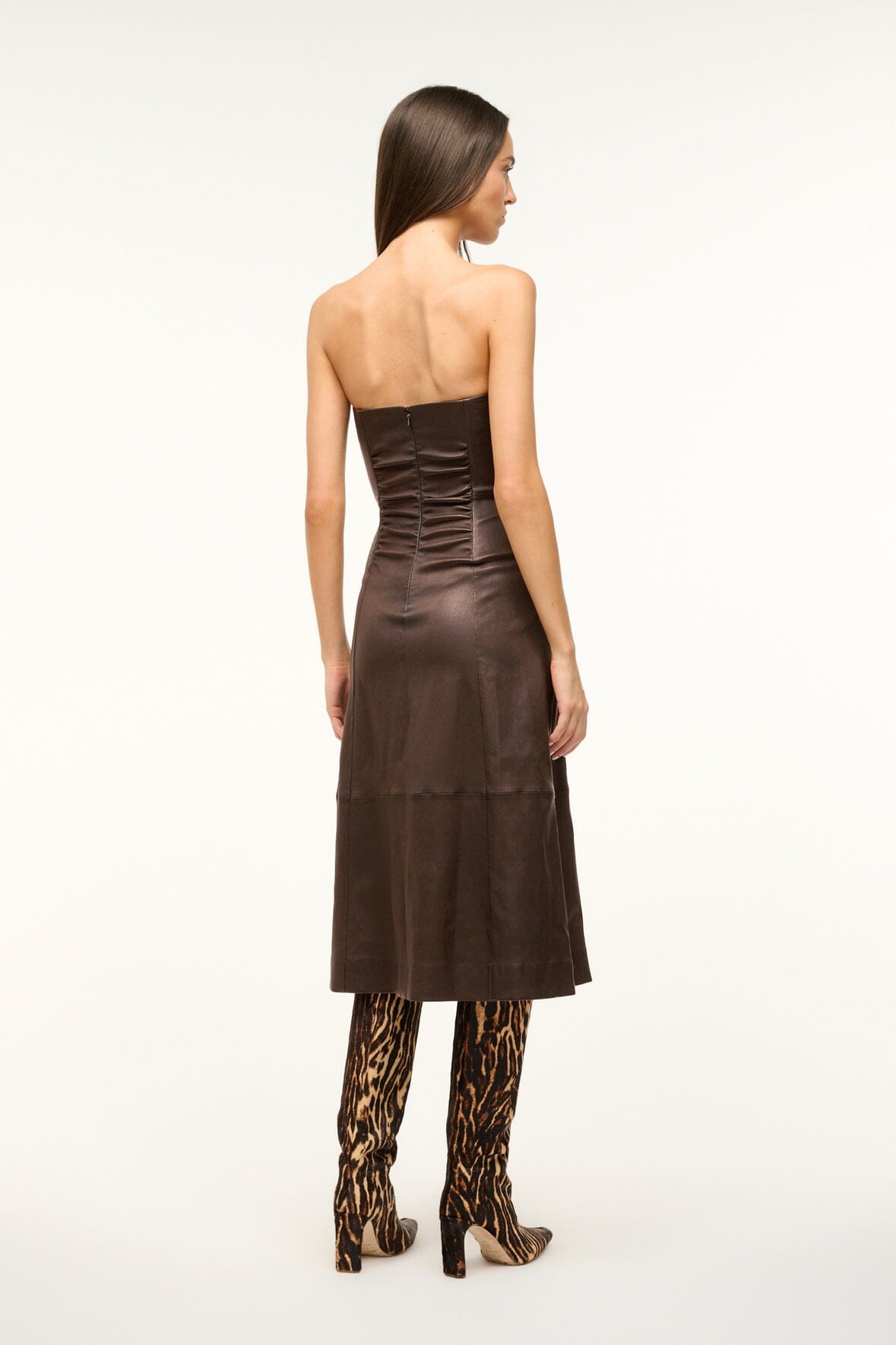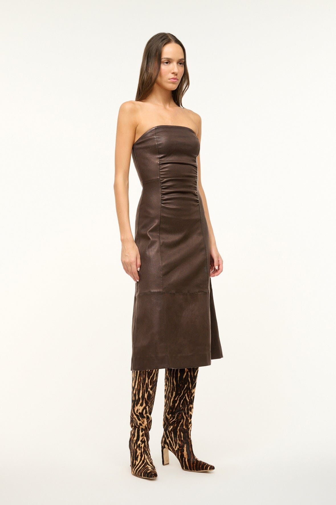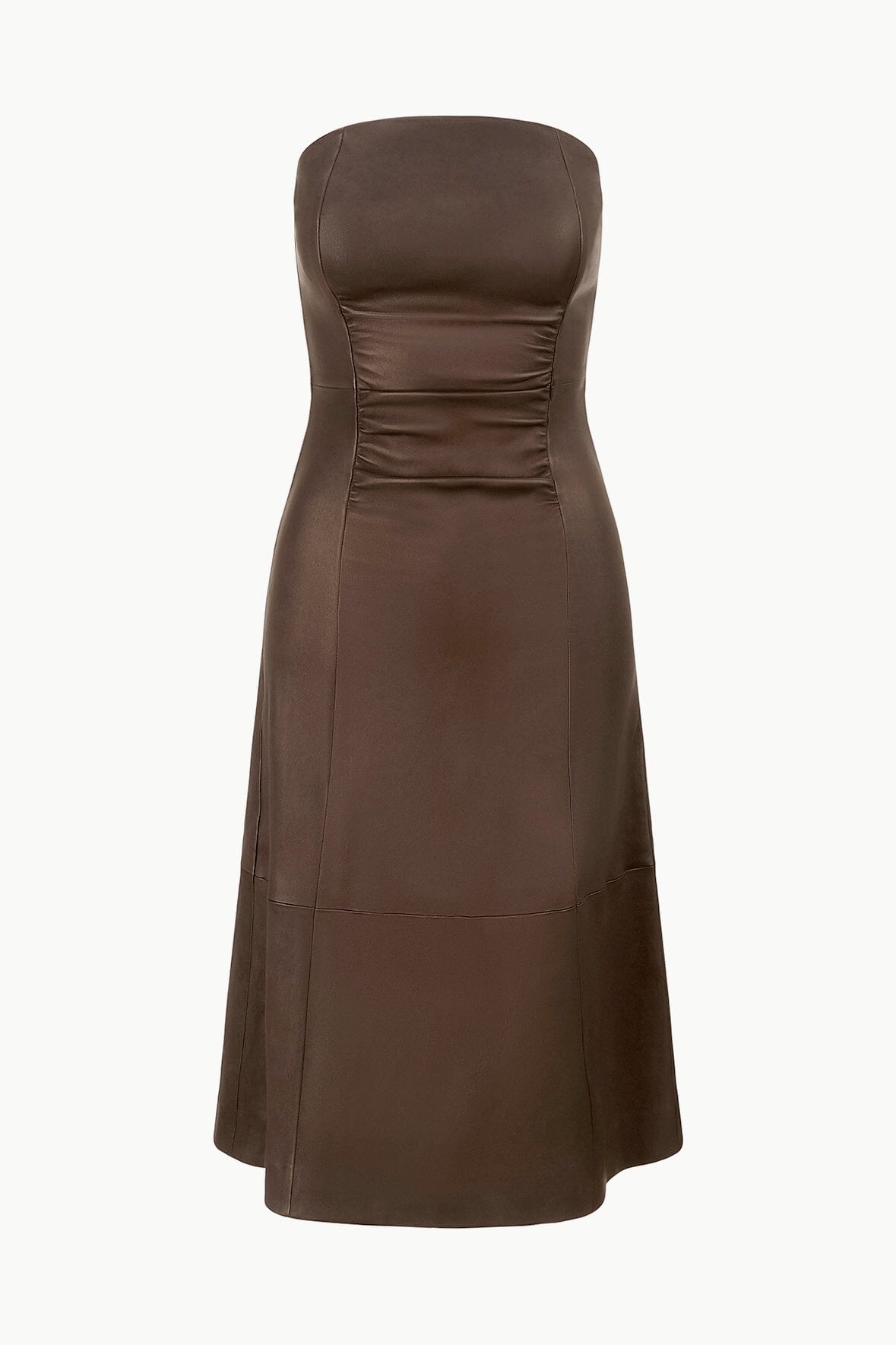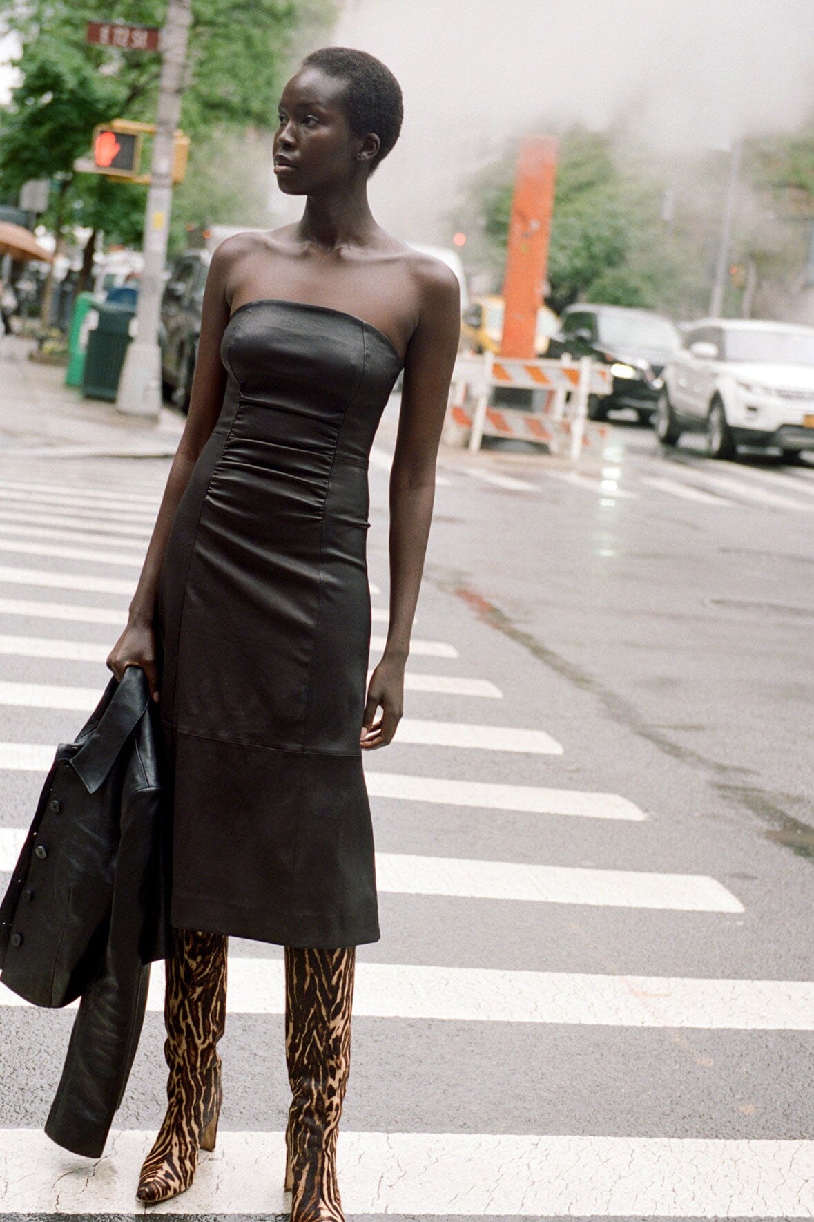 A strapless dress crafted from a soft, stretch nappa leather. The Bowery features gathering through the bodice and an a-line skirt.