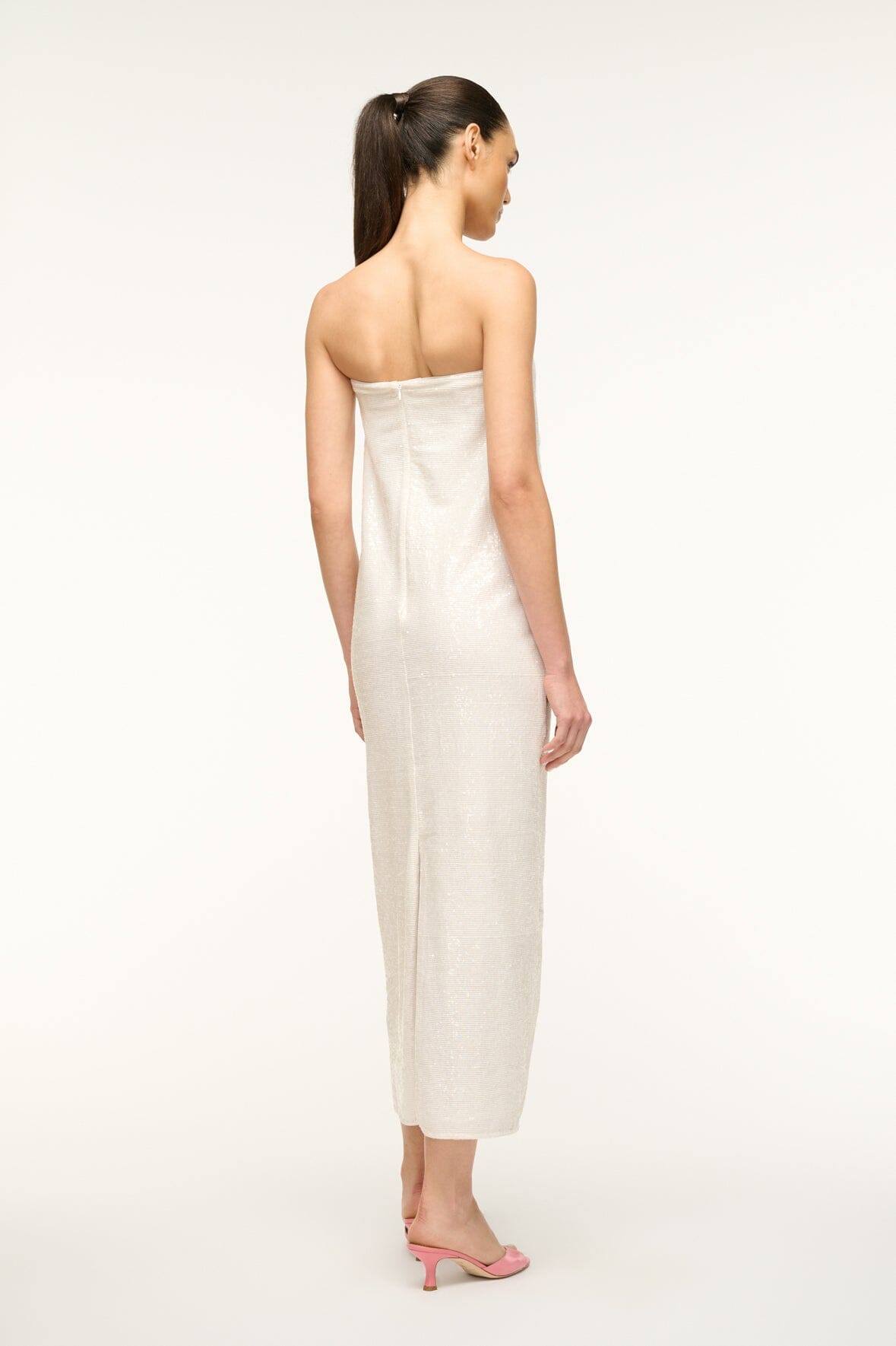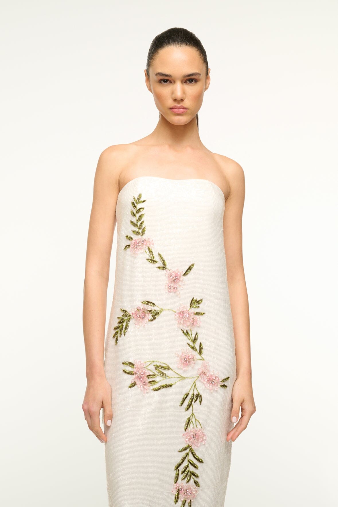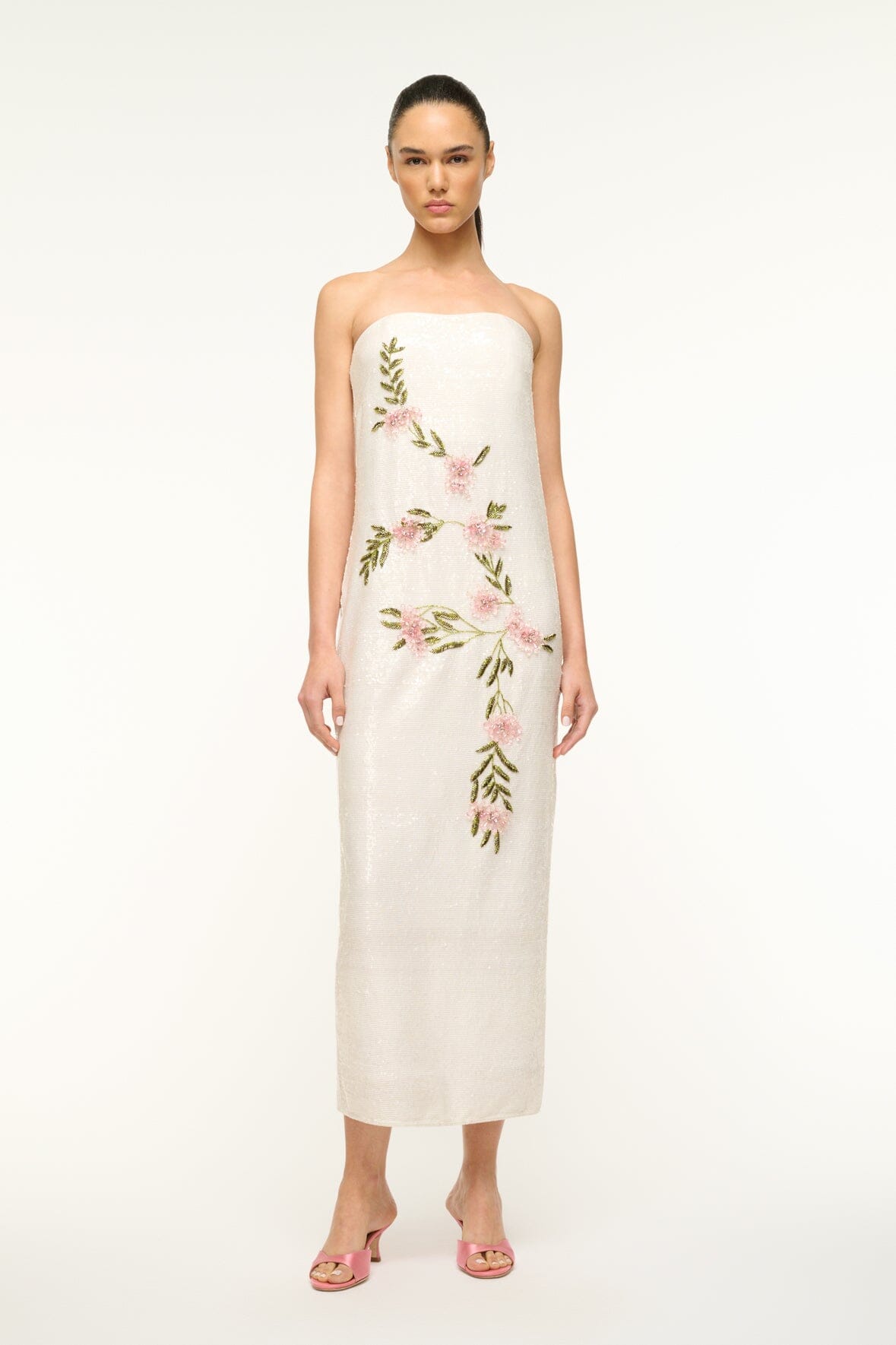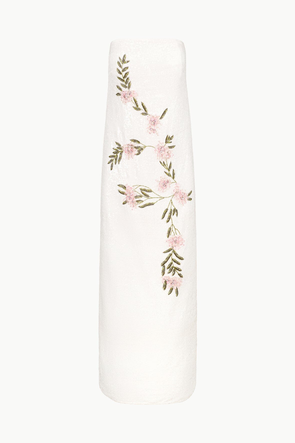 Our sequined Casey Dress has been updated for the season with a beaded floral motif across the bodice. It features a relaxed silhouette throughout the body, a back slit, and a hidden zipper.