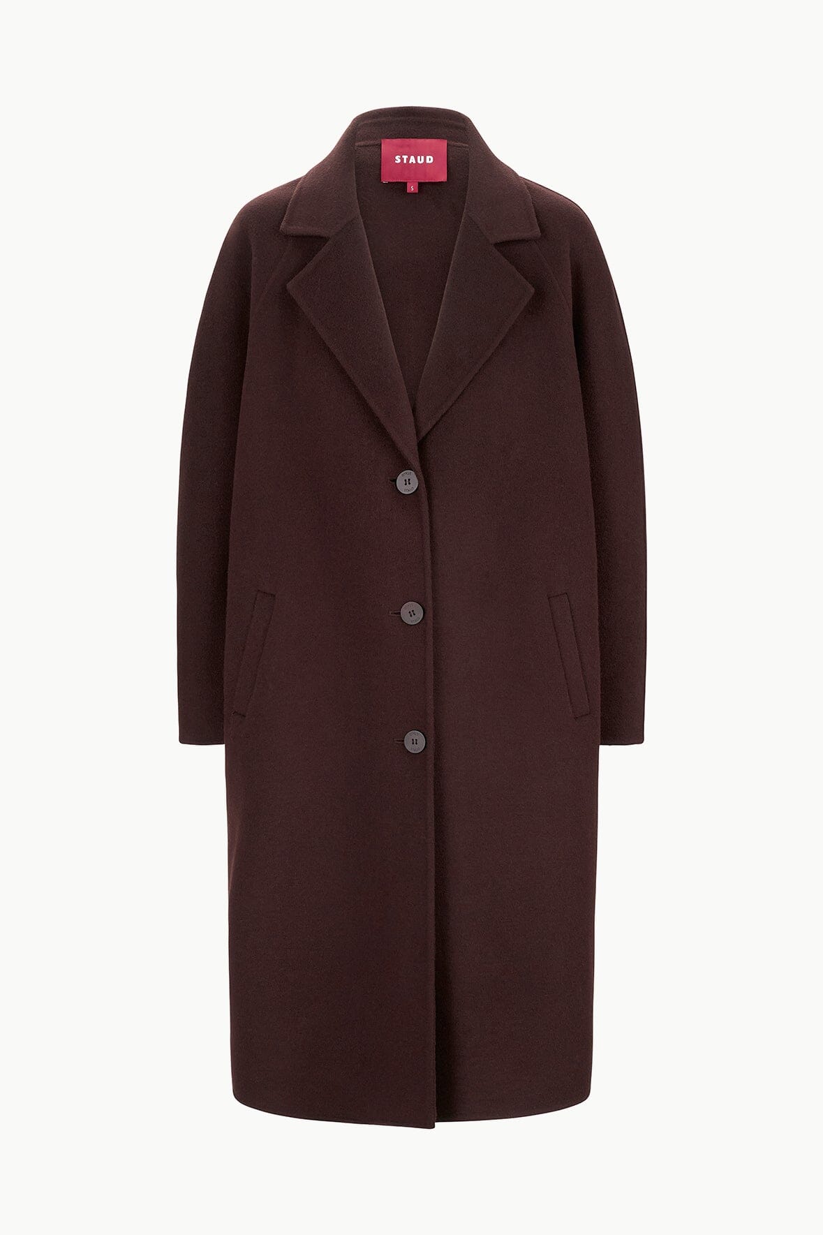 The Chrysalis Coat is a wool cocoon coat with a center front button closure, notched collar and raglan sleeves.