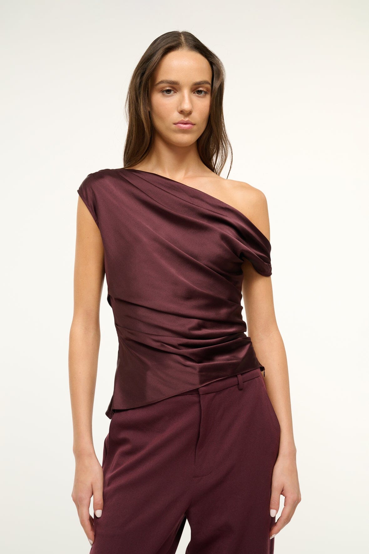 An off-the-shoulder top crafted from a silk satin fabric that offers some stretch for added ease. The Phare Top features a drapey yet fitted silhouette for any occasion.