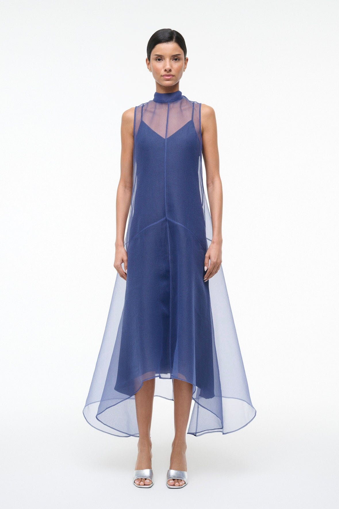 The Auden Dress is an effortless A-line midi dress in navy with a sheer organza overlay and mock neckline. Sleeveless design with a dramatic high-low hem and built-in slip for easy layering. Perfect for transitional dressing with understated elegance.