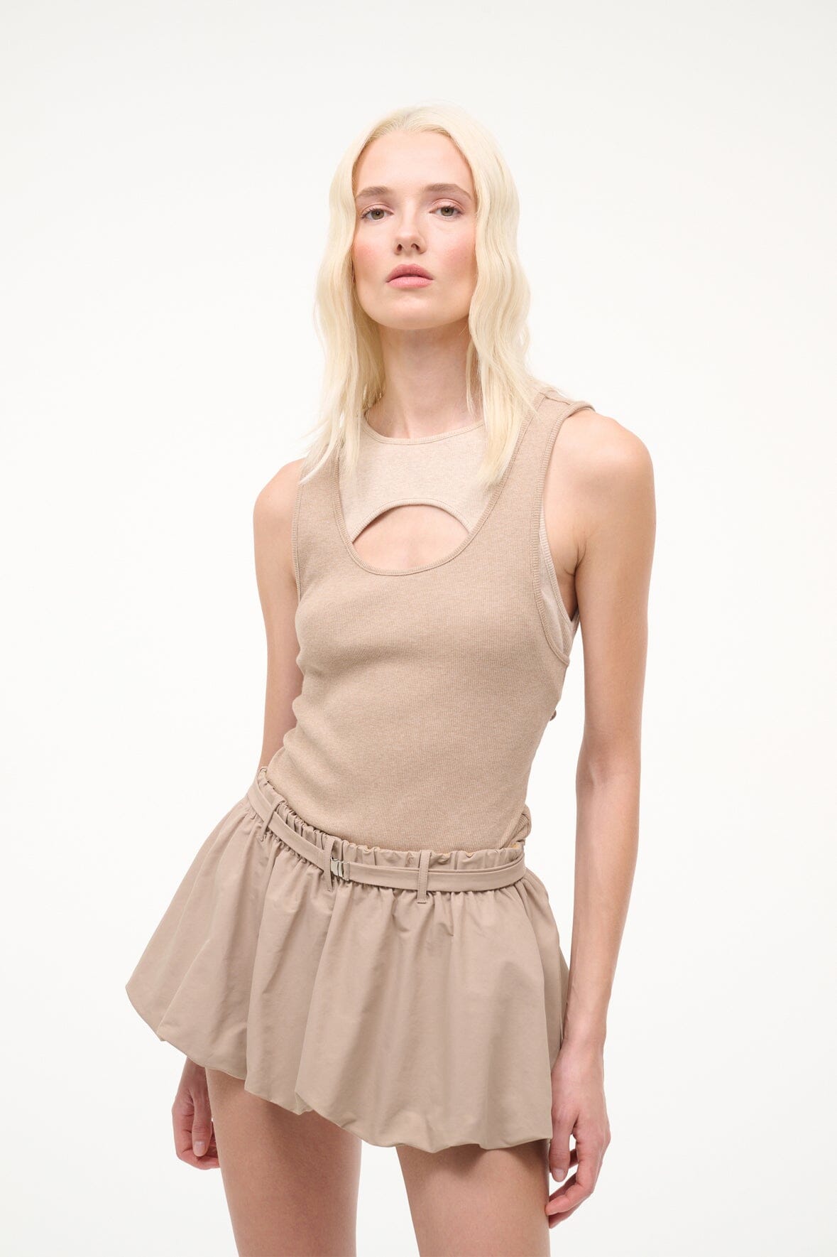 A sporty two-tone layered rib knit tank with a sleek neckline opening. The connected design delivers a modern silhouette perfect for active wear and everyday styling.