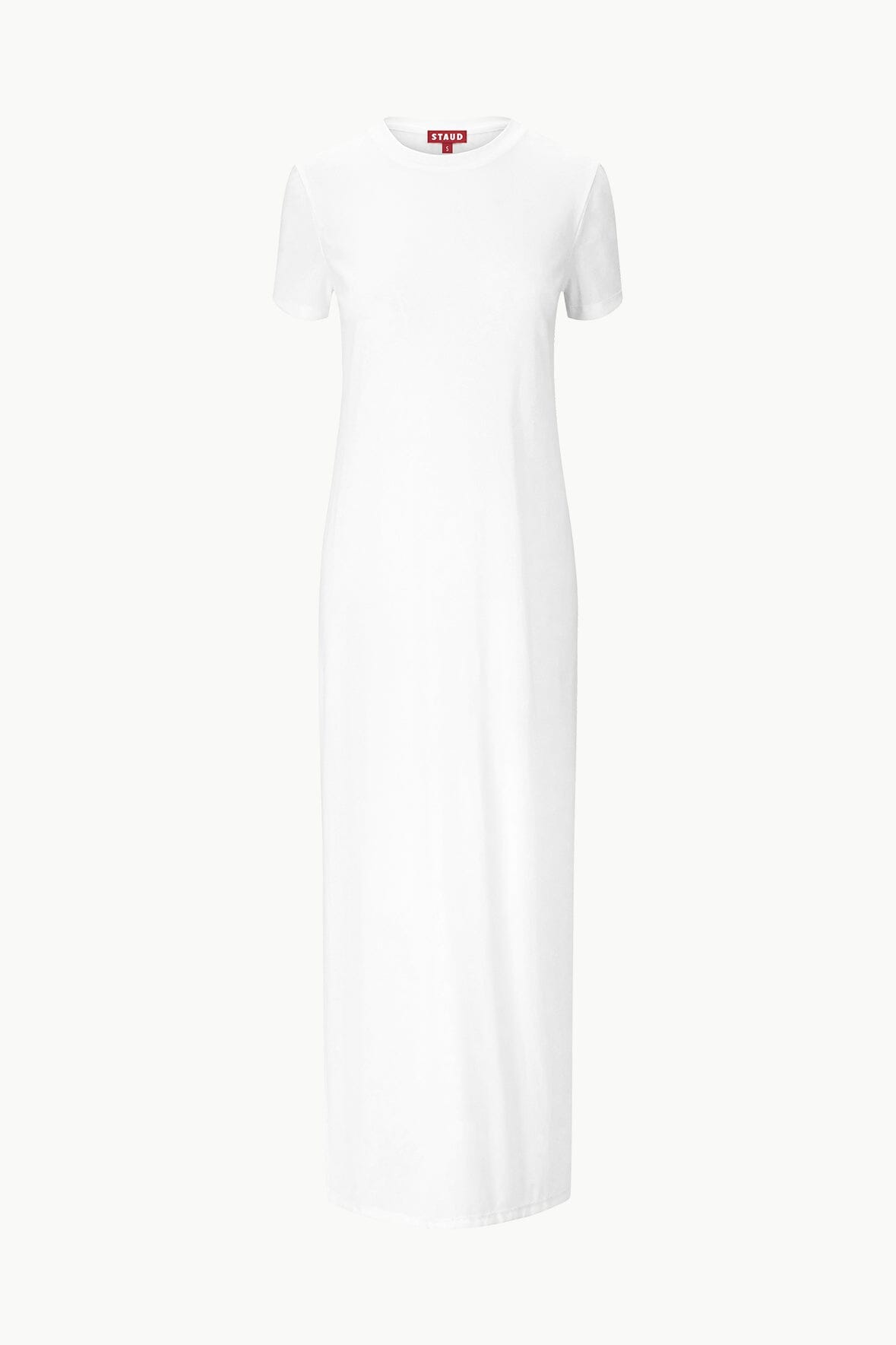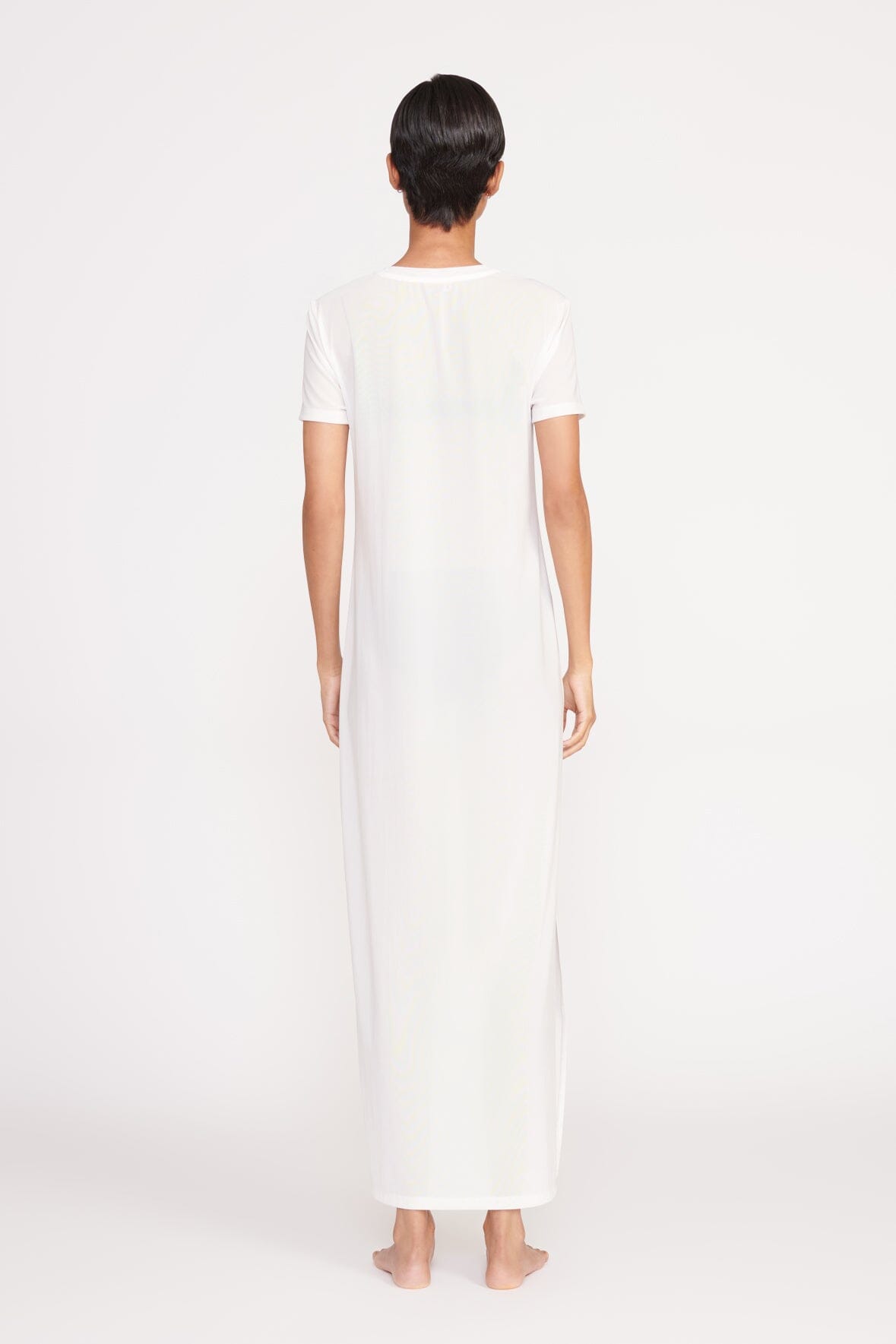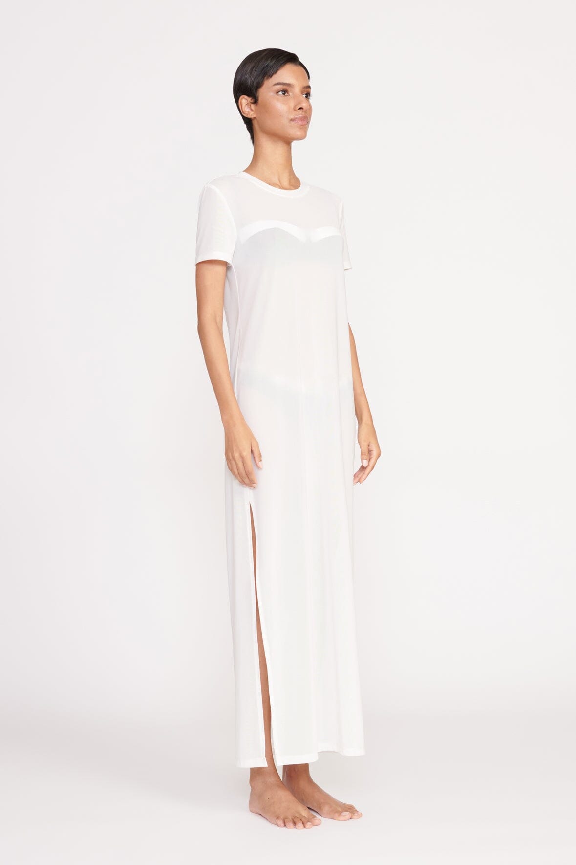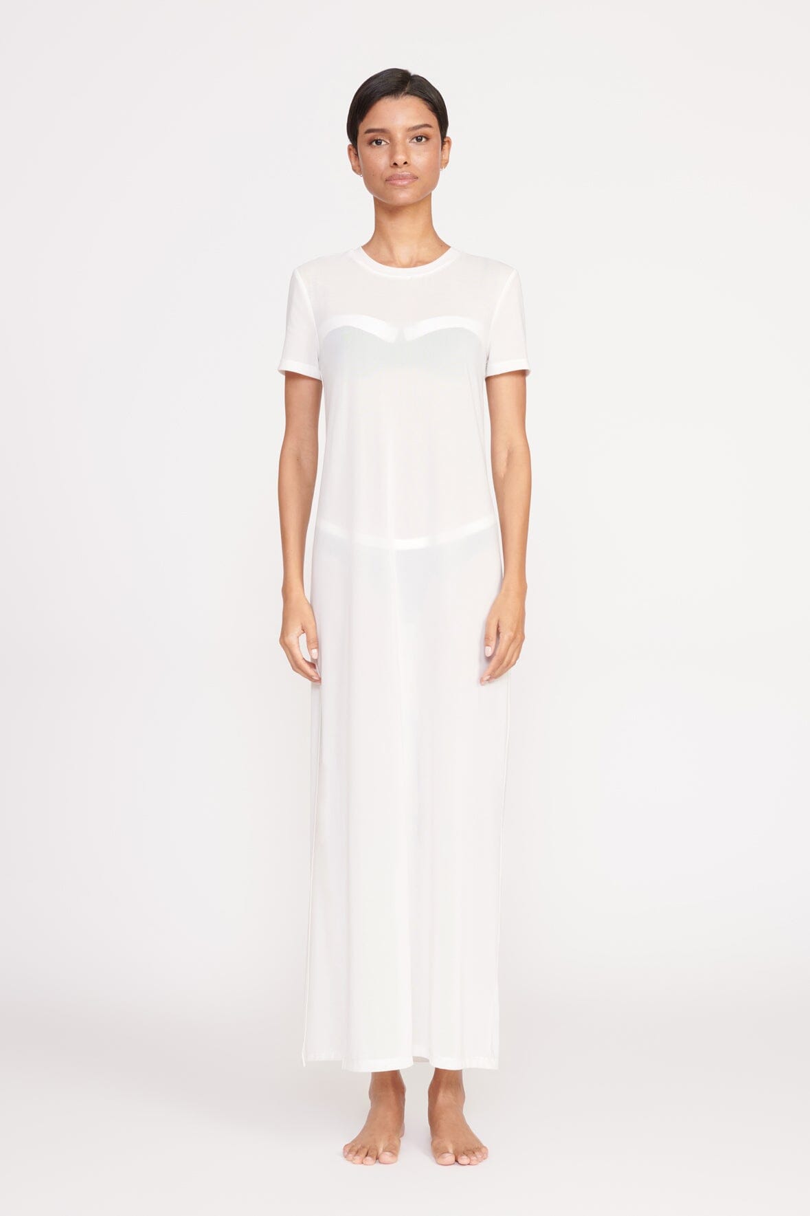 The Ottilie Dress is a maxi t-shirt style swim coverup in our stretchy power mesh fabric. This style is slightly sheer and features a crewneck and short sleeves and pairs well with STAUD SEA swimwear.