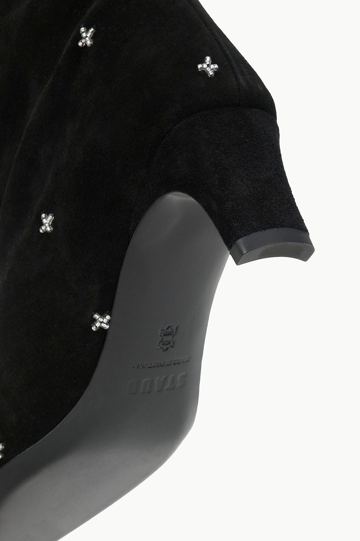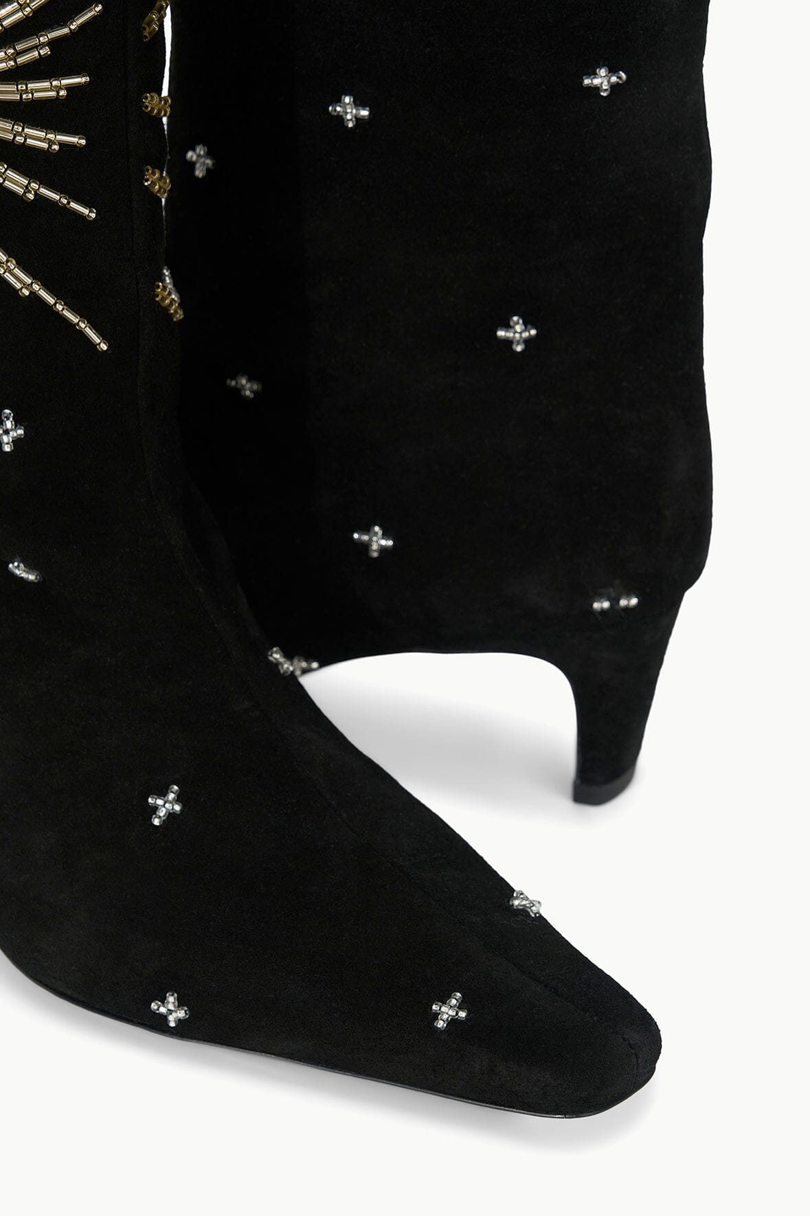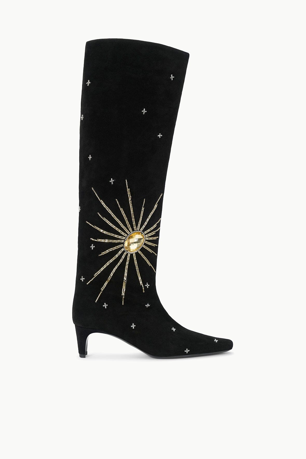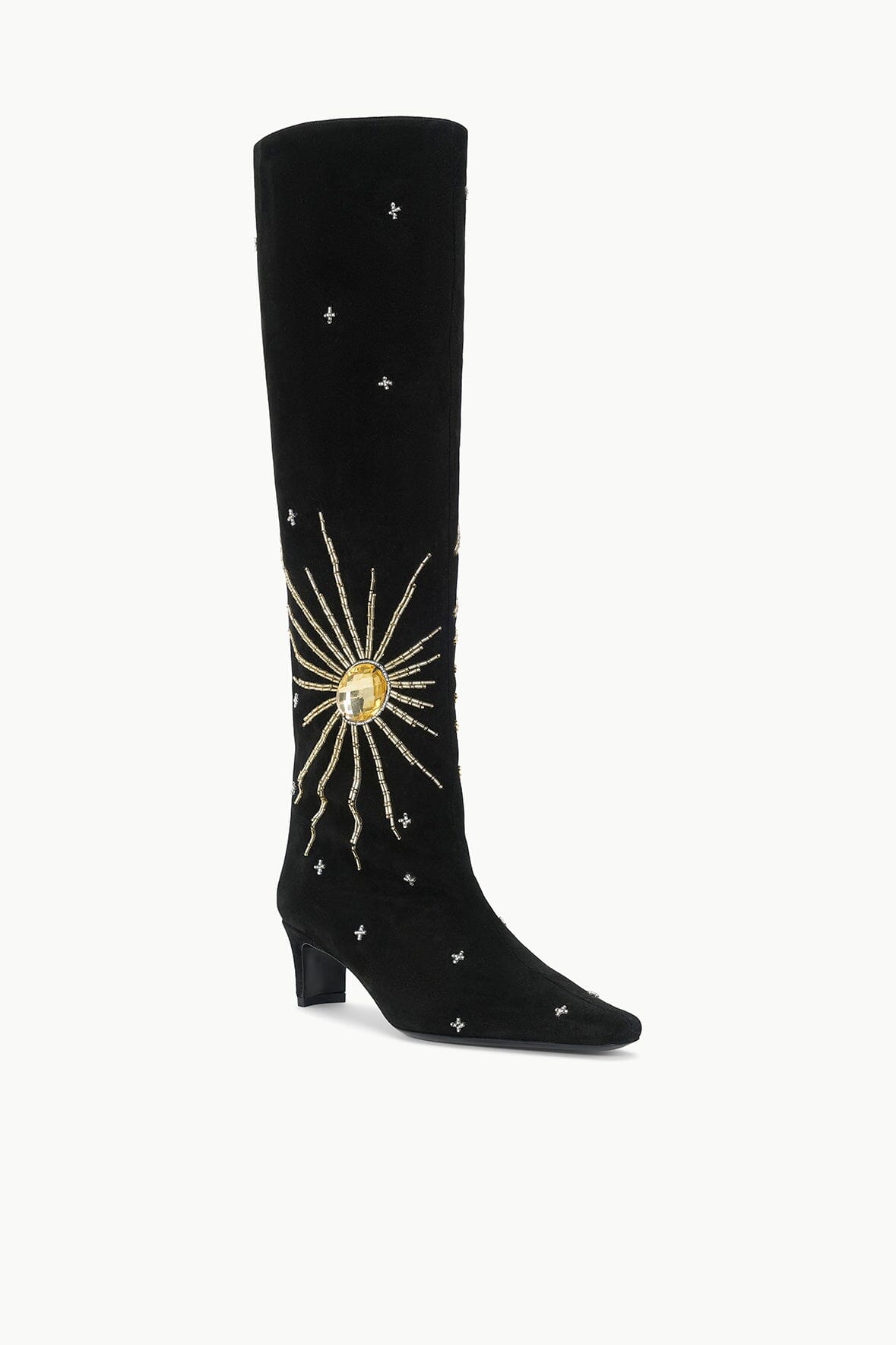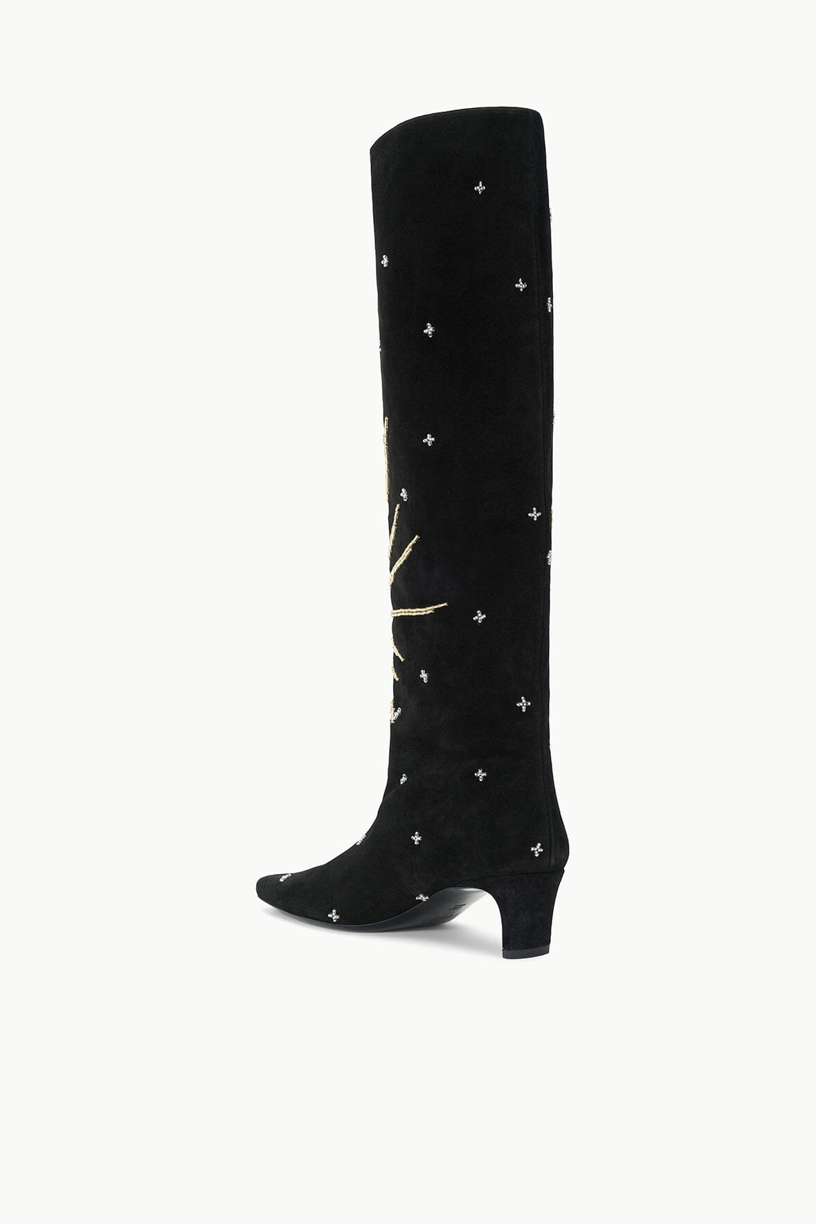 The Wally is a slouchy, suede knee-high boot featuring a pointed toe and a slim heel design. Updated with an allover celestial inspired beading motif.