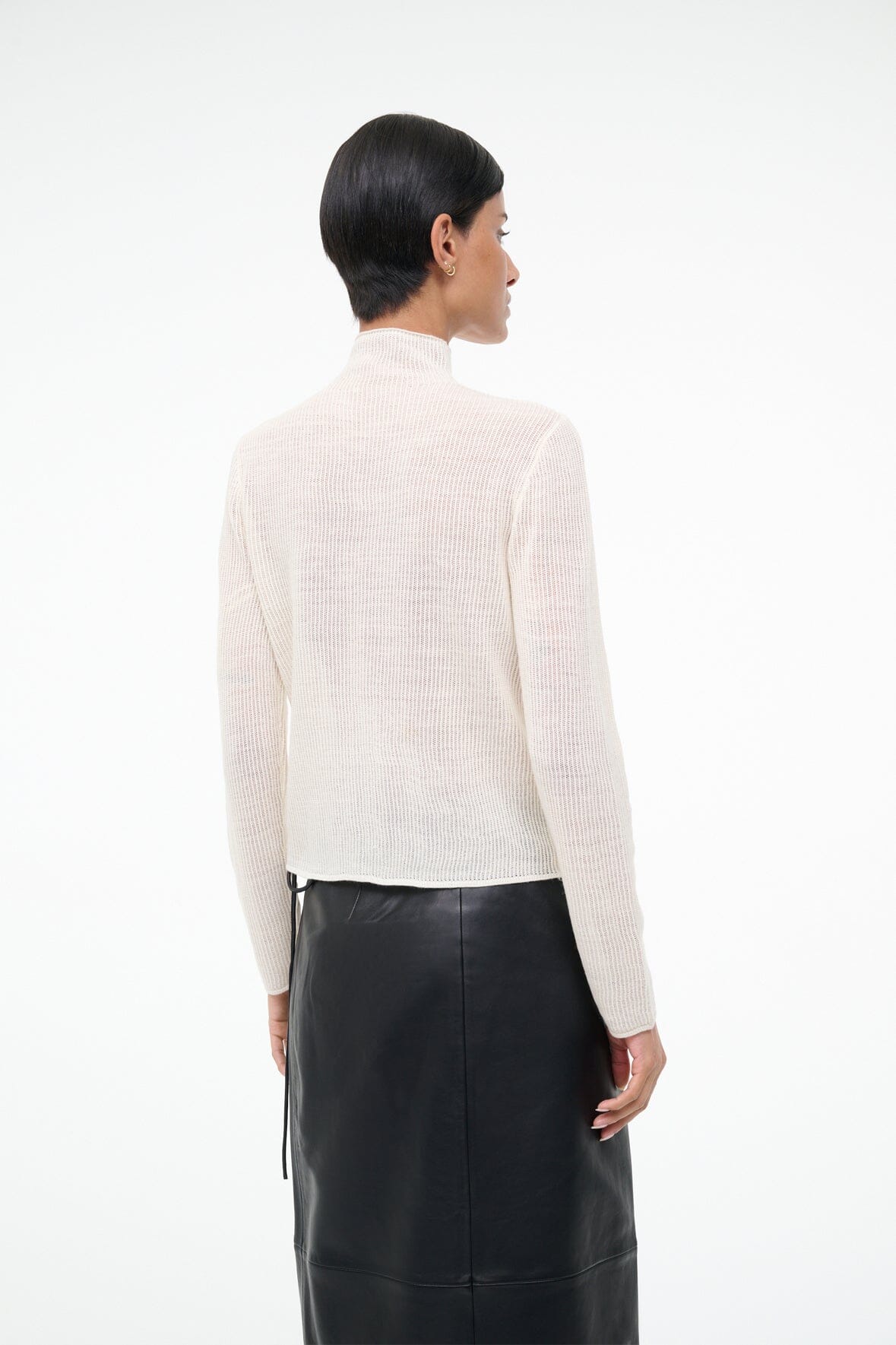 A fitted mock neck cardigan in a semi-sheer knit with full front button closures. Style it traditionally or reverse it for a unique look with buttons positioned at the back. The Marianne is a versatile layering piece that works both ways.