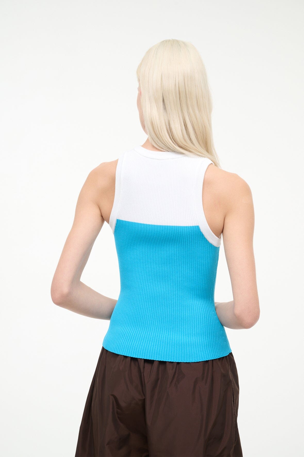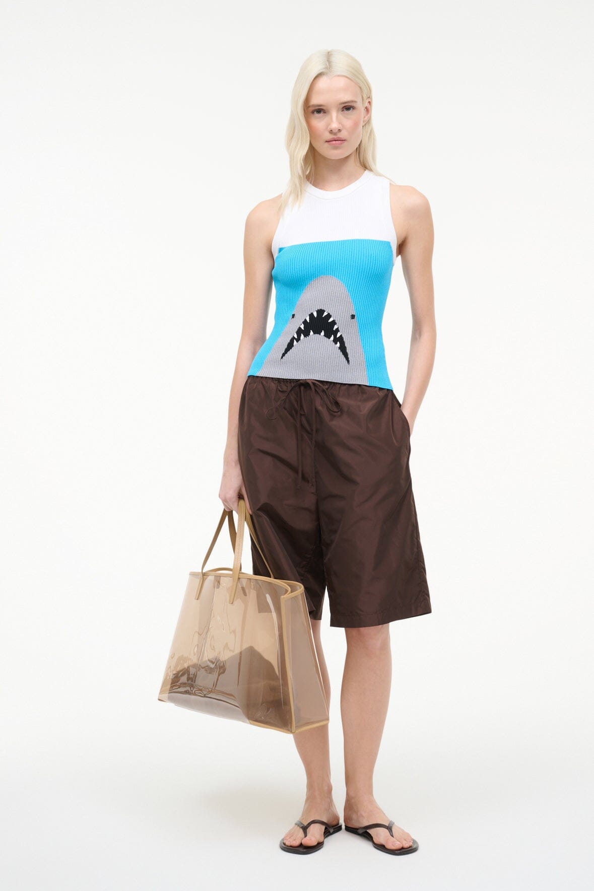 The Malia Tank in Great White features a bold ocean motif on a compact knit base. The high neckline provides coverage and structure while maintaining a sleek silhouette.