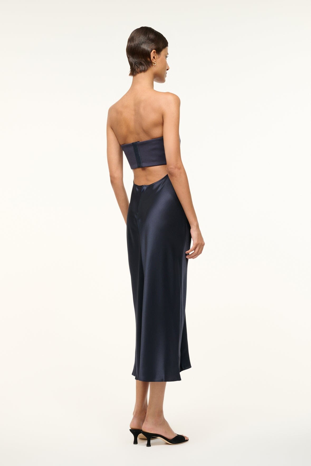 An update to our timeless Wayfaring Dress, the Midi Wayfaring Dress is a midi length evening dress with a ponte bodice and a ruched satin skirt. This strapless dress features a strapless bra-friendly bodice, with an open lower back.