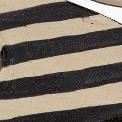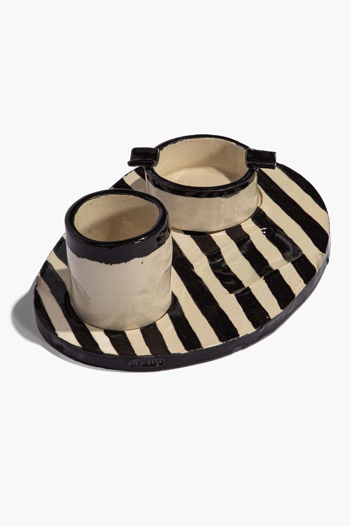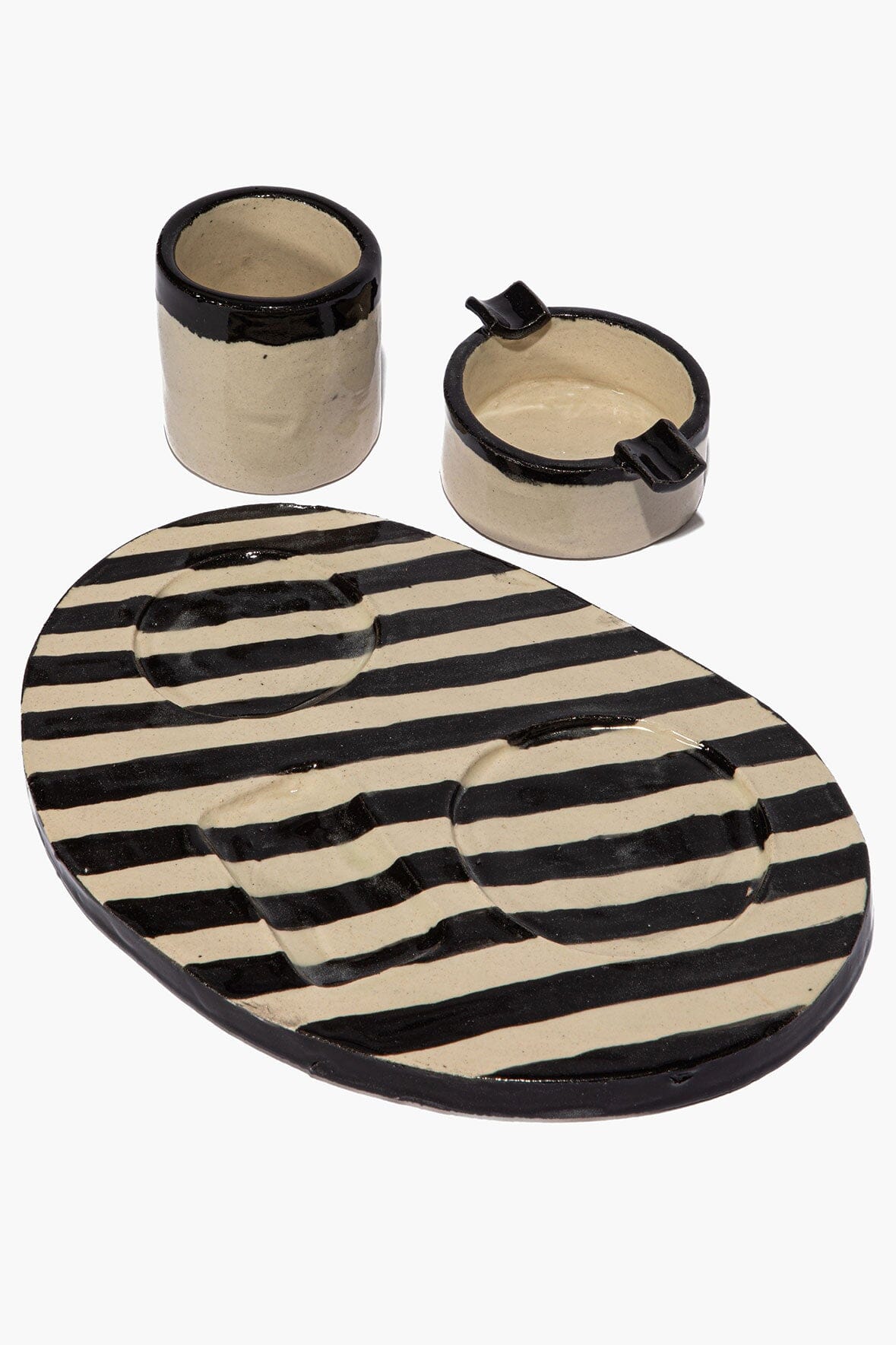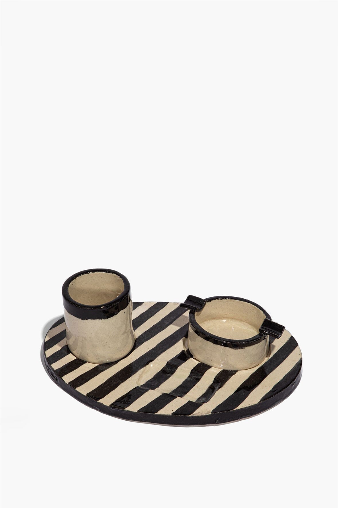 A ceramic tray in a high-contrast onyx and ivory stripe, finished in a lacquered glaze that amplifies the graphic effect. Designed with built-in rests for an ashtray, cup, and lighter, everything has its place.