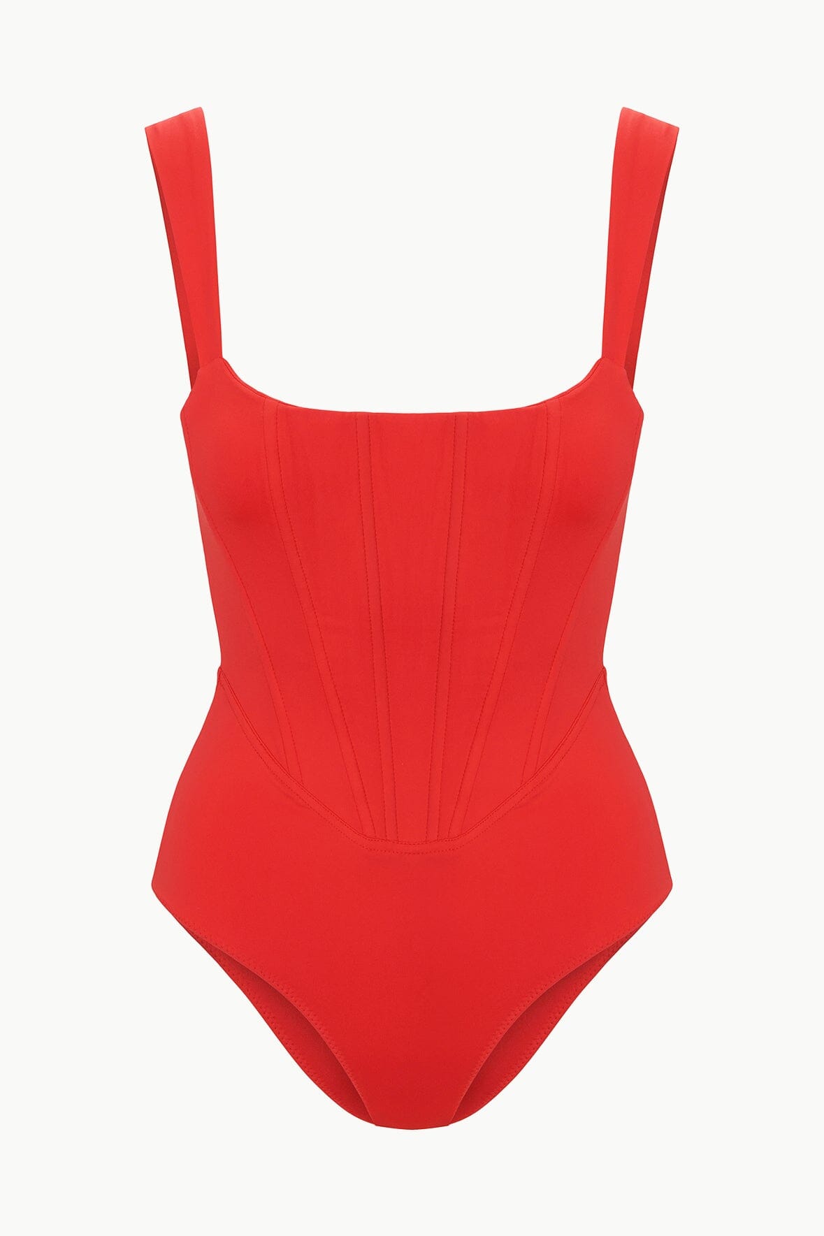 The Adelaide is a new one piece swimsuit with corset-style boning throughout the chest and torso. This style features zipper at the back and supportive shoulder straps.