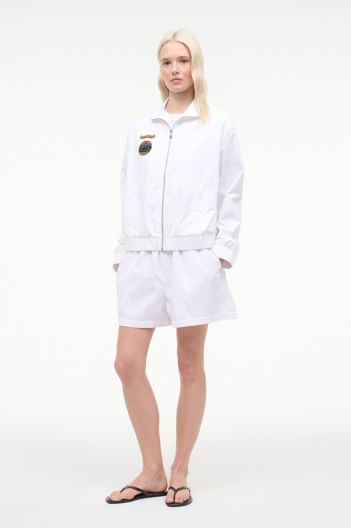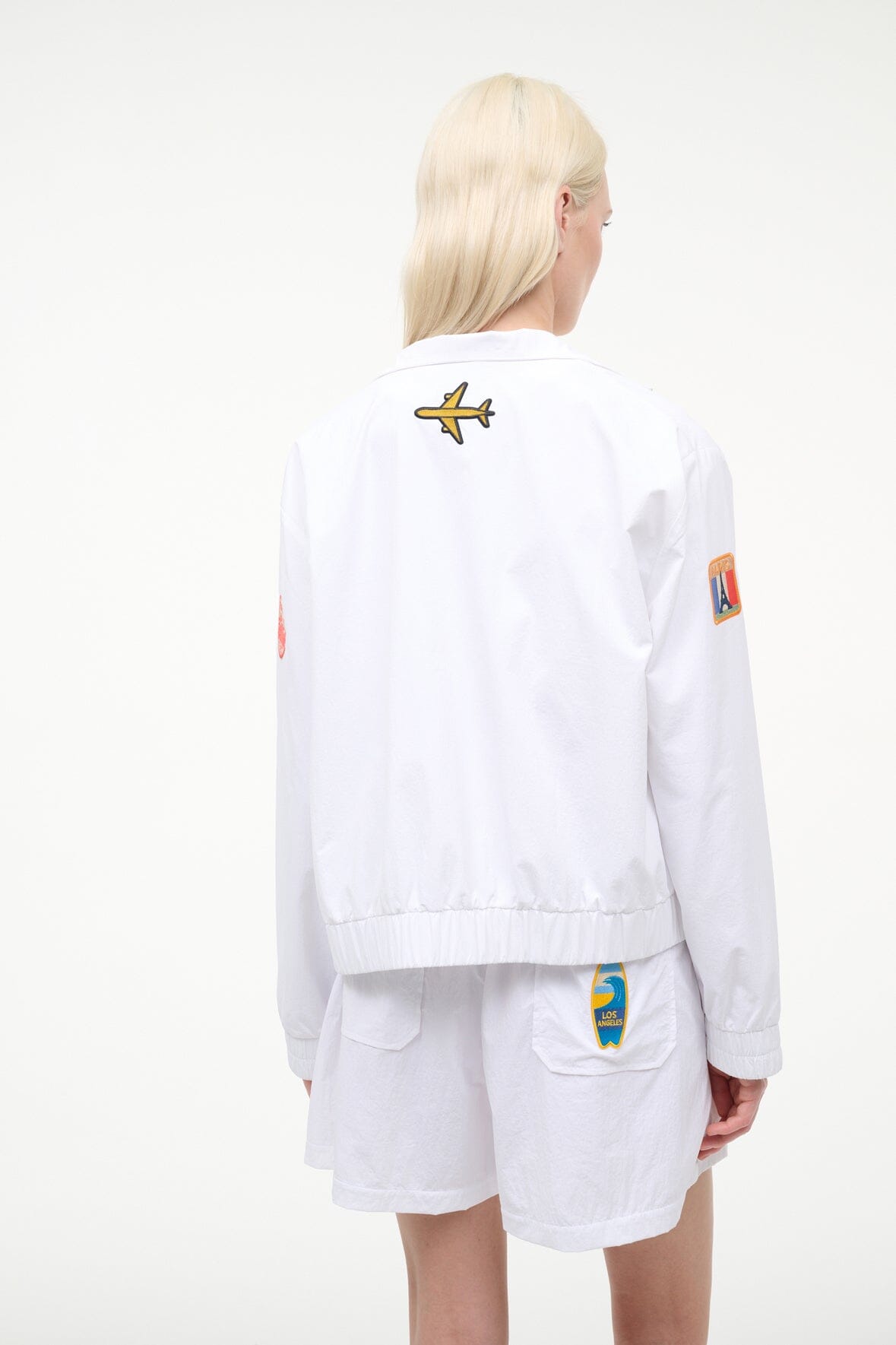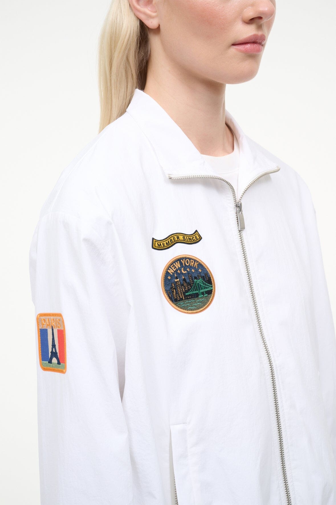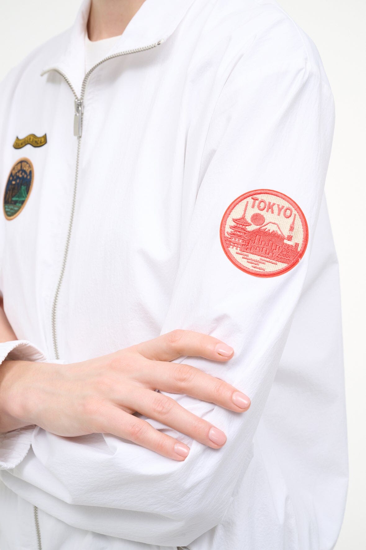 The Arrival Jacket in crisp white features distinctive travel-inspired patches that celebrate global adventure. Designed to coordinate effortlessly with the matching shorts, as part of our exclusive American Express capsule. Ideal for travelers who appreciate thoughtful, intentional fashion.